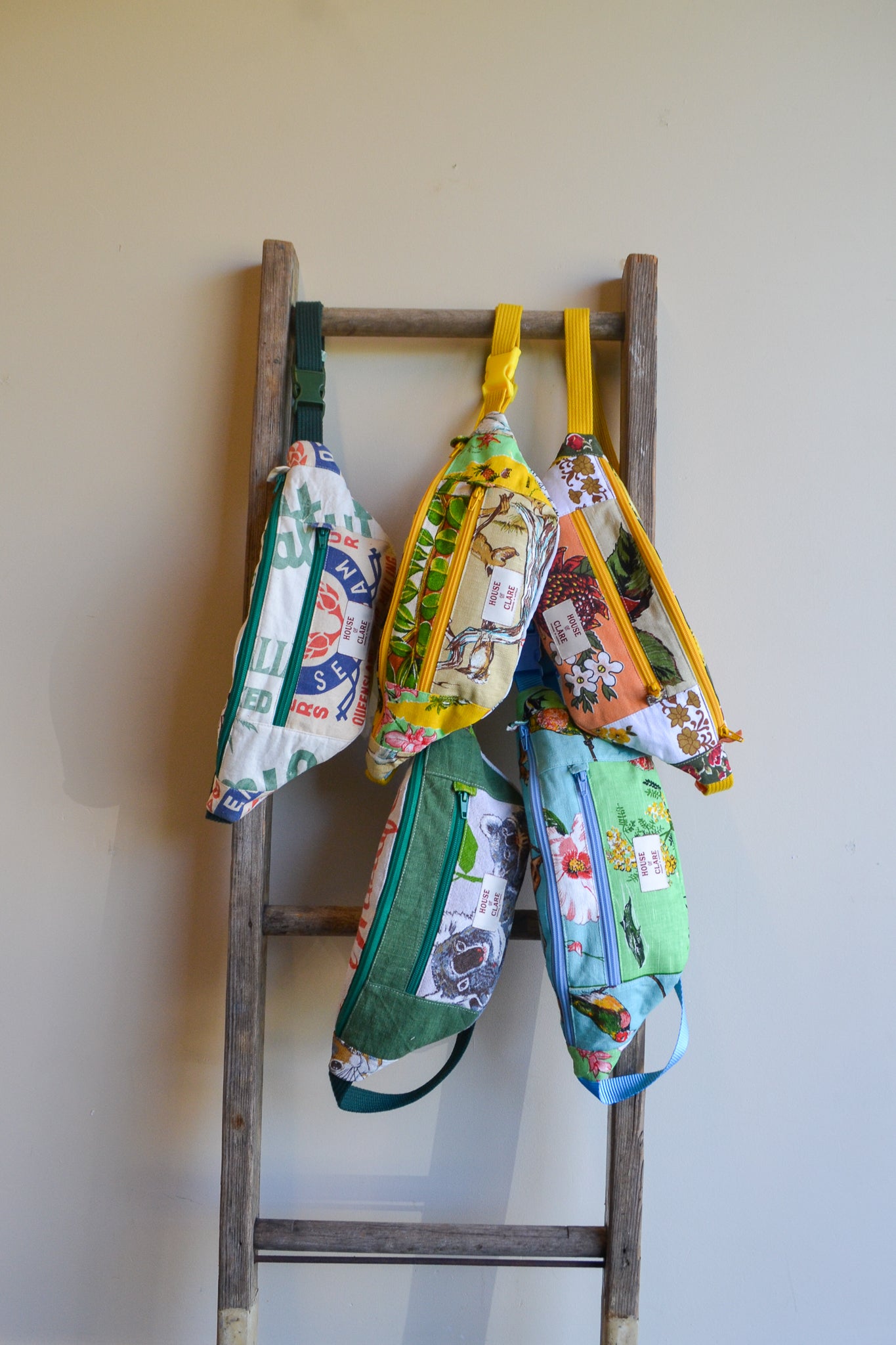 One-of-a-kind, limited batch of 5, handmade from cotton/linen off cuts with a sturdy buckle, adjustable strap, 2 zip openings & inner pocket