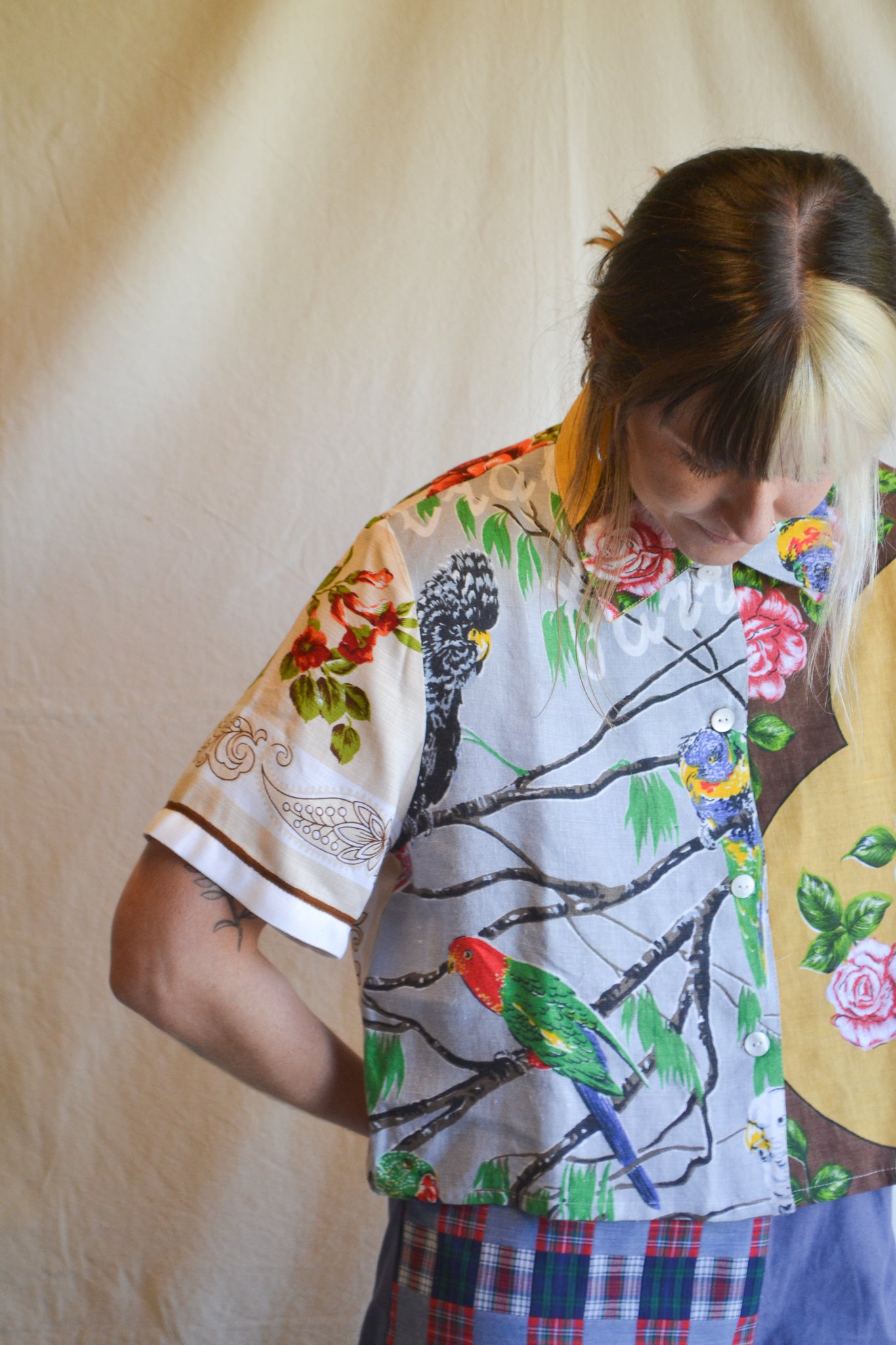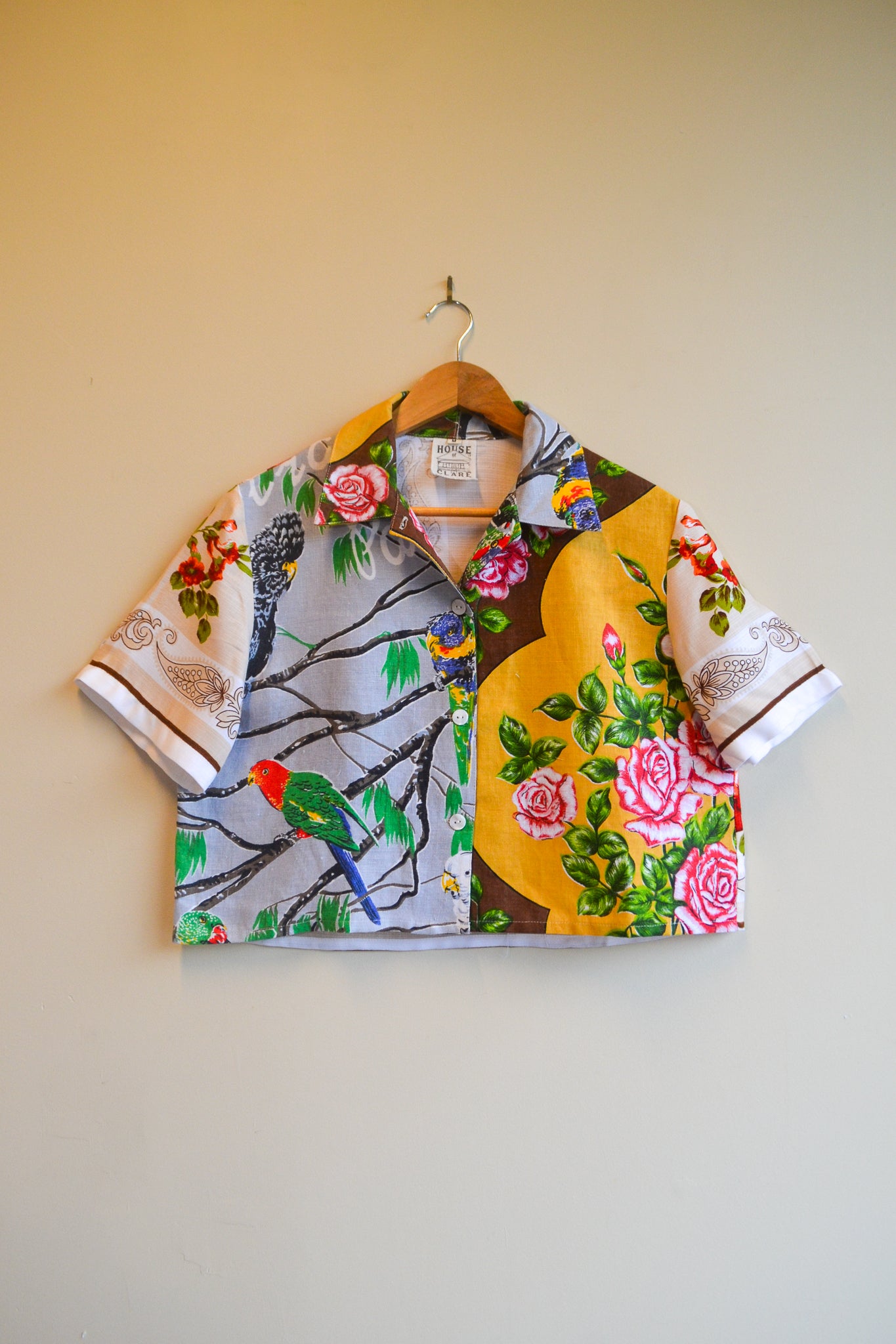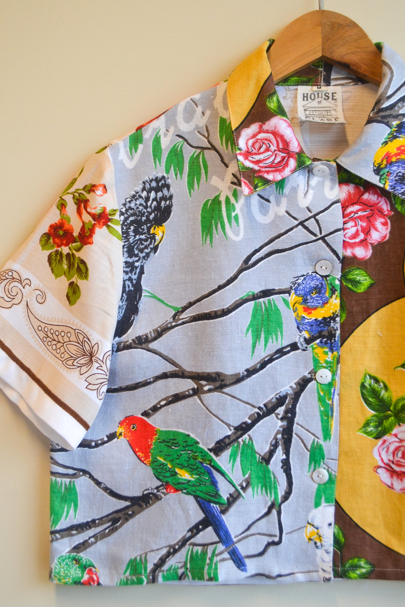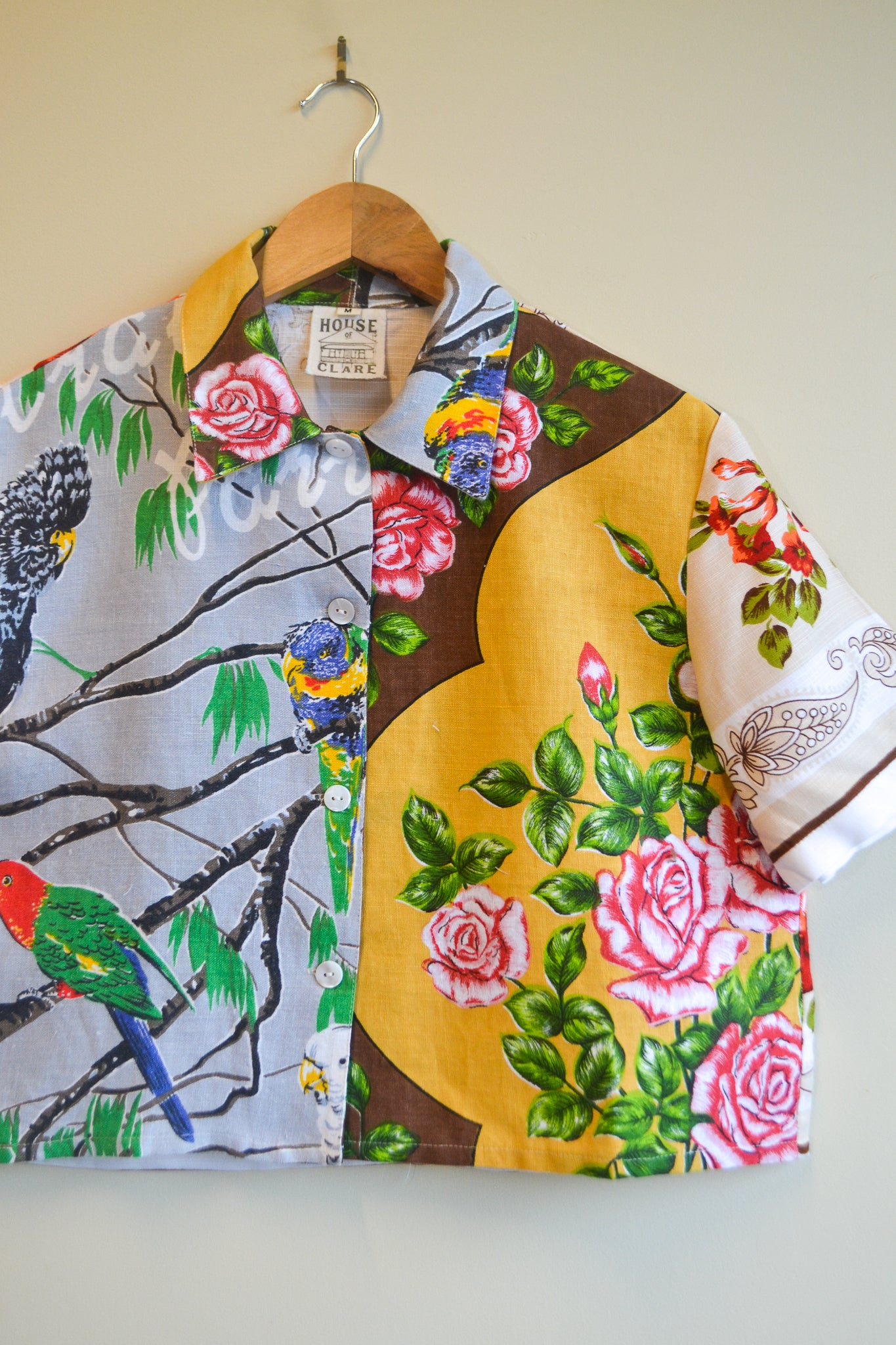 Looking for a stand-out statement piece? Well look no further, our Cheery Button-Up Shirt is a one-of-a-kind, wearable art piece, crafted from 2 beautifully preserved vintage linen tea towels and table cloth.