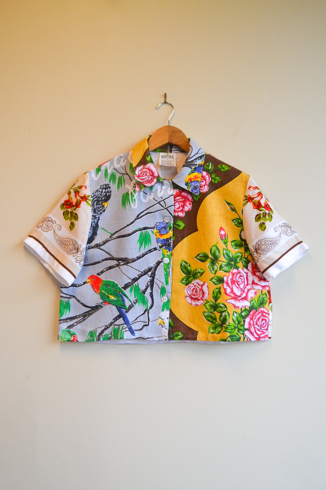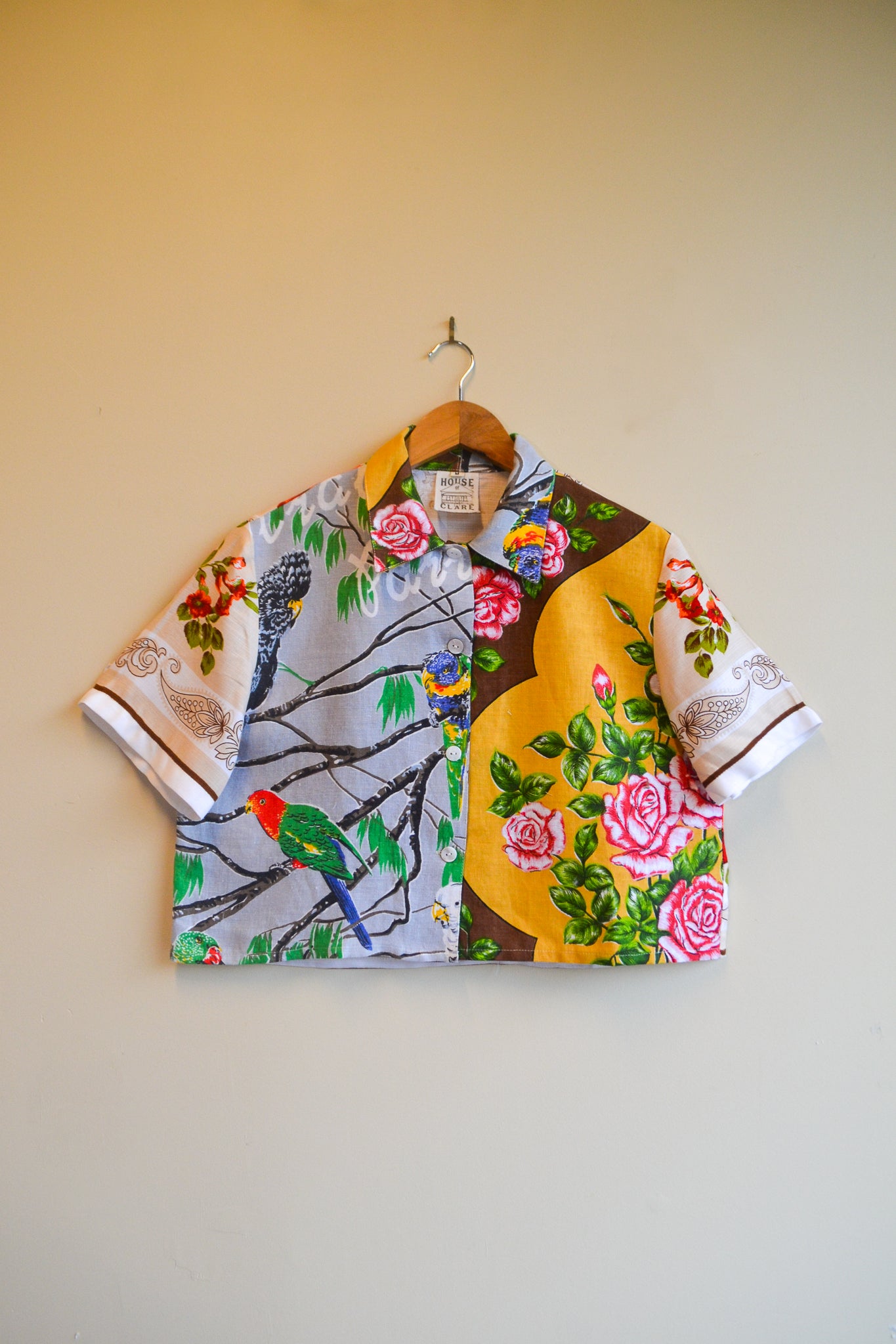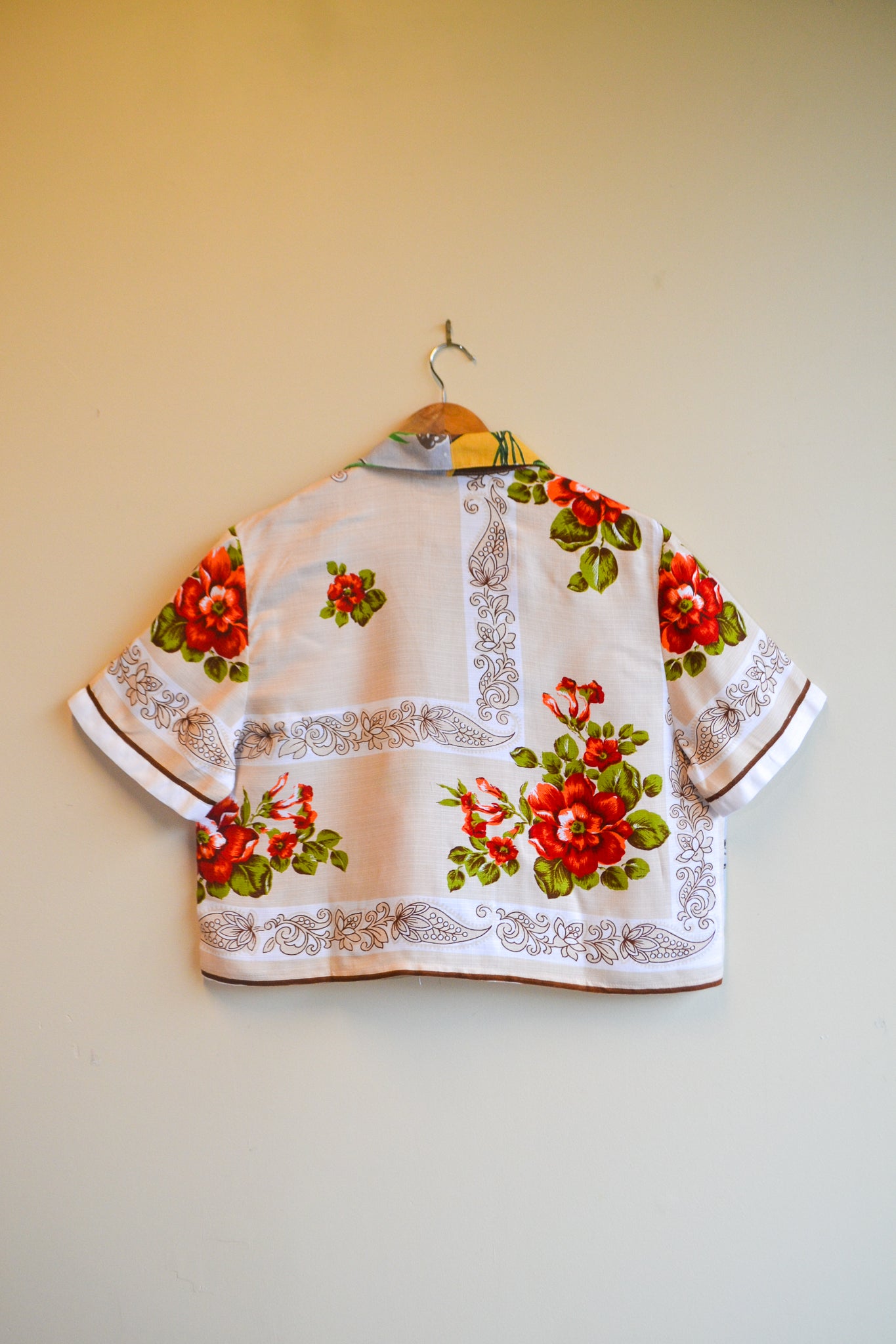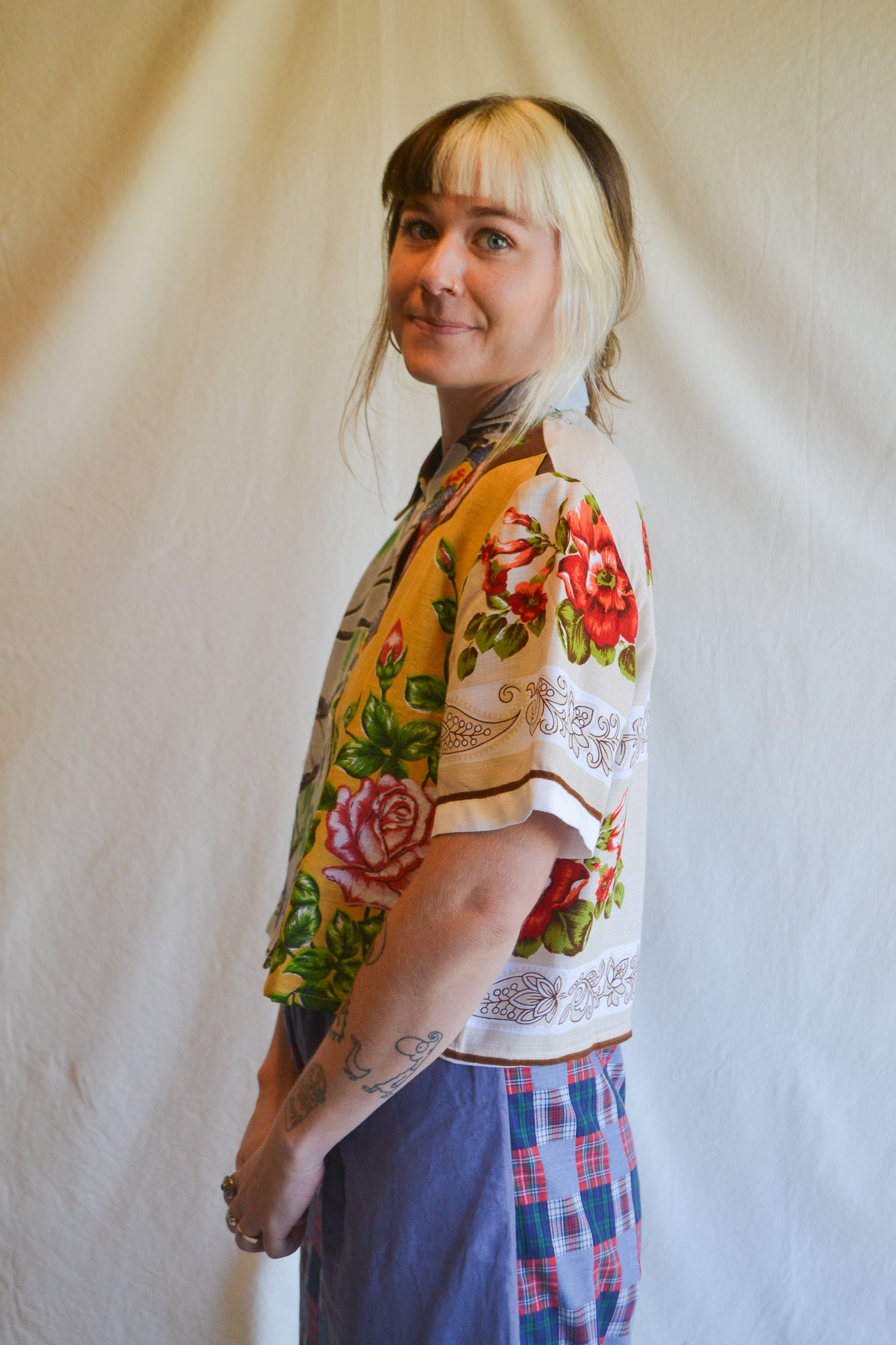 Looking for a stand-out statement piece? Well look no further, our Cheery Button-Up Shirt is a one-of-a-kind, wearable art piece, crafted from 2 beautifully preserved vintage linen tea towels and table cloth.