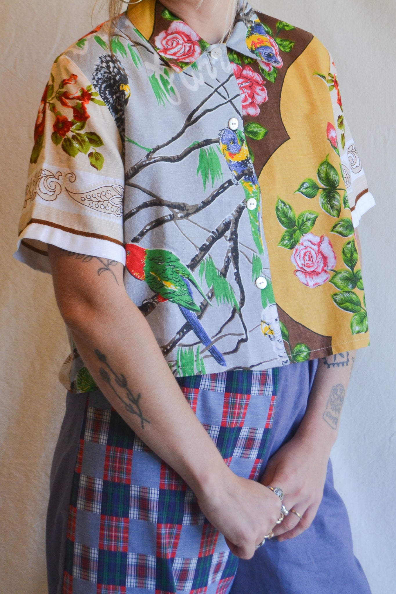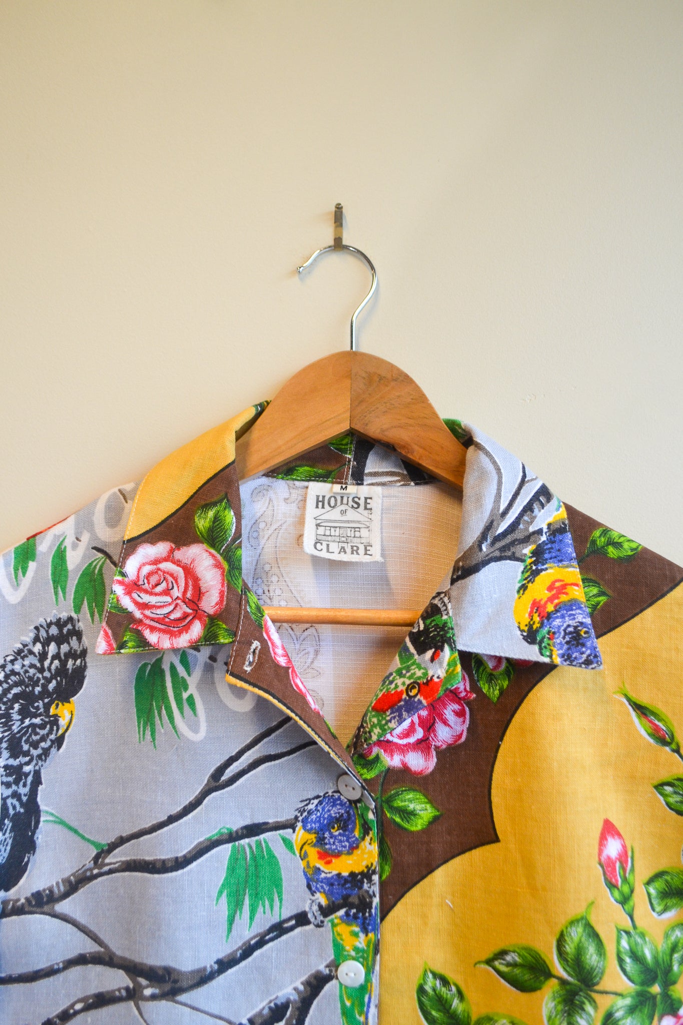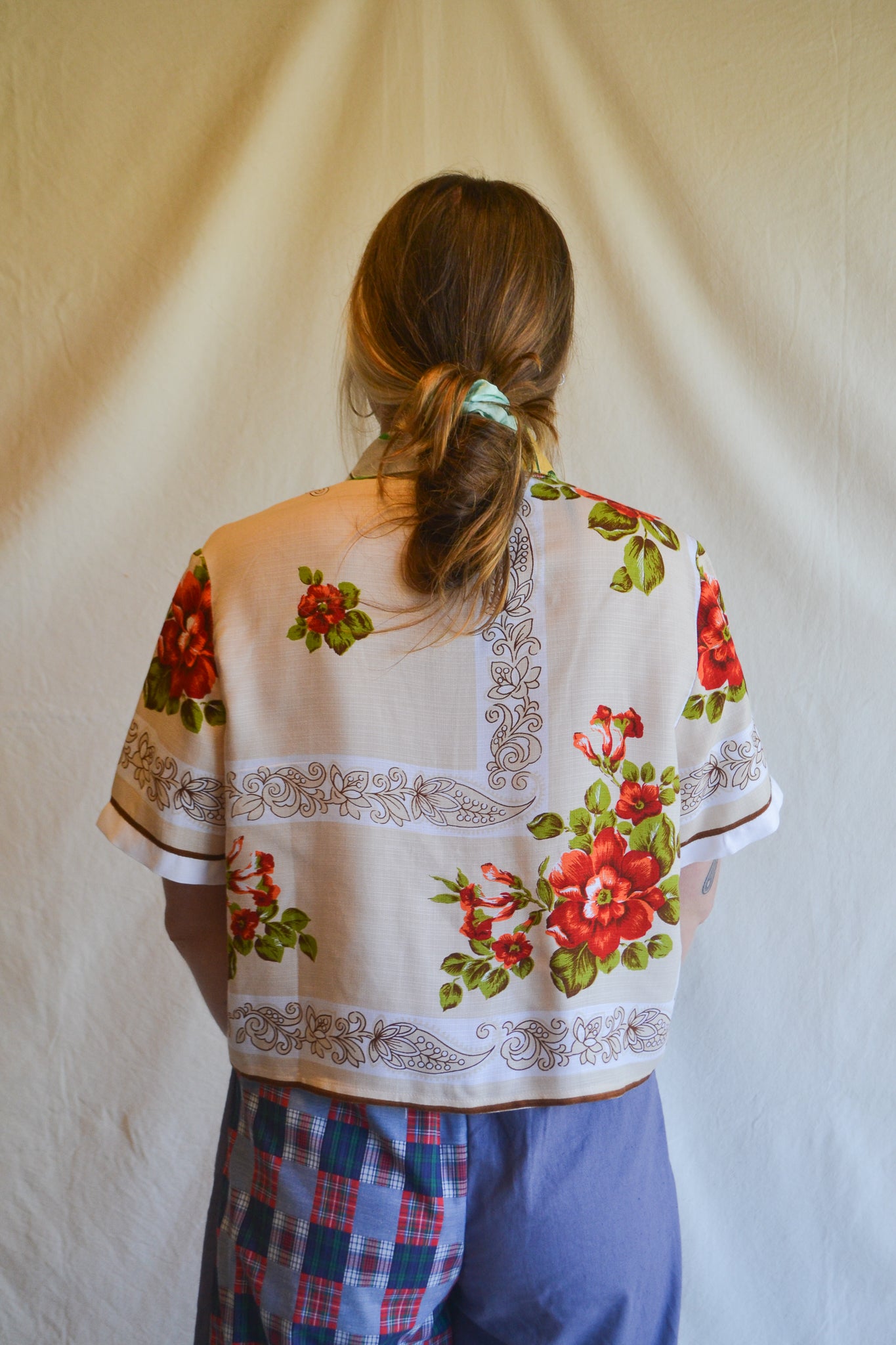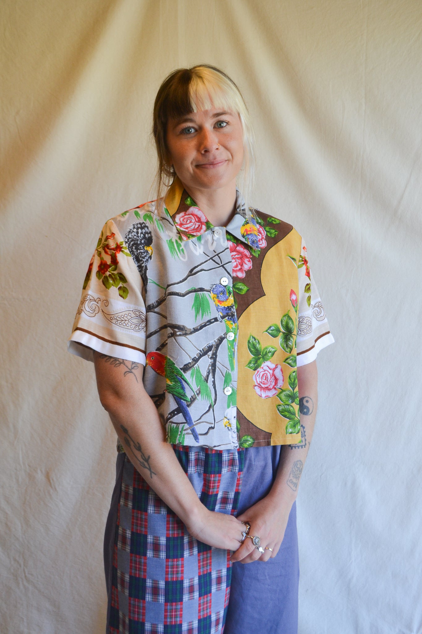 Looking for a stand-out statement piece? Well look no further, our Cheery Button-Up Shirt is a one-of-a-kind, wearable art piece, crafted from 2 beautifully preserved vintage linen tea towels and table cloth.