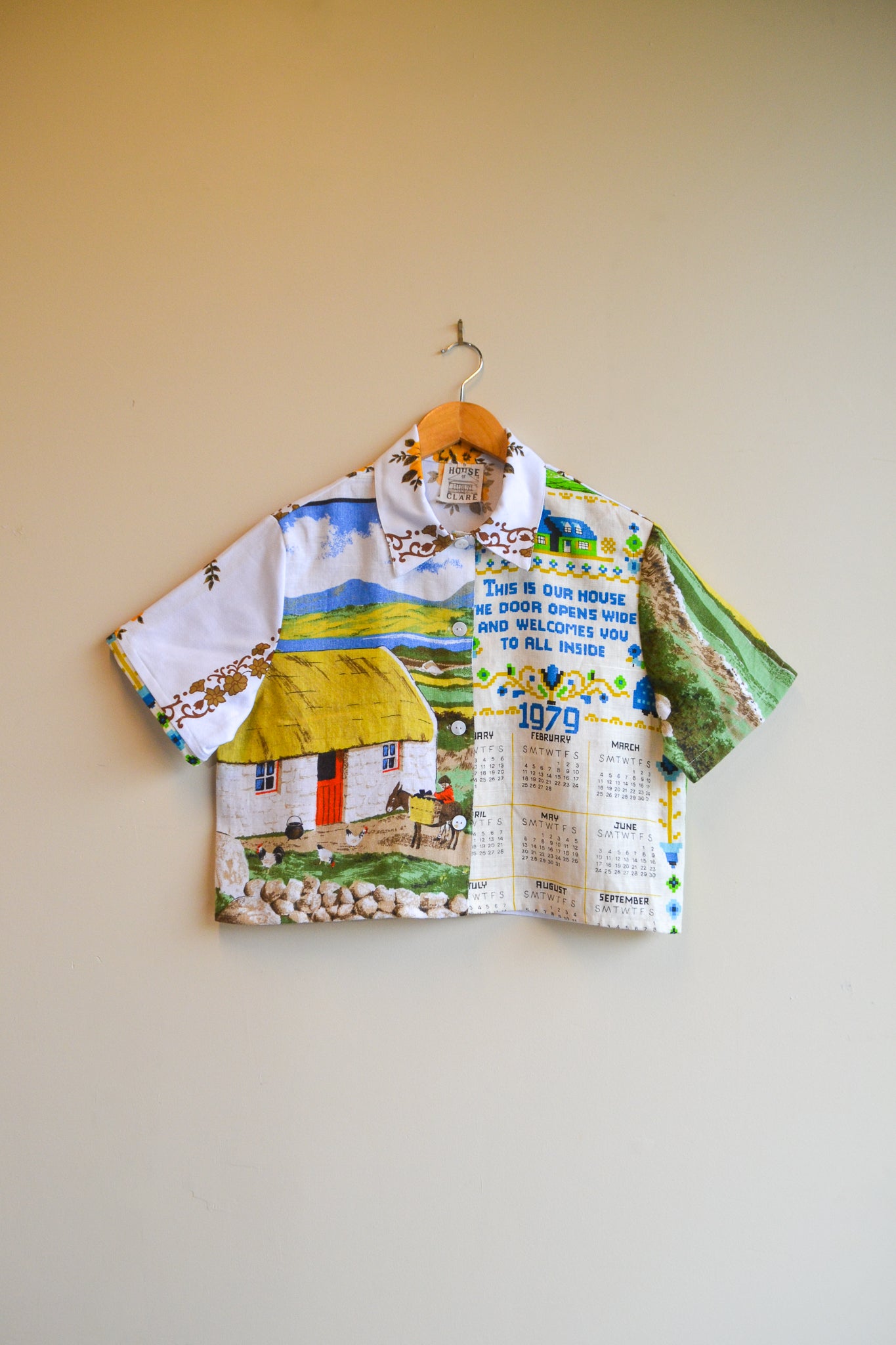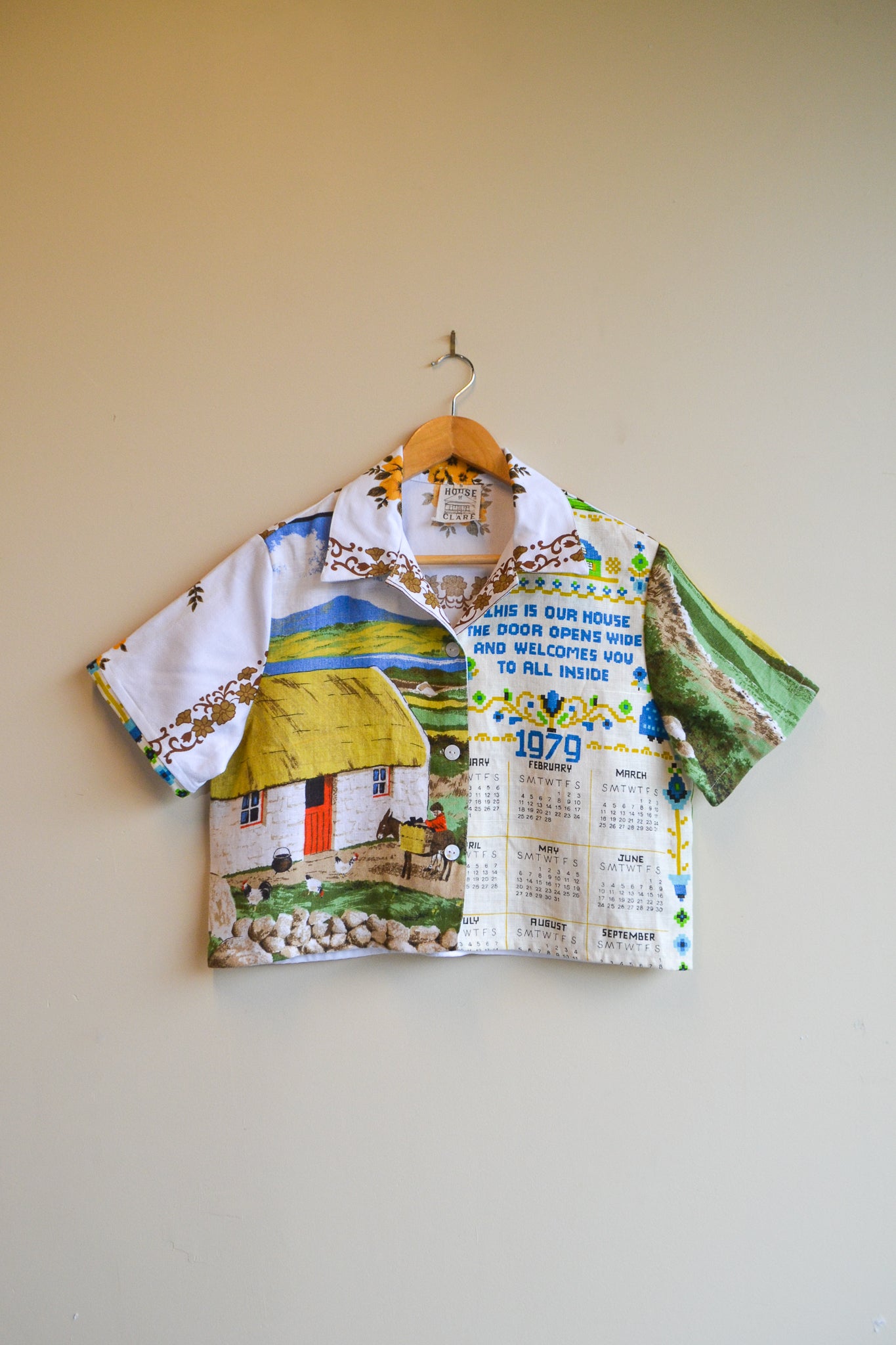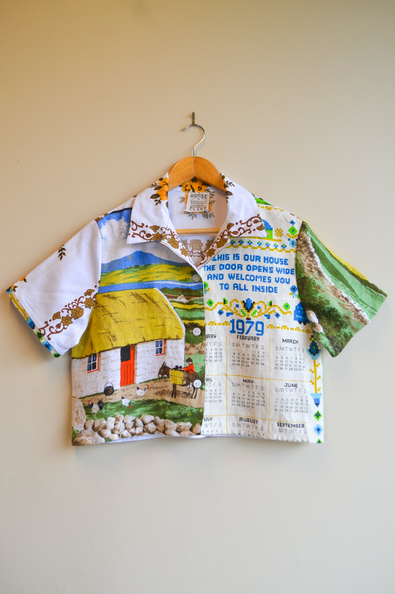 Our Cottage Button-Up Shirt is a one-of-a-kind, wearable art piece. Crafted from beautifully preserved vintage linen tea towels and vintage cotton table cloth. With a relaxed fit that finishes at the hip, it offers a flattering and timeless silhouette.