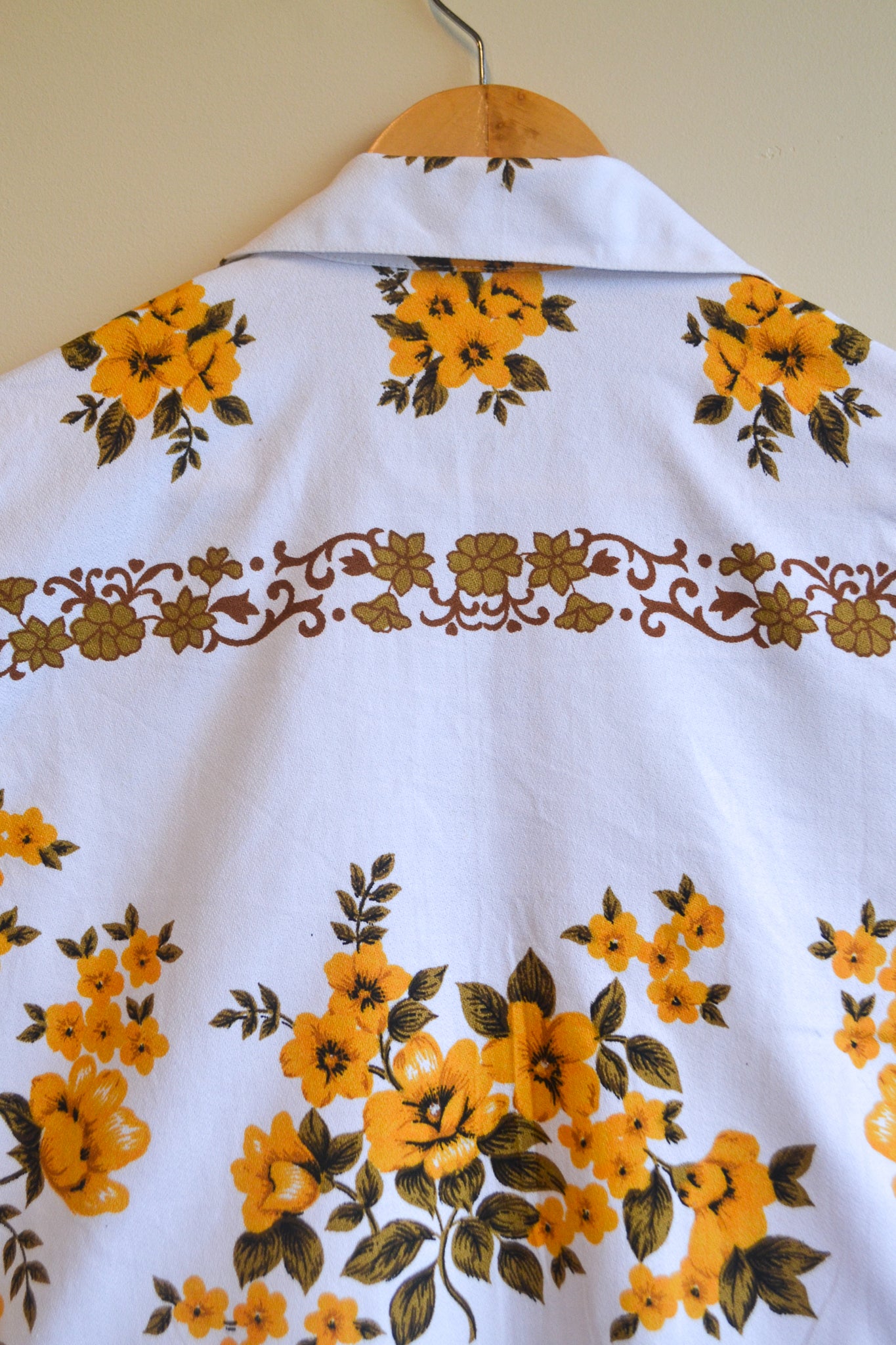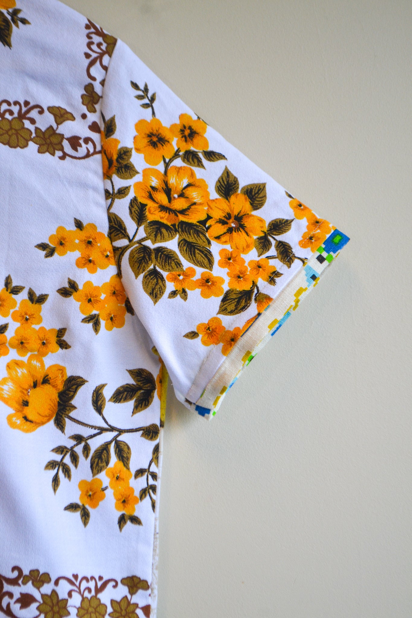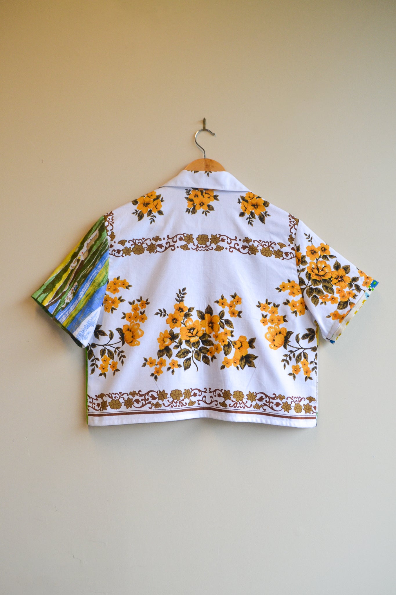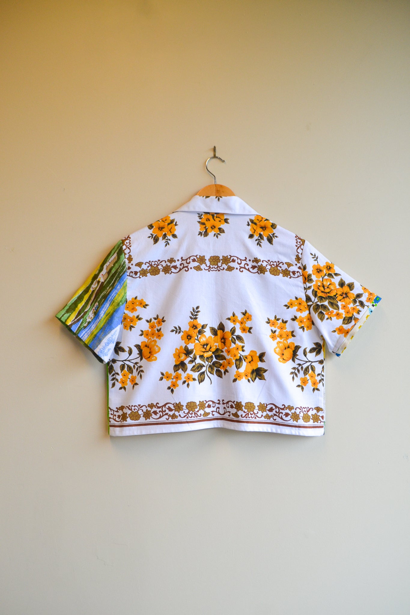Our Cottage Button-Up Shirt is a one-of-a-kind, wearable art piece. Crafted from beautifully preserved vintage linen tea towels and vintage cotton table cloth. With a relaxed fit that finishes at the hip, it offers a flattering and timeless silhouette.