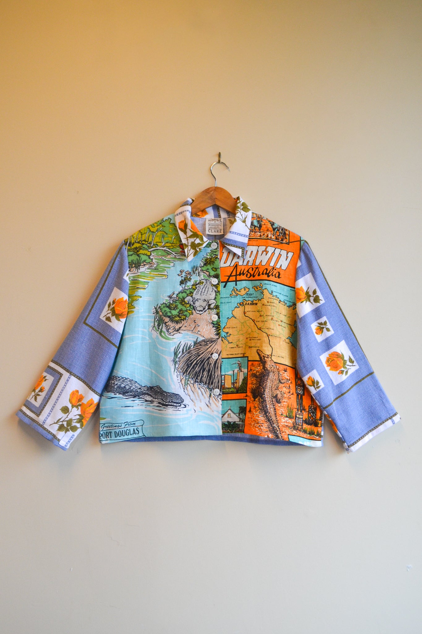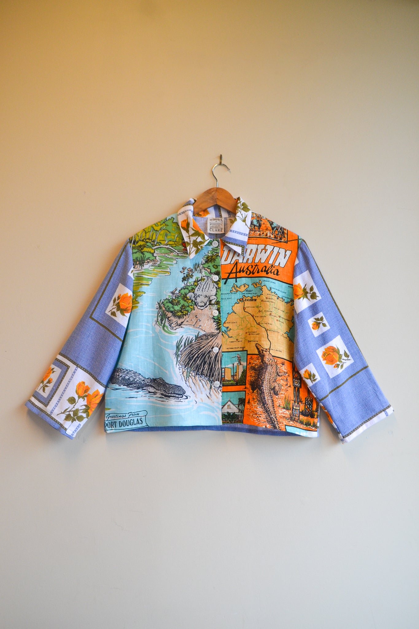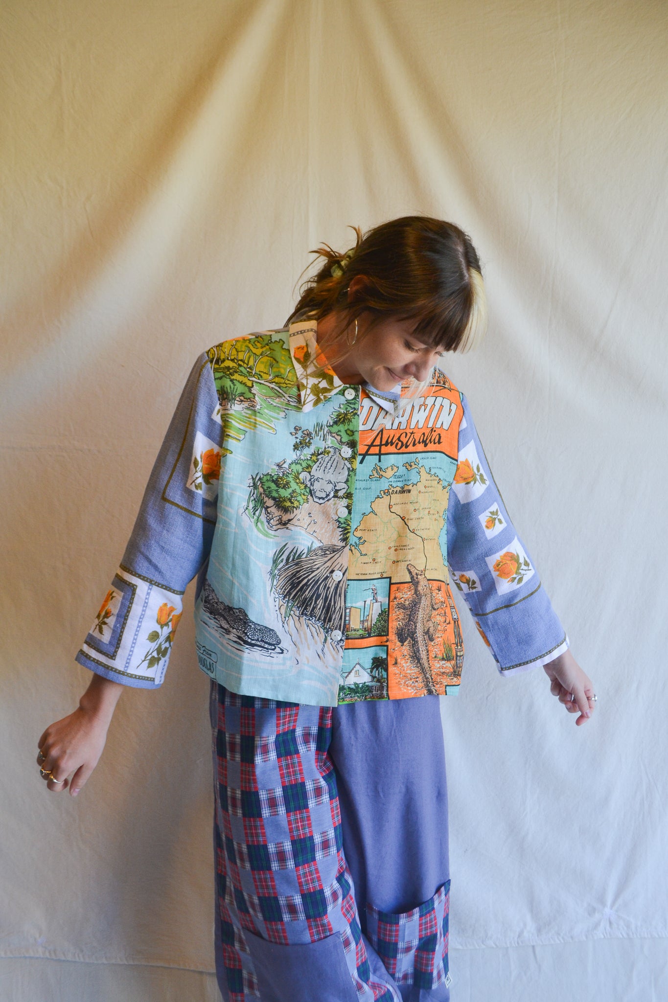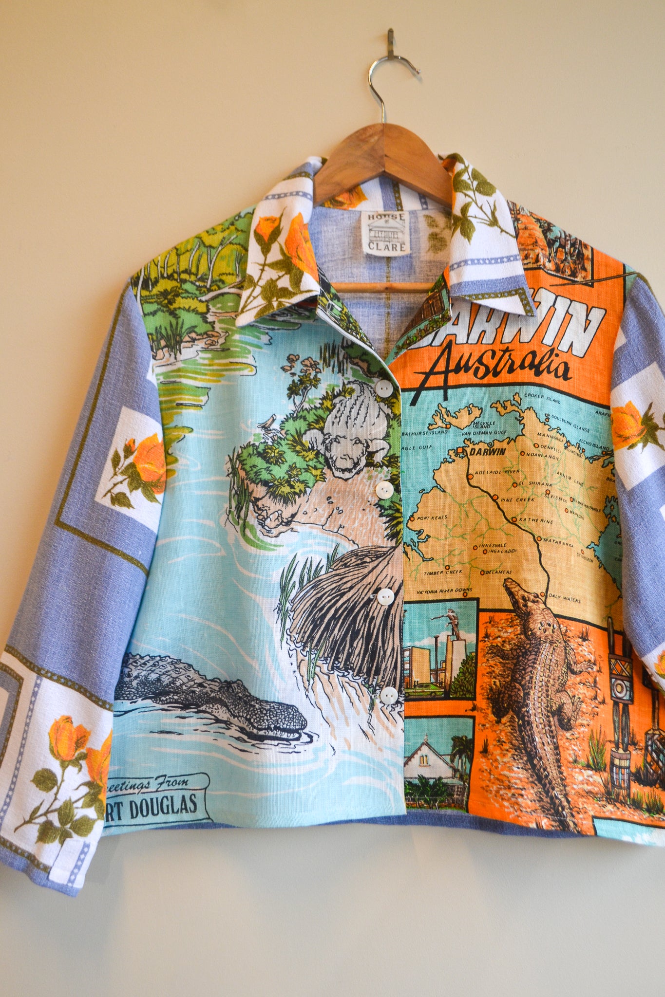 This one-of-a-kind beauty 'Croc Button Up' is handcrafted from a beautifully preserved vintage Tea towels and cotton Table Cloth. A true one of a kind piece, with 5 white mother of pearl buttons at centre front, convertible collar letting you wear open or closed and finishing at hip for easy pairing.