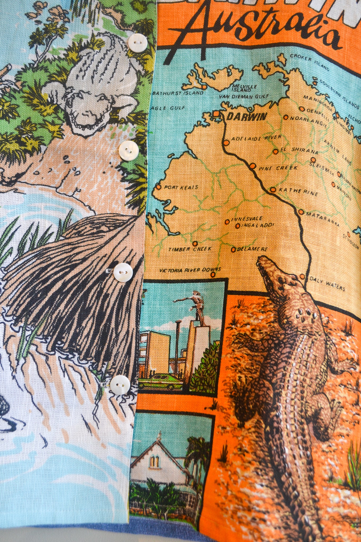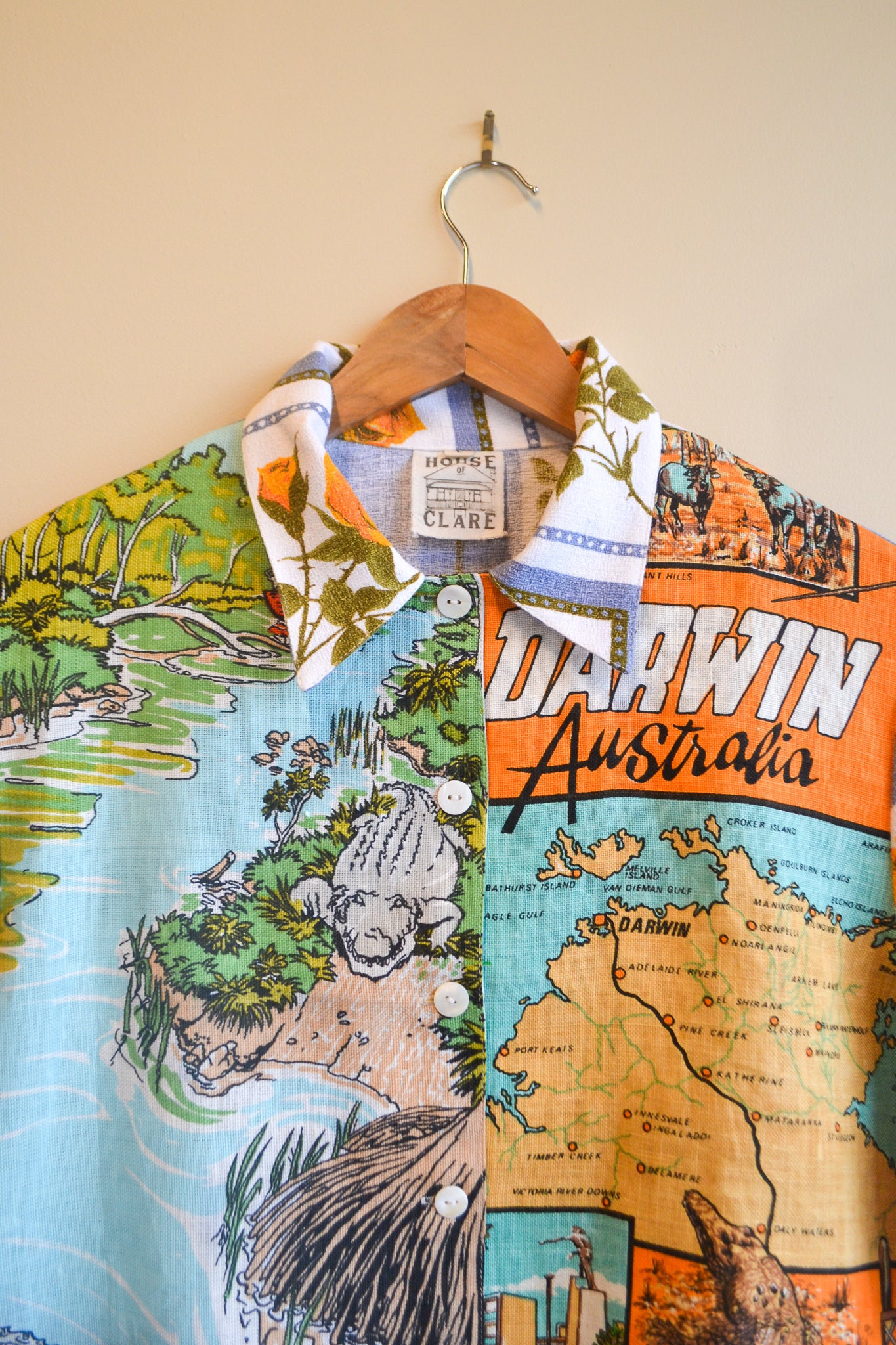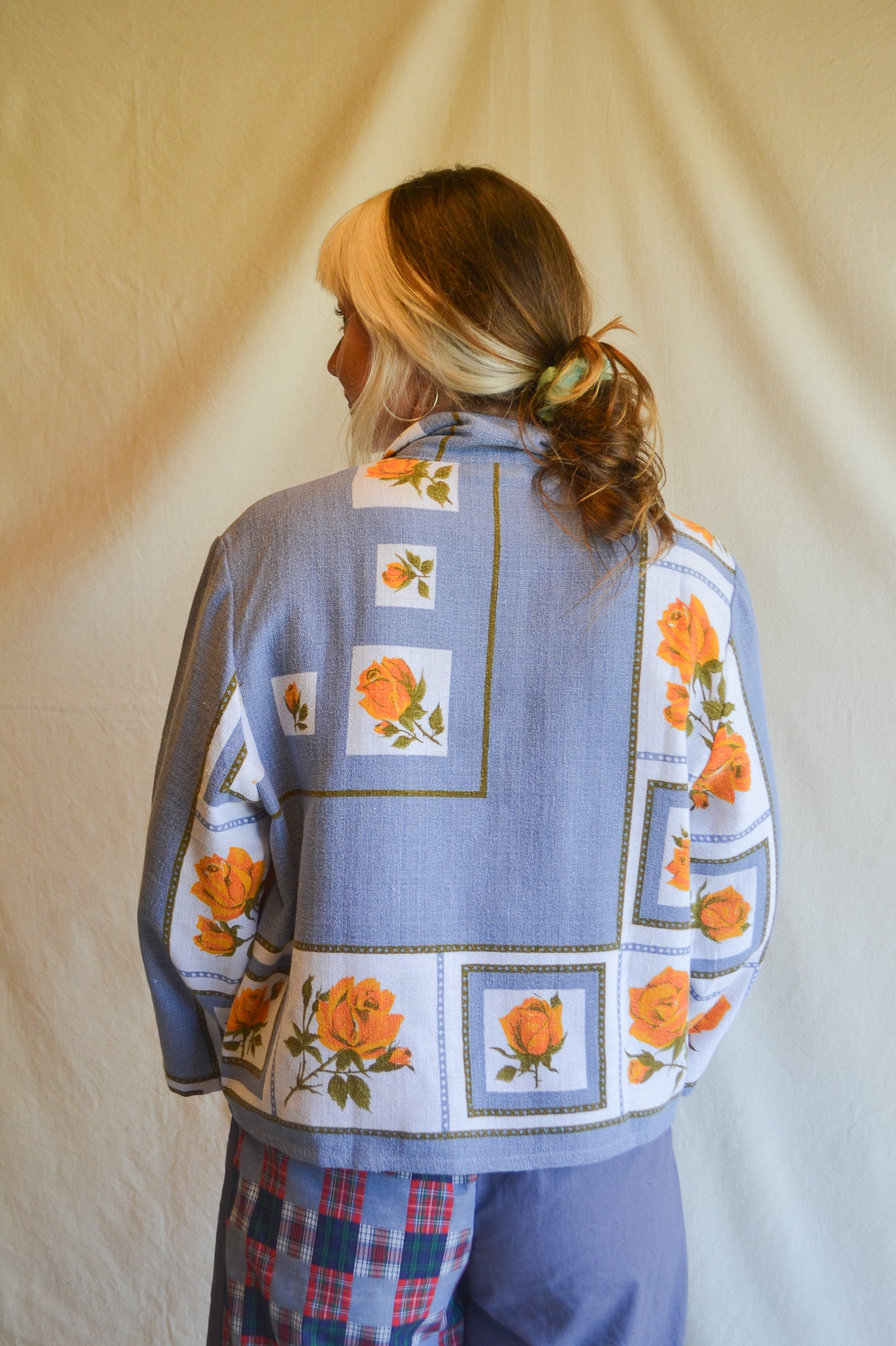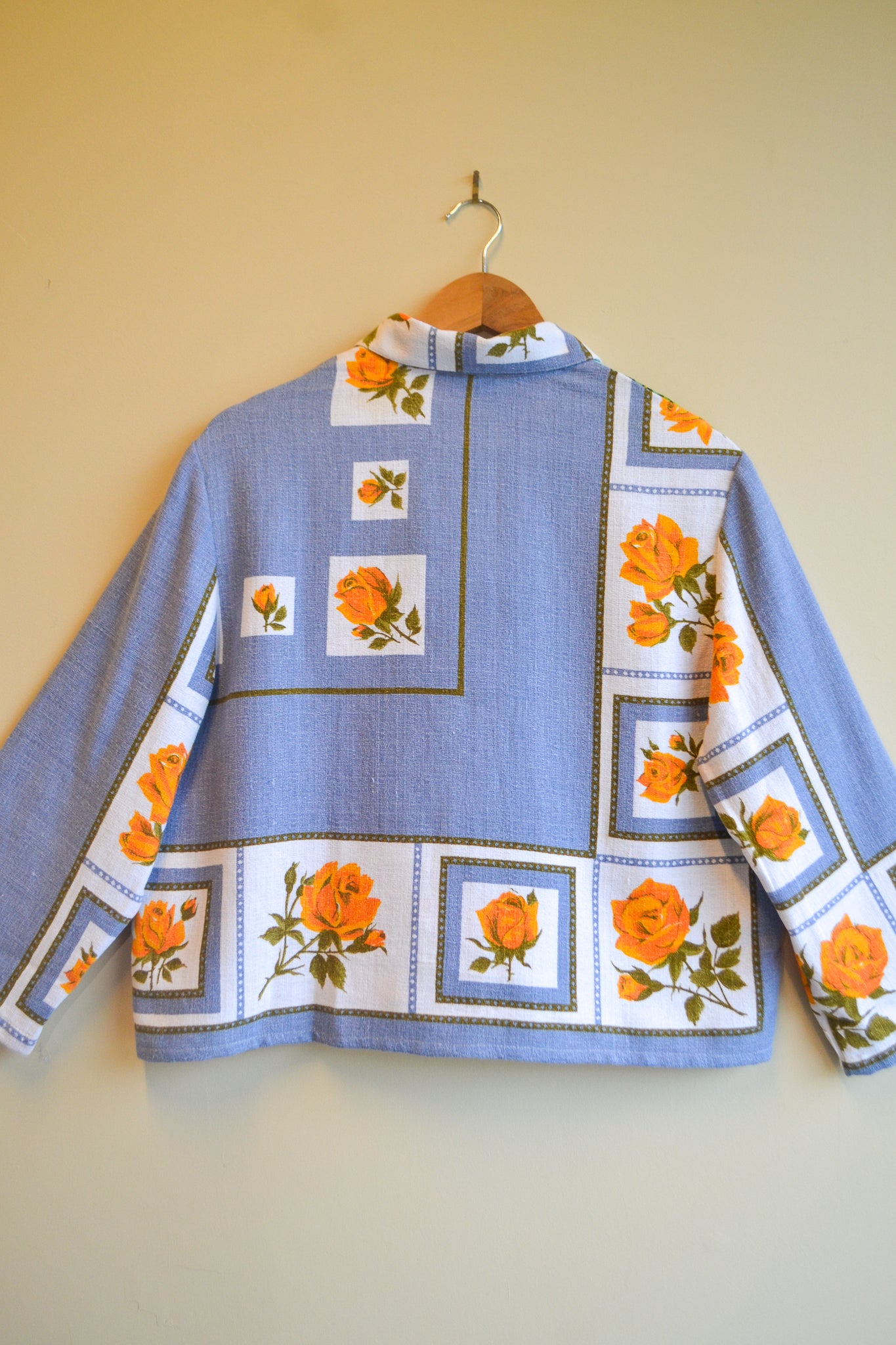 This one-of-a-kind beauty 'Croc Button Up' is handcrafted from a beautifully preserved vintage Tea towels and cotton Table Cloth. A true one of a kind piece, with 5 white mother of pearl buttons at centre front, convertible collar letting you wear open or closed and finishing at hip for easy pairing.
