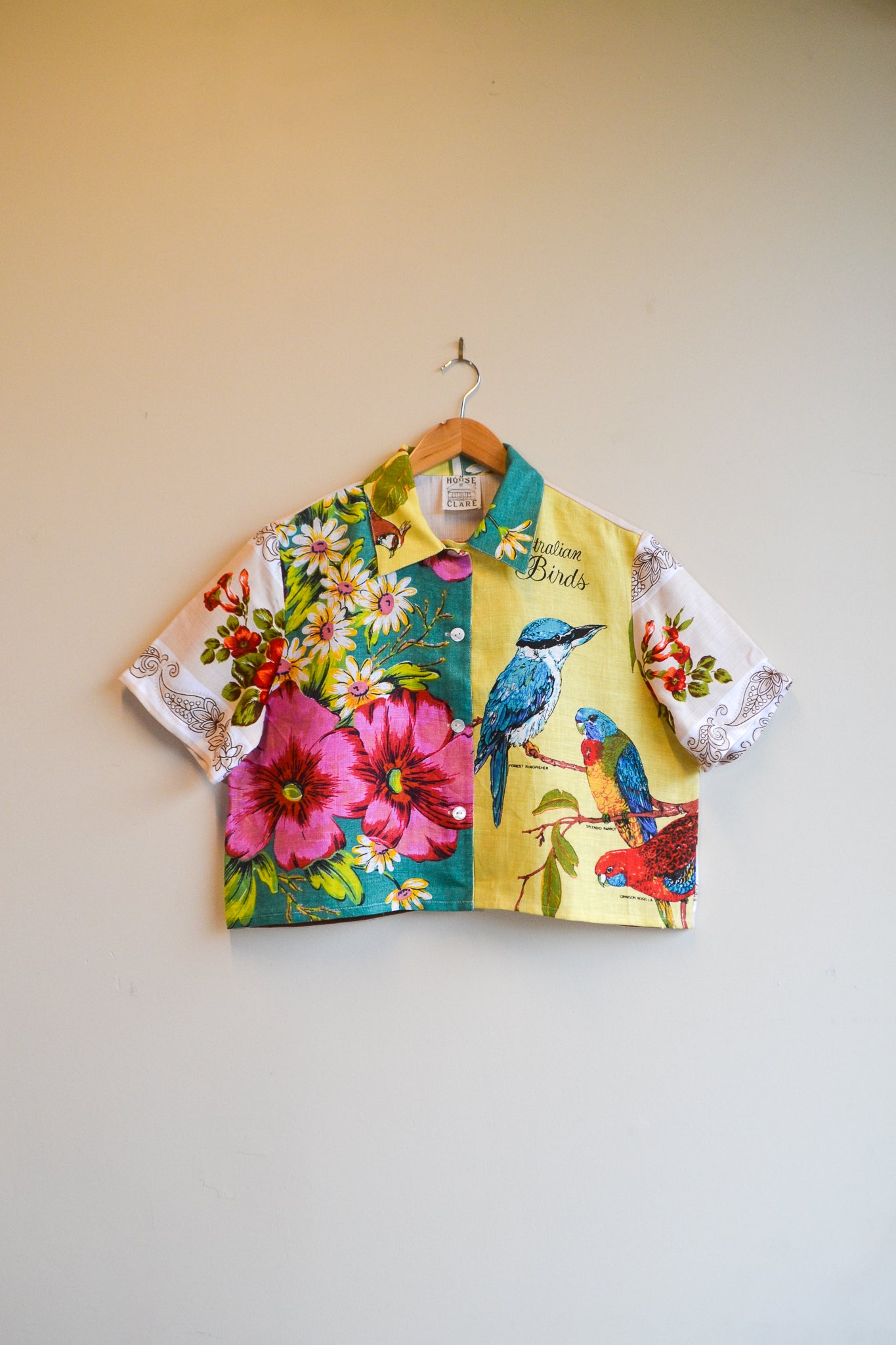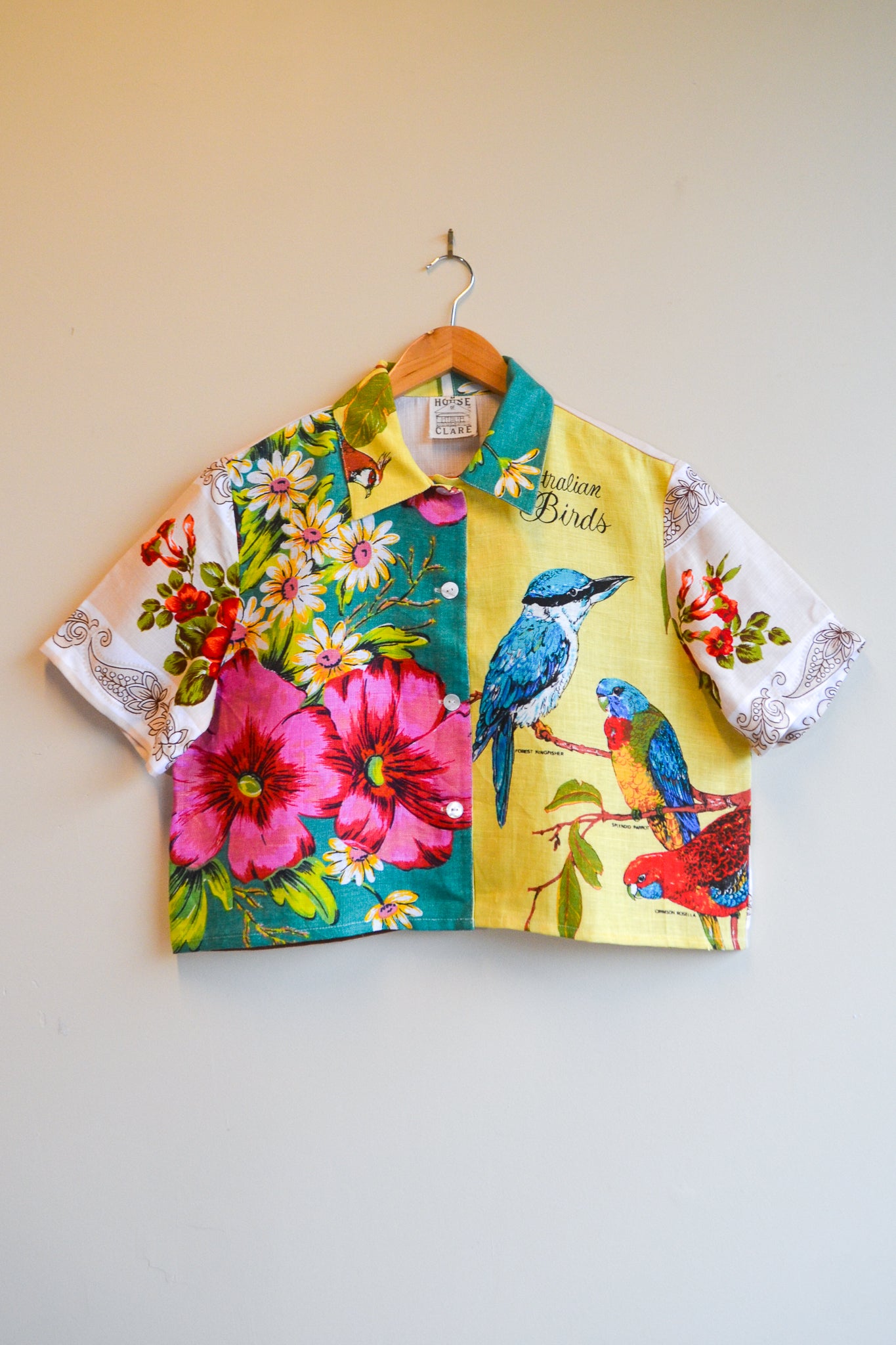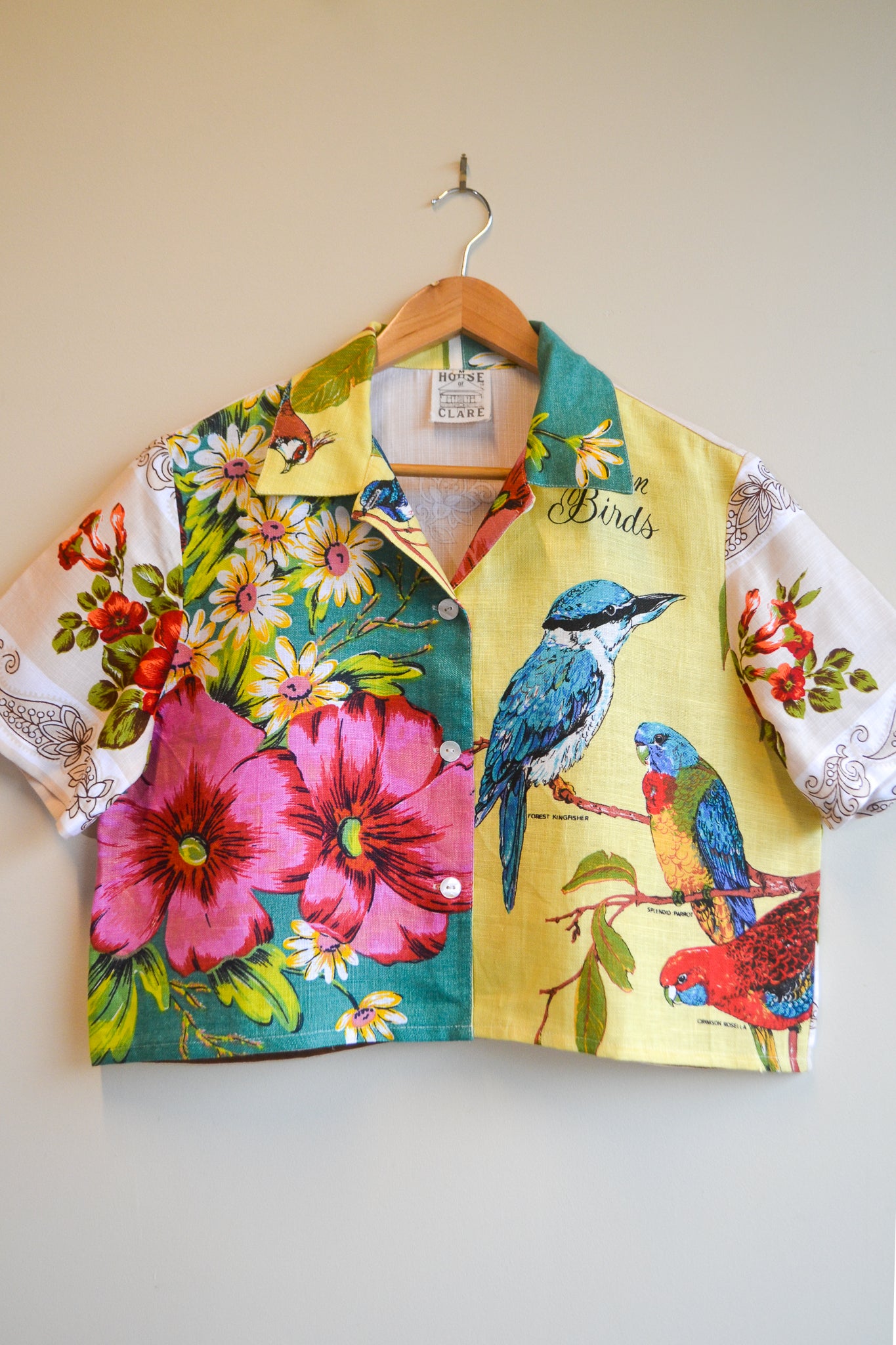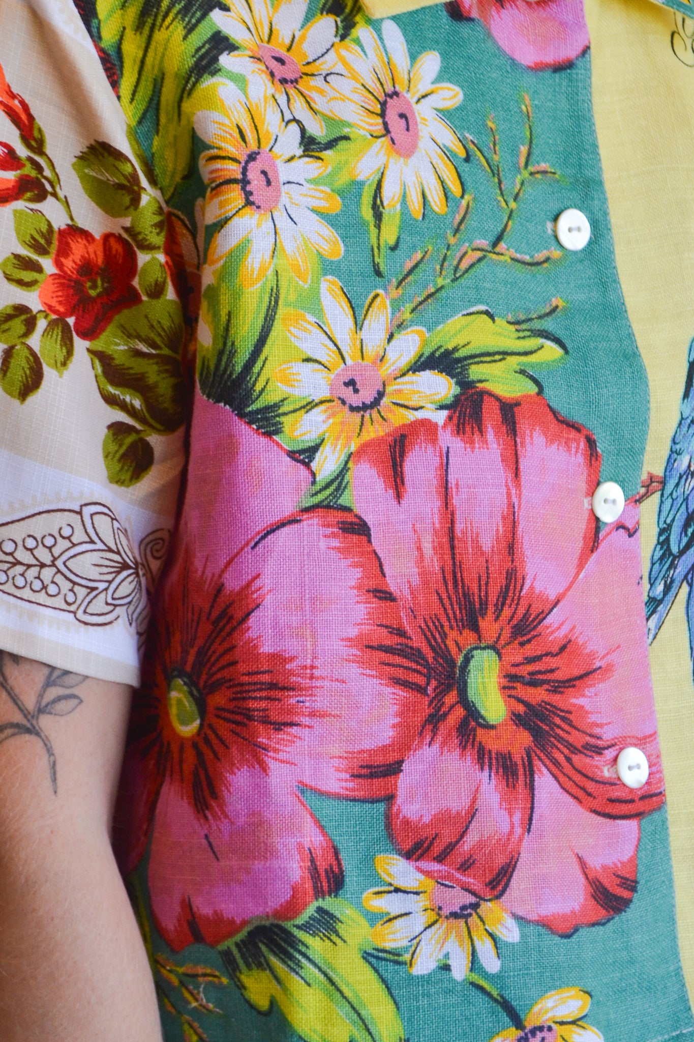 Looking for a stand-out statement piece? Well look no further, our King Fisher Button-Up Shirt is a one-of-a-kind, wearable art piece, crafted from 2 beautifully preserved vintage linen tea towels and table cloth.