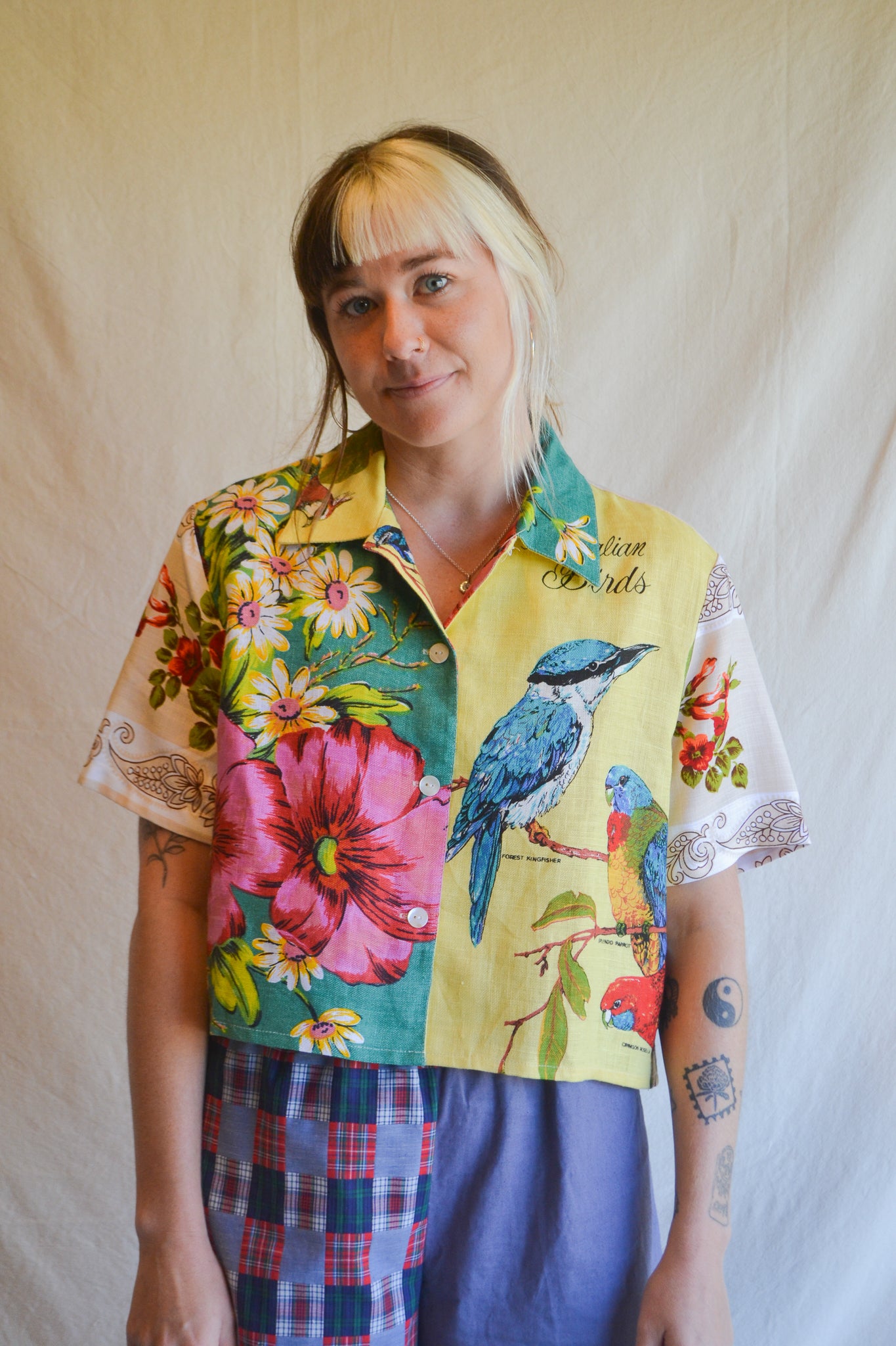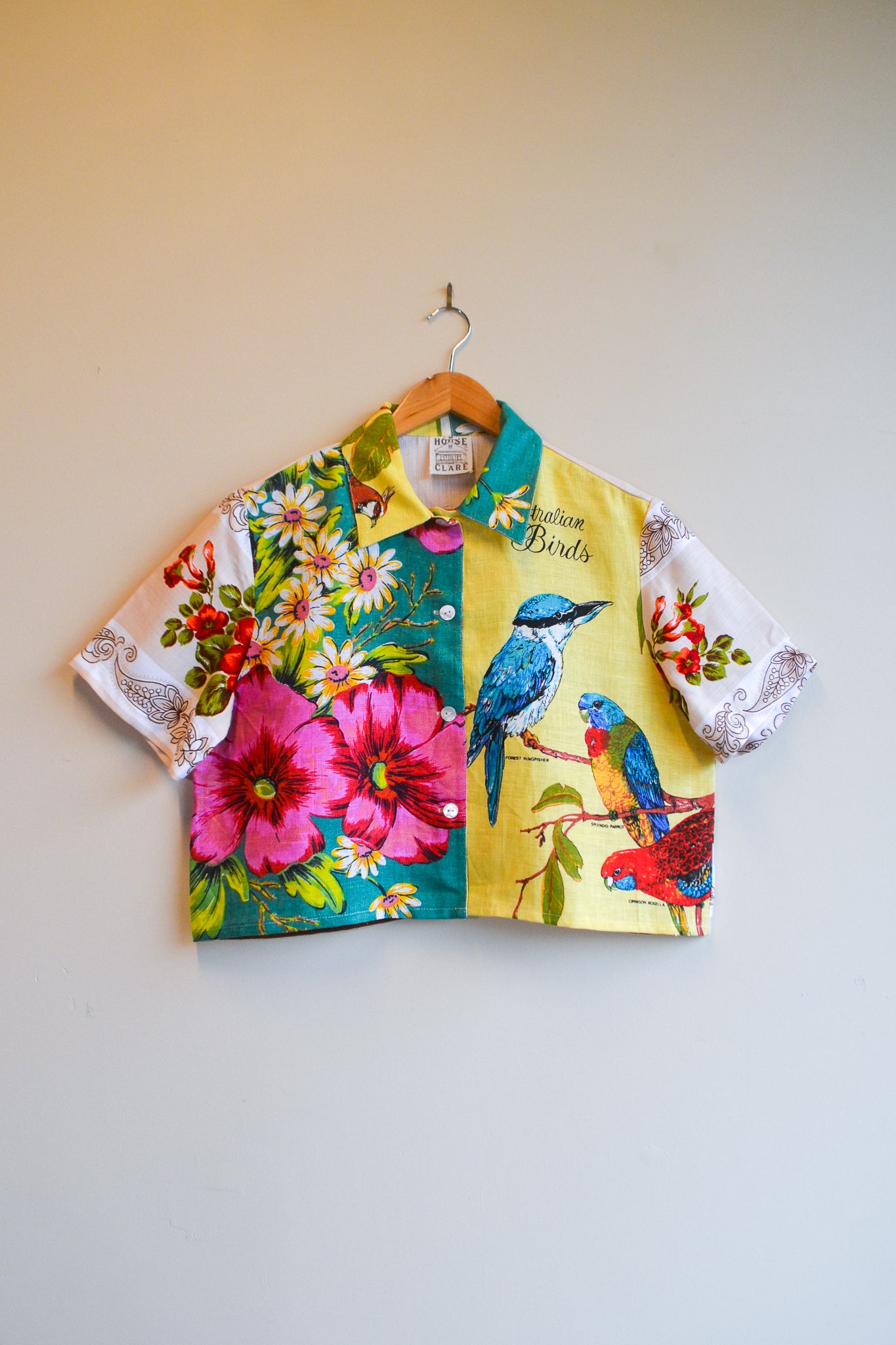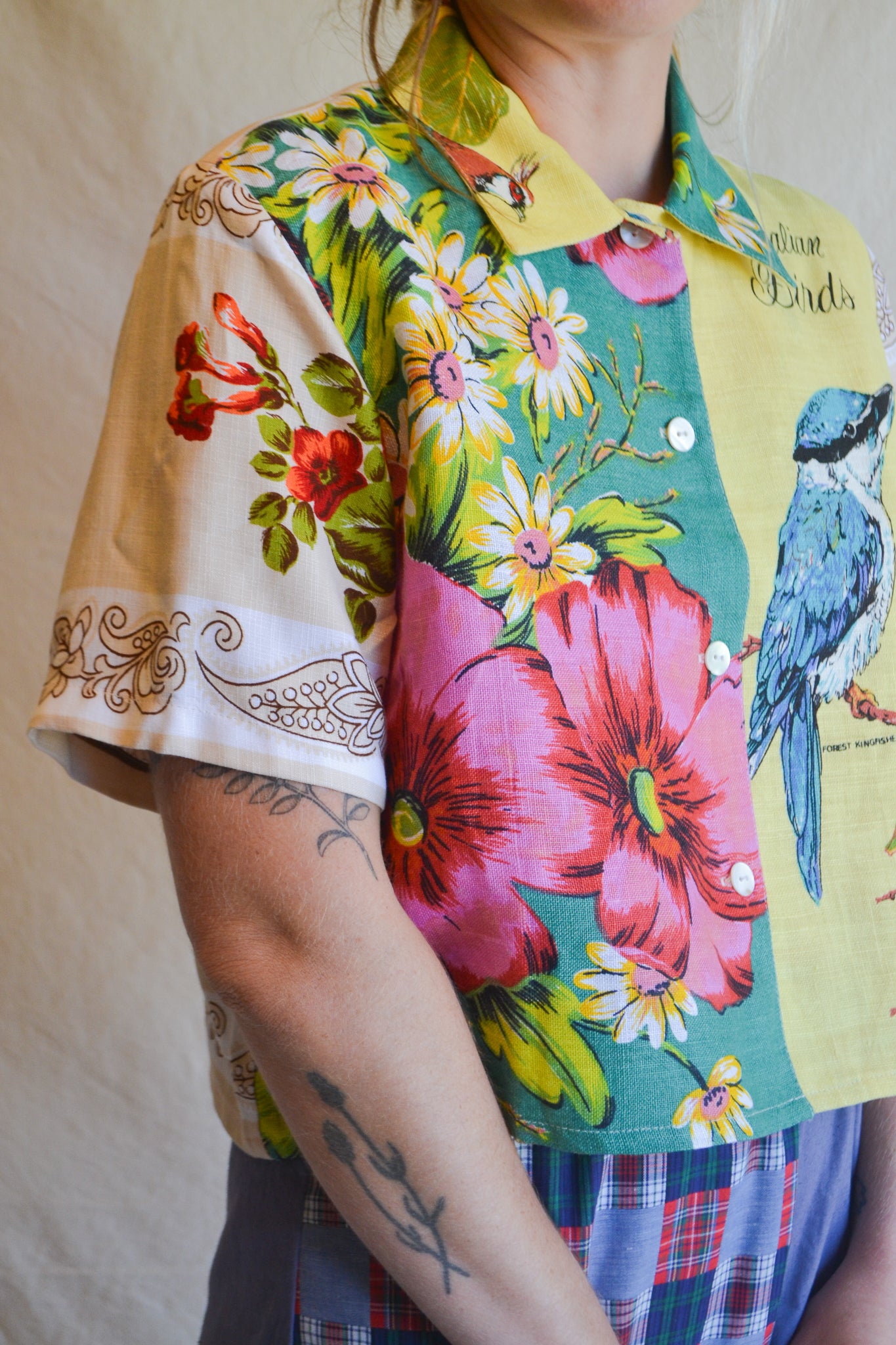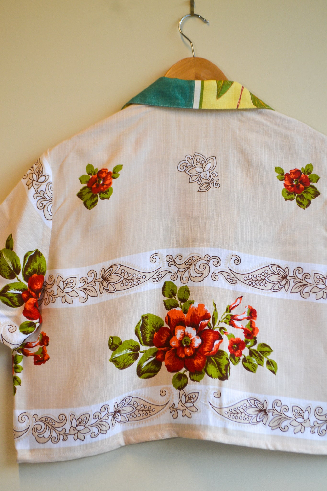Looking for a stand-out statement piece? Well look no further, our King Fisher Button-Up Shirt is a one-of-a-kind, wearable art piece, crafted from 2 beautifully preserved vintage linen tea towels and table cloth.