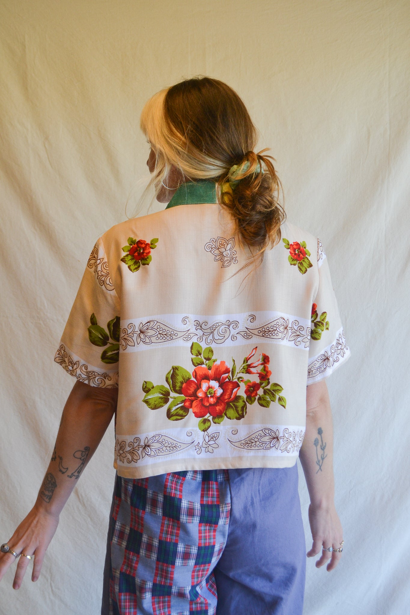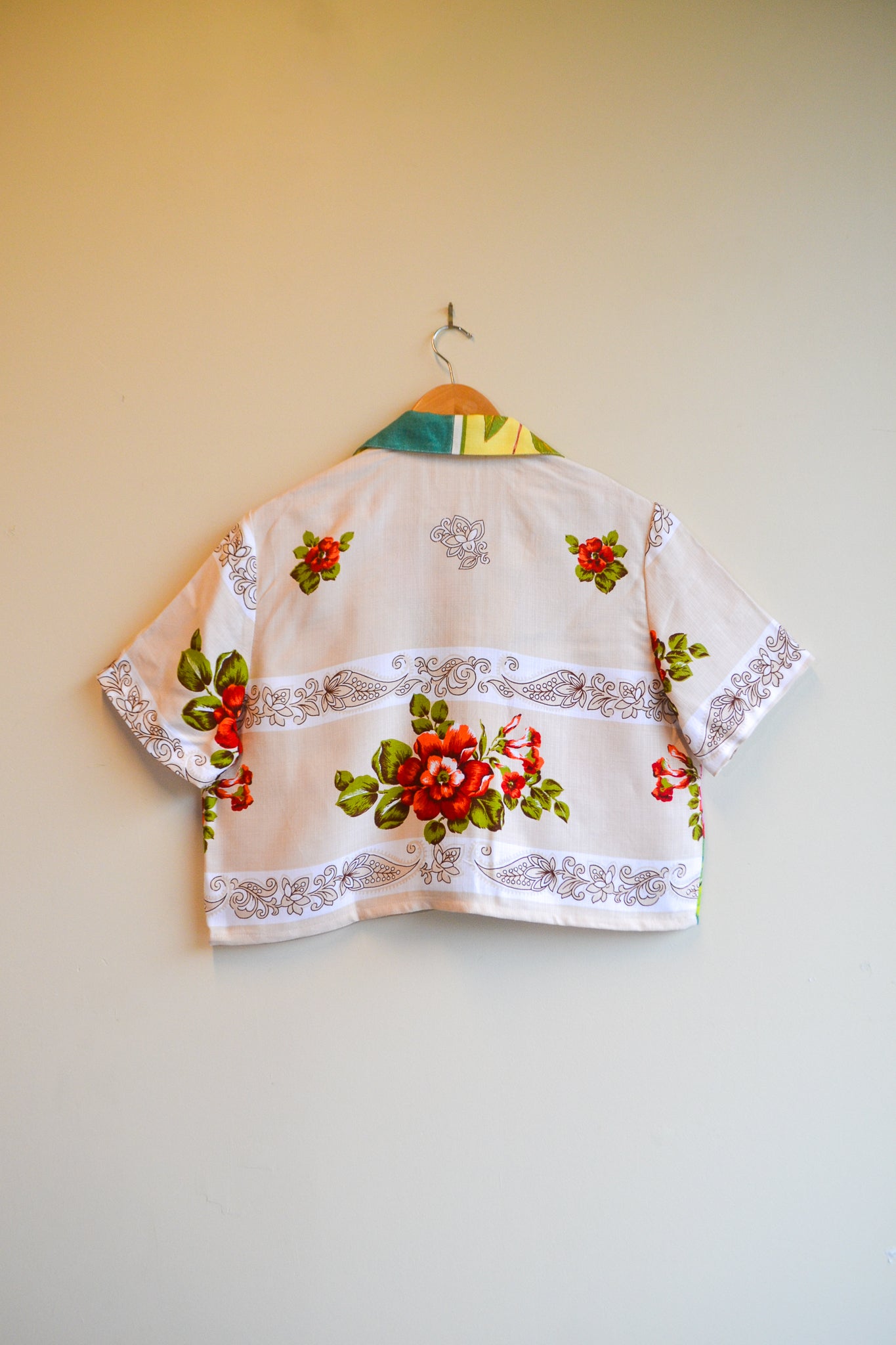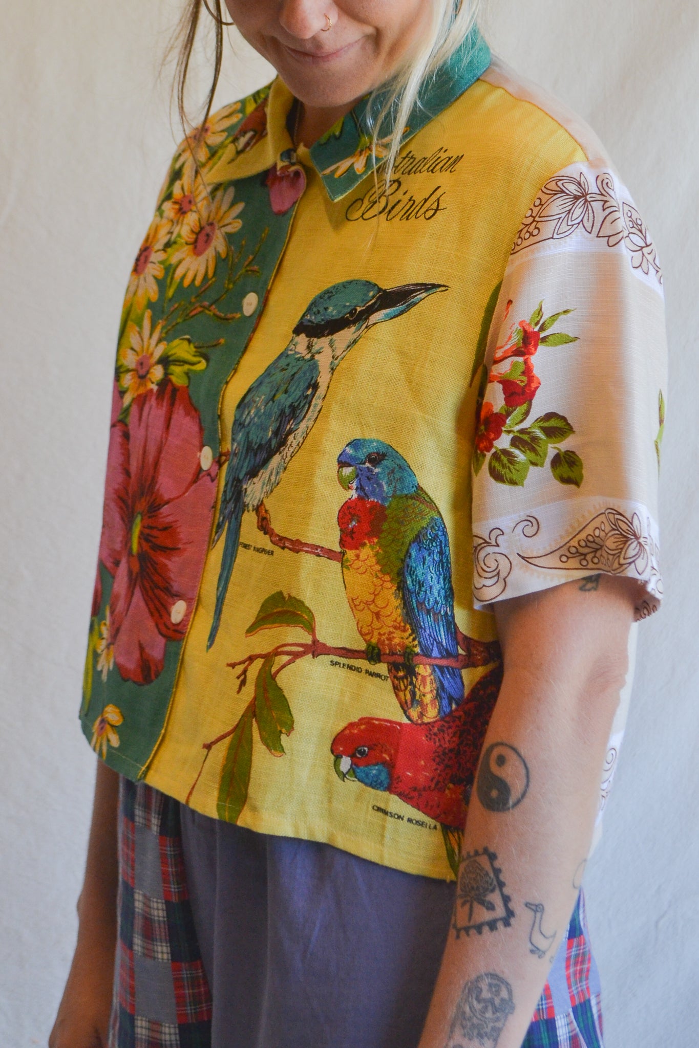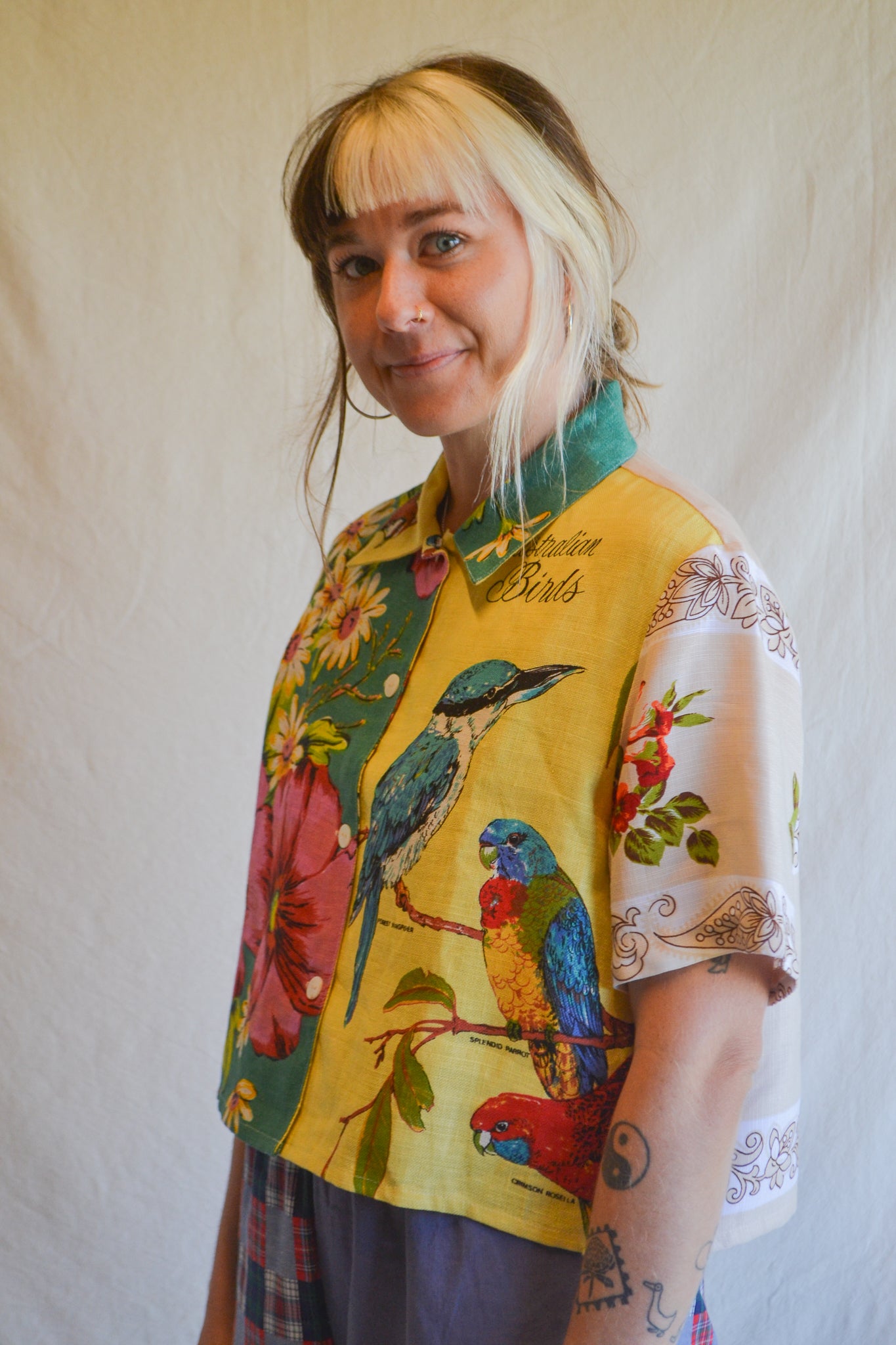 Looking for a stand-out statement piece? Well look no further, our King Fisher Button-Up Shirt is a one-of-a-kind, wearable art piece, crafted from 2 beautifully preserved vintage linen tea towels and table cloth.