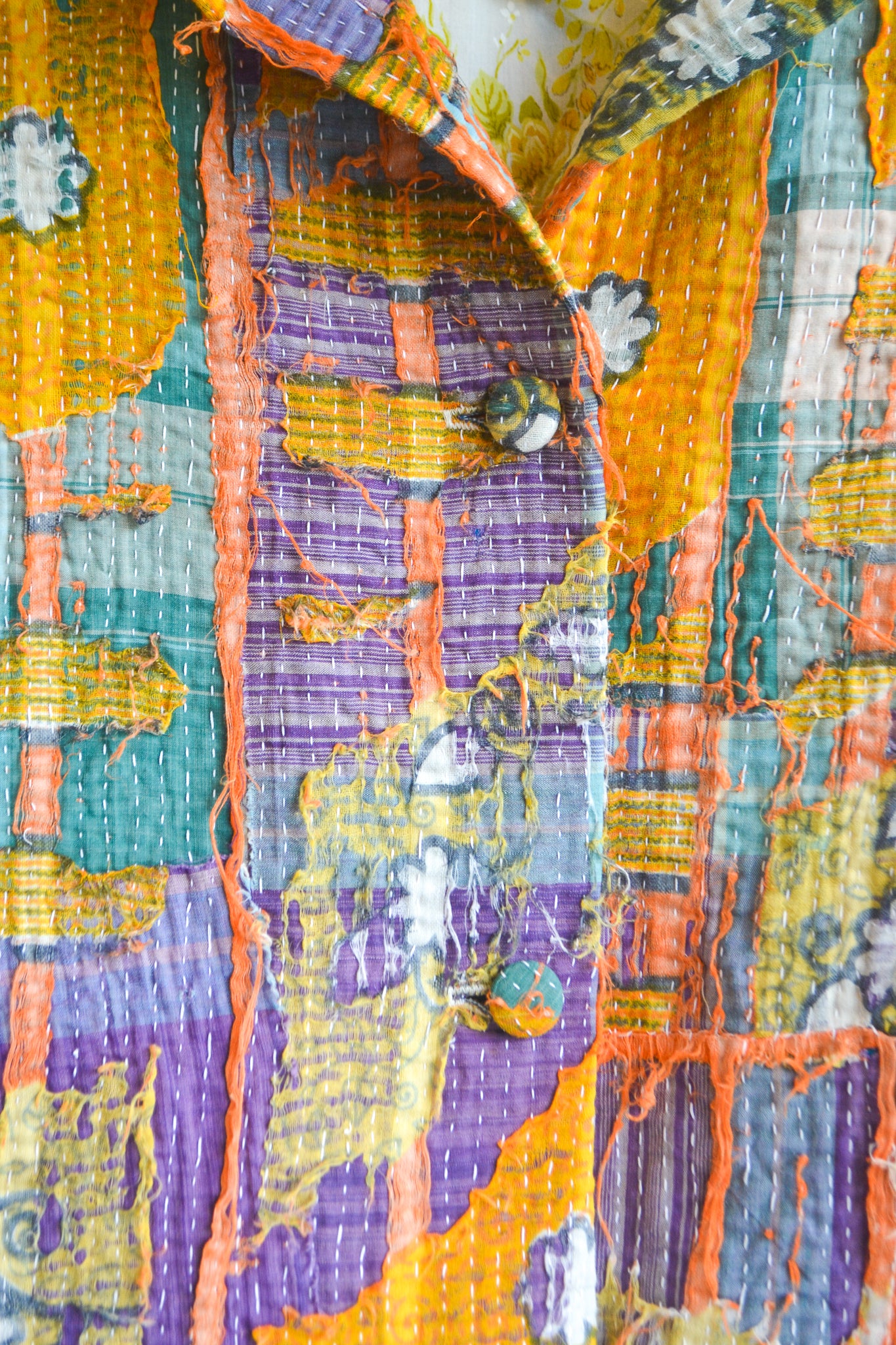 Get cozy in this cropped, one-of-a kind coat jacket! Crafted from a reclaimed blanket. Featuring hand pressed buttons, interior and outer pocket's, and cotton lining.