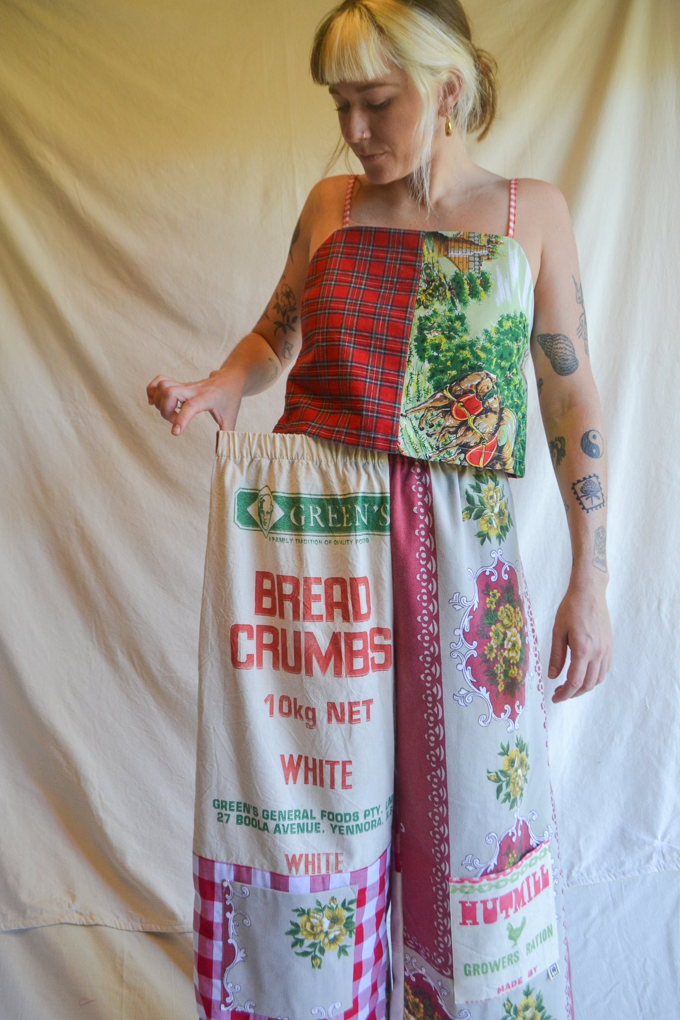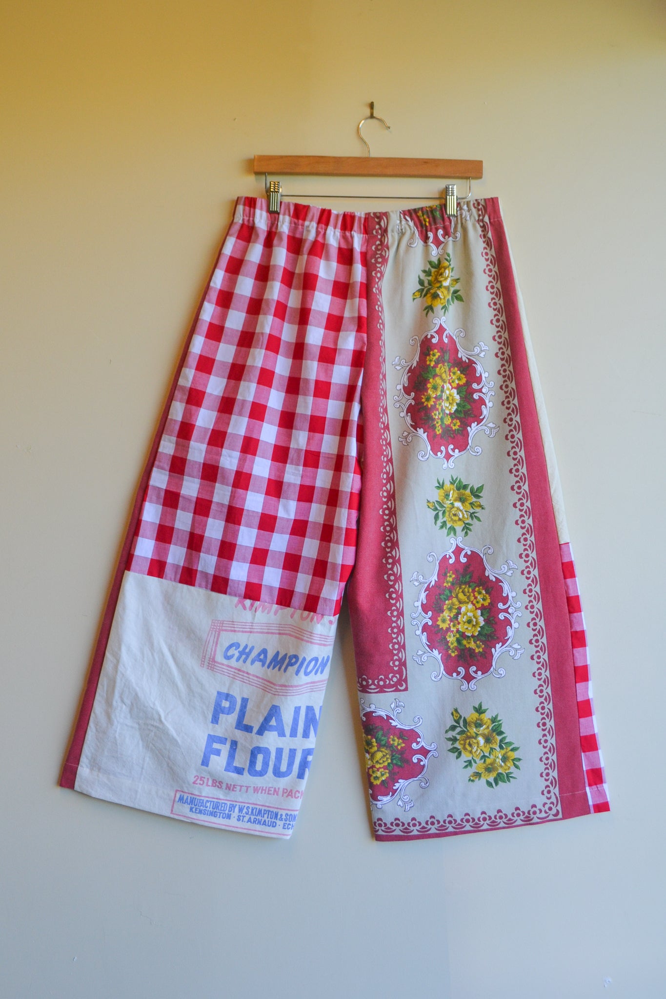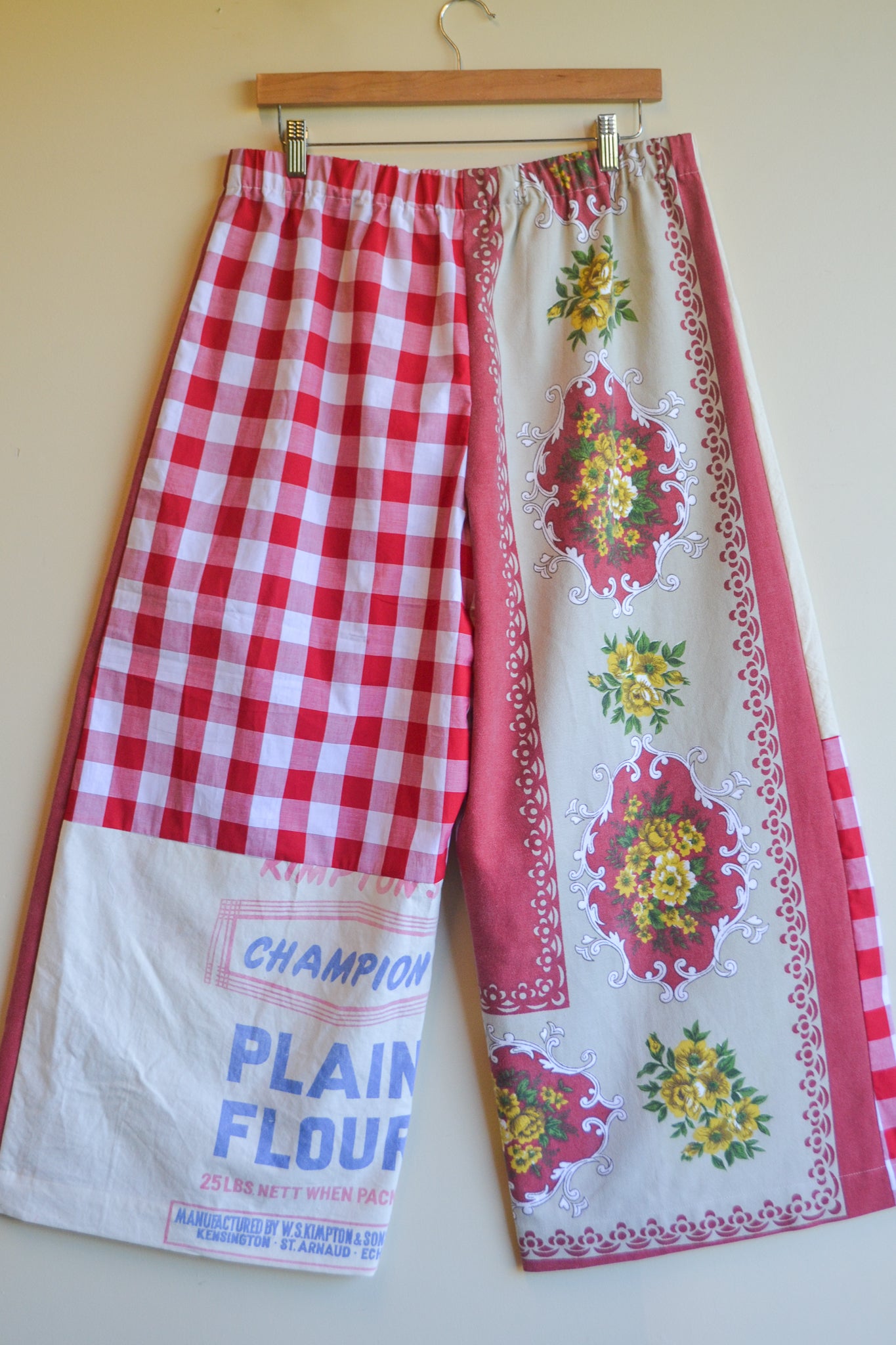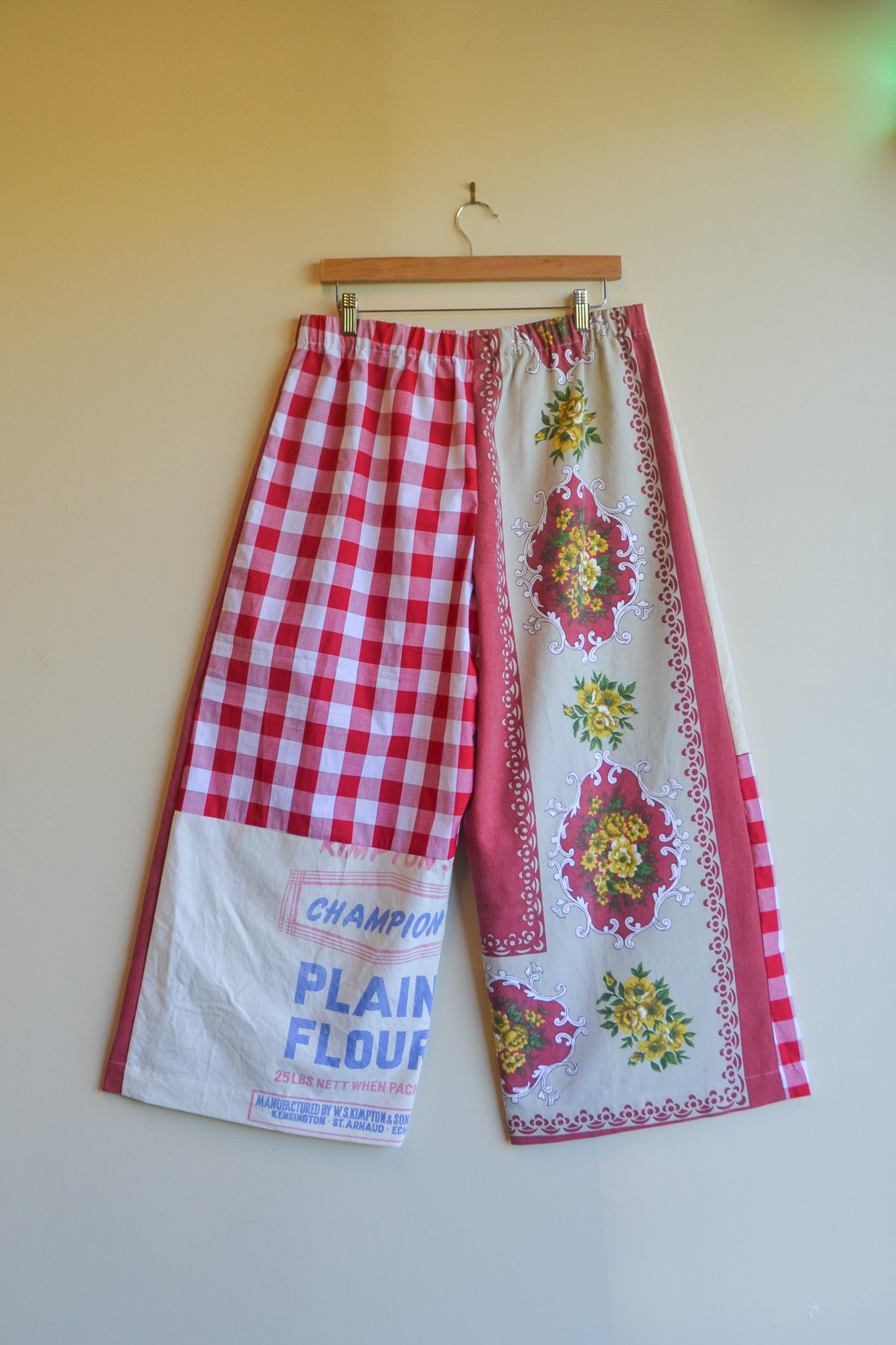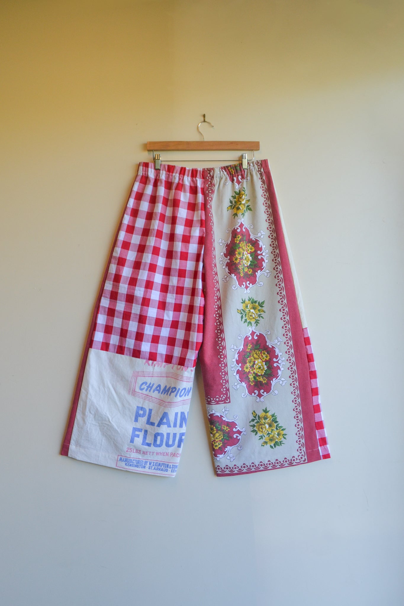 Our Growers, wide leg, high waist patch pants are a true one-of-a-kind statement piece. With our original playful design, A-line silhouette and patch pockets these pants provide ease and comfort. Crafted from vintage fabric and heritage flour sacks.
