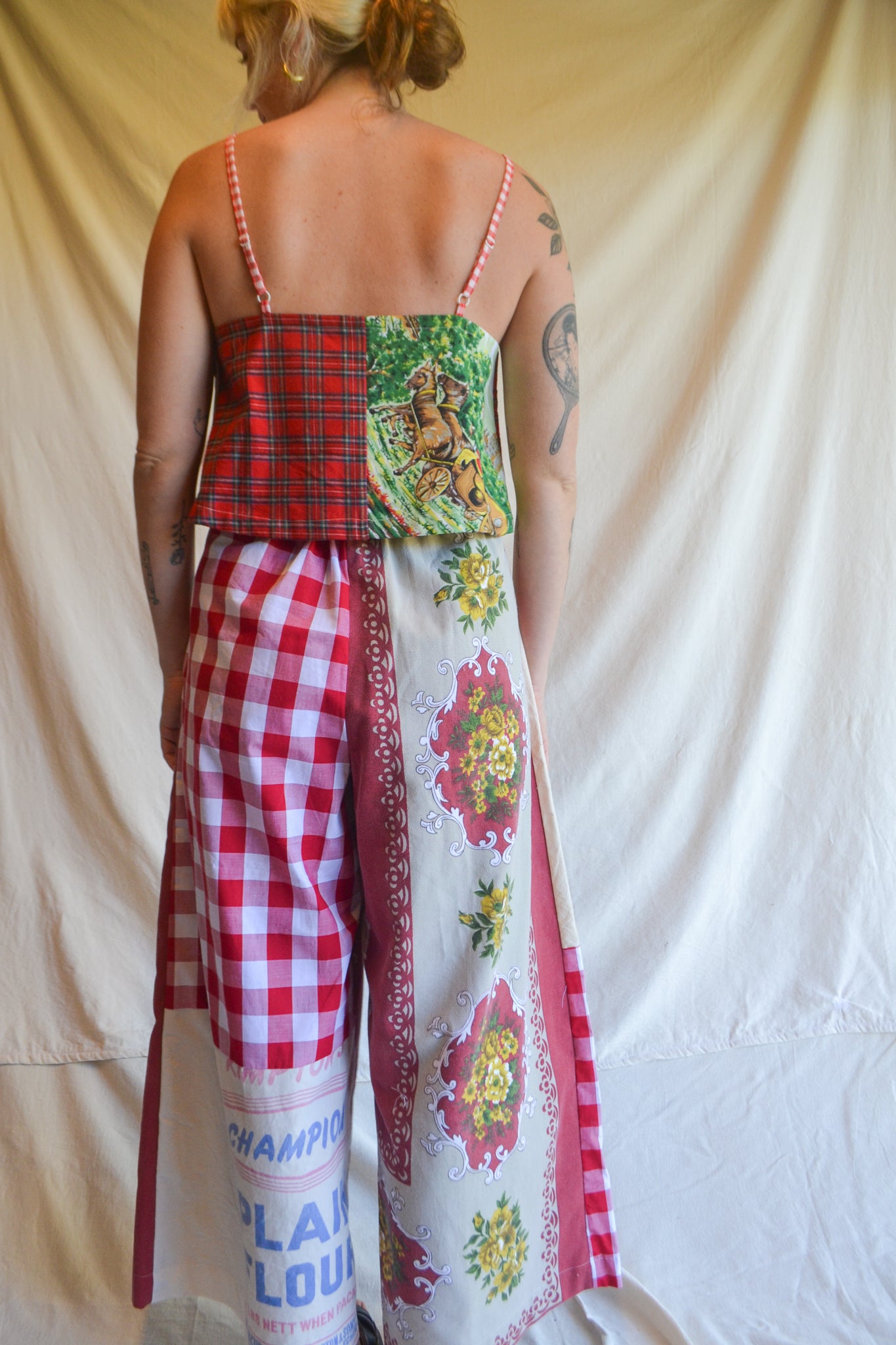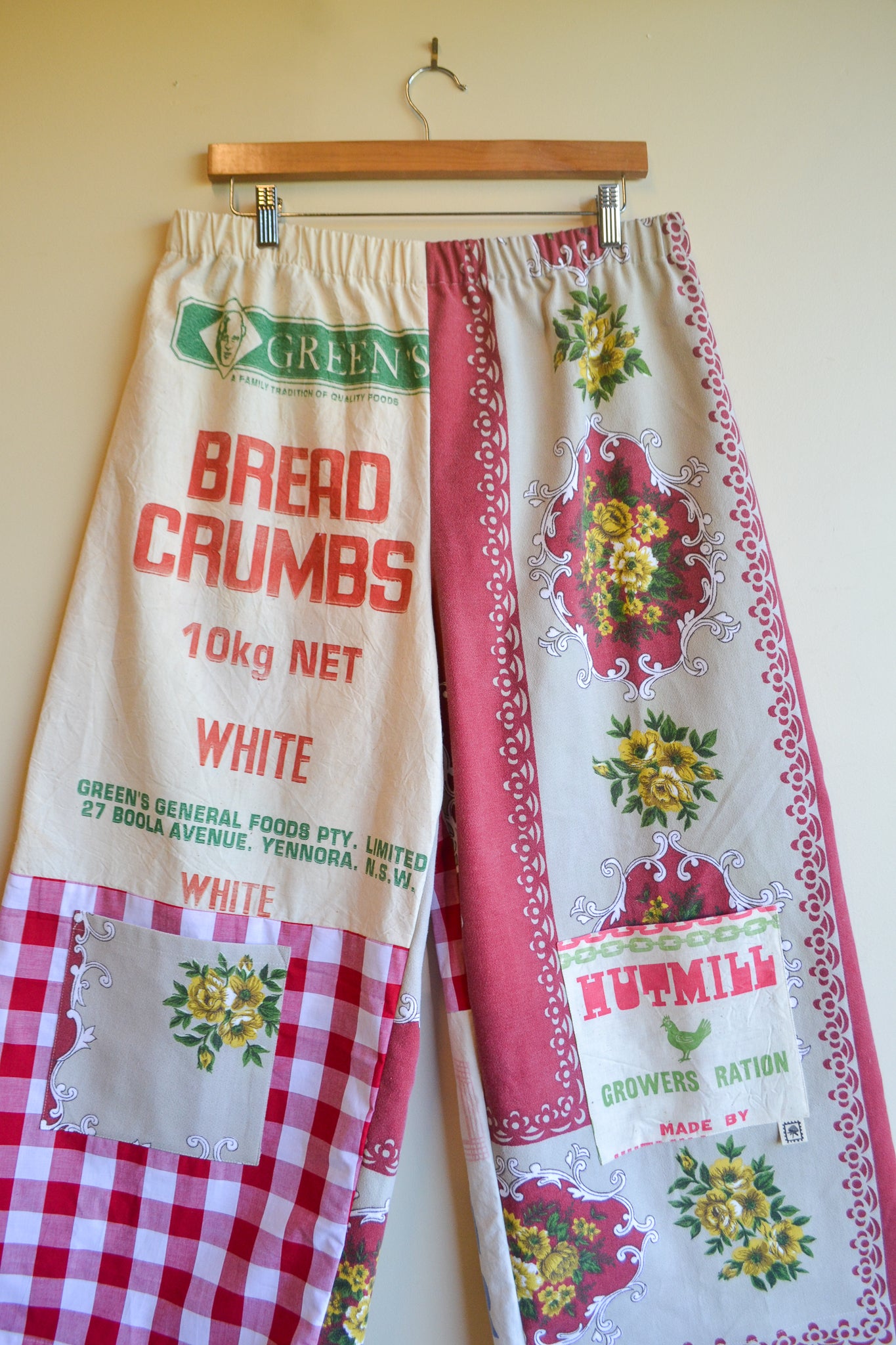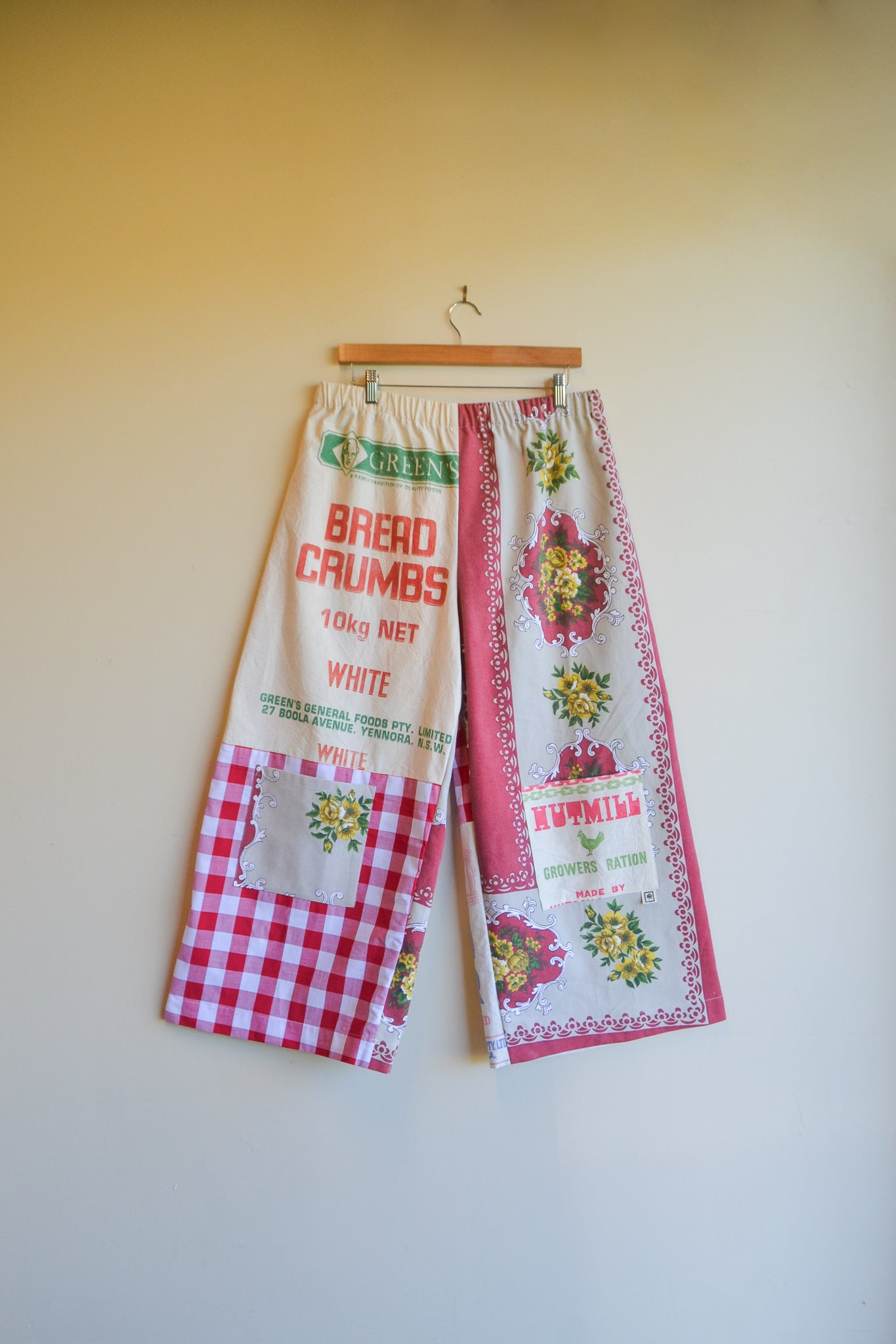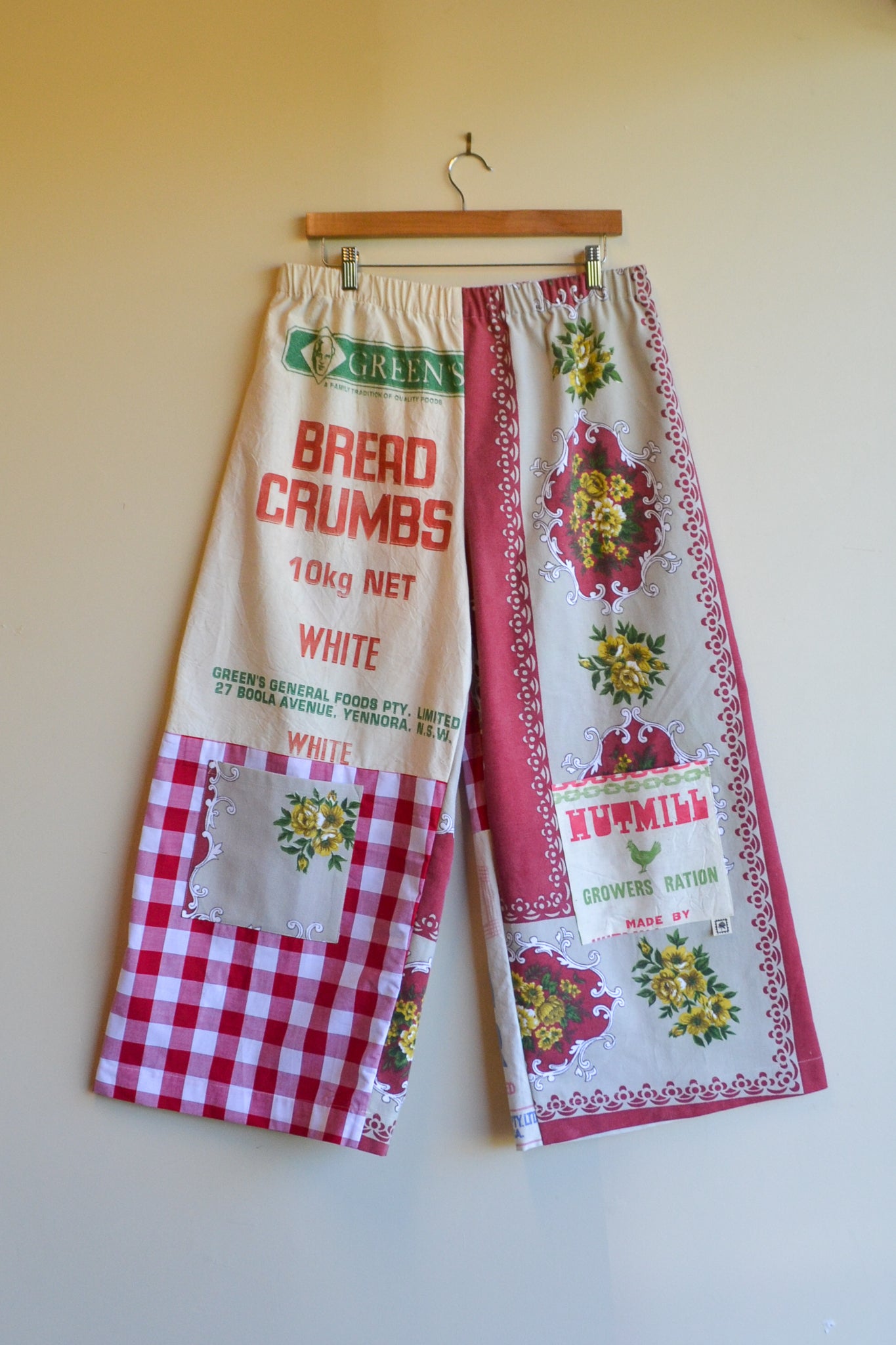 Our Growers, wide leg, high waist patch pants are a true one-of-a-kind statement piece. With our original playful design, A-line silhouette and patch pockets these pants provide ease and comfort. Crafted from vintage fabric and heritage flour sacks.