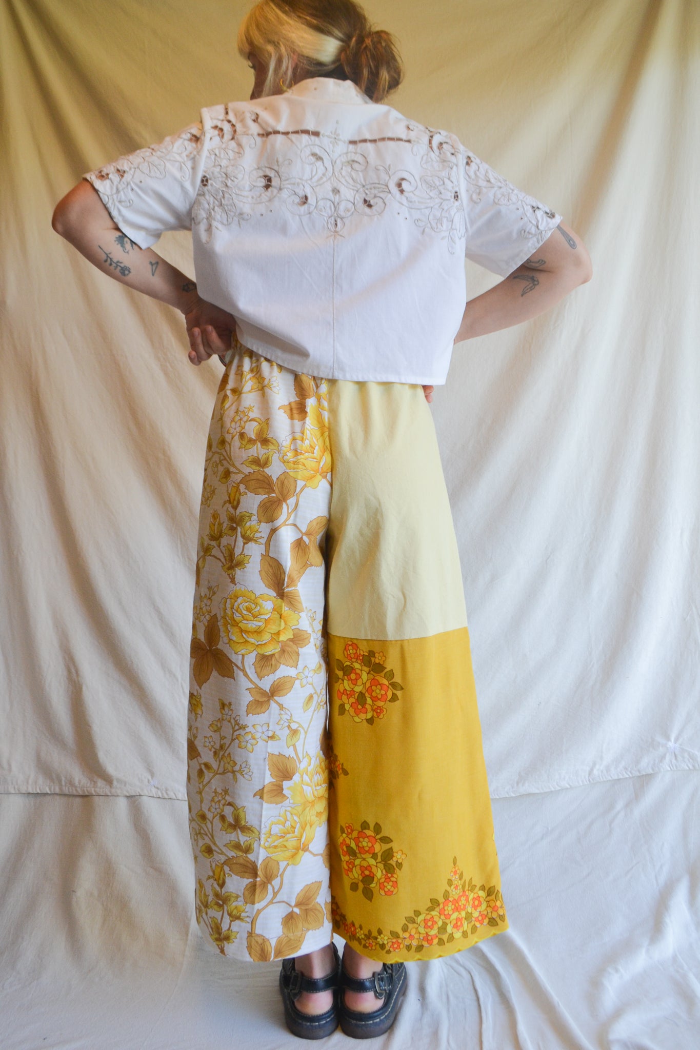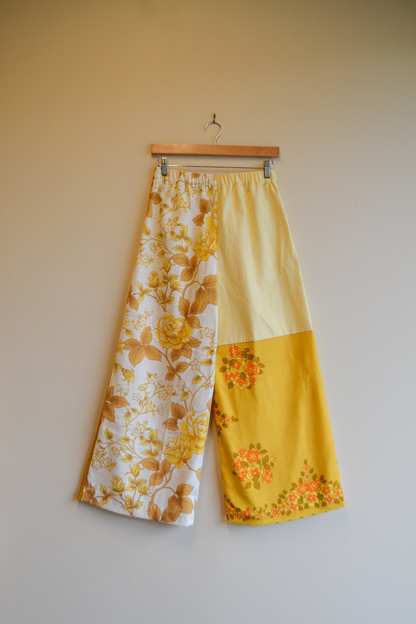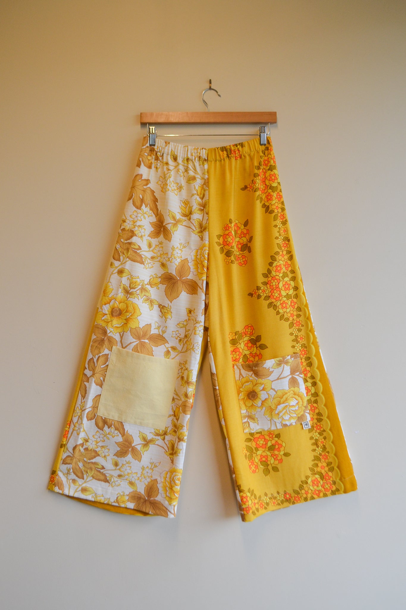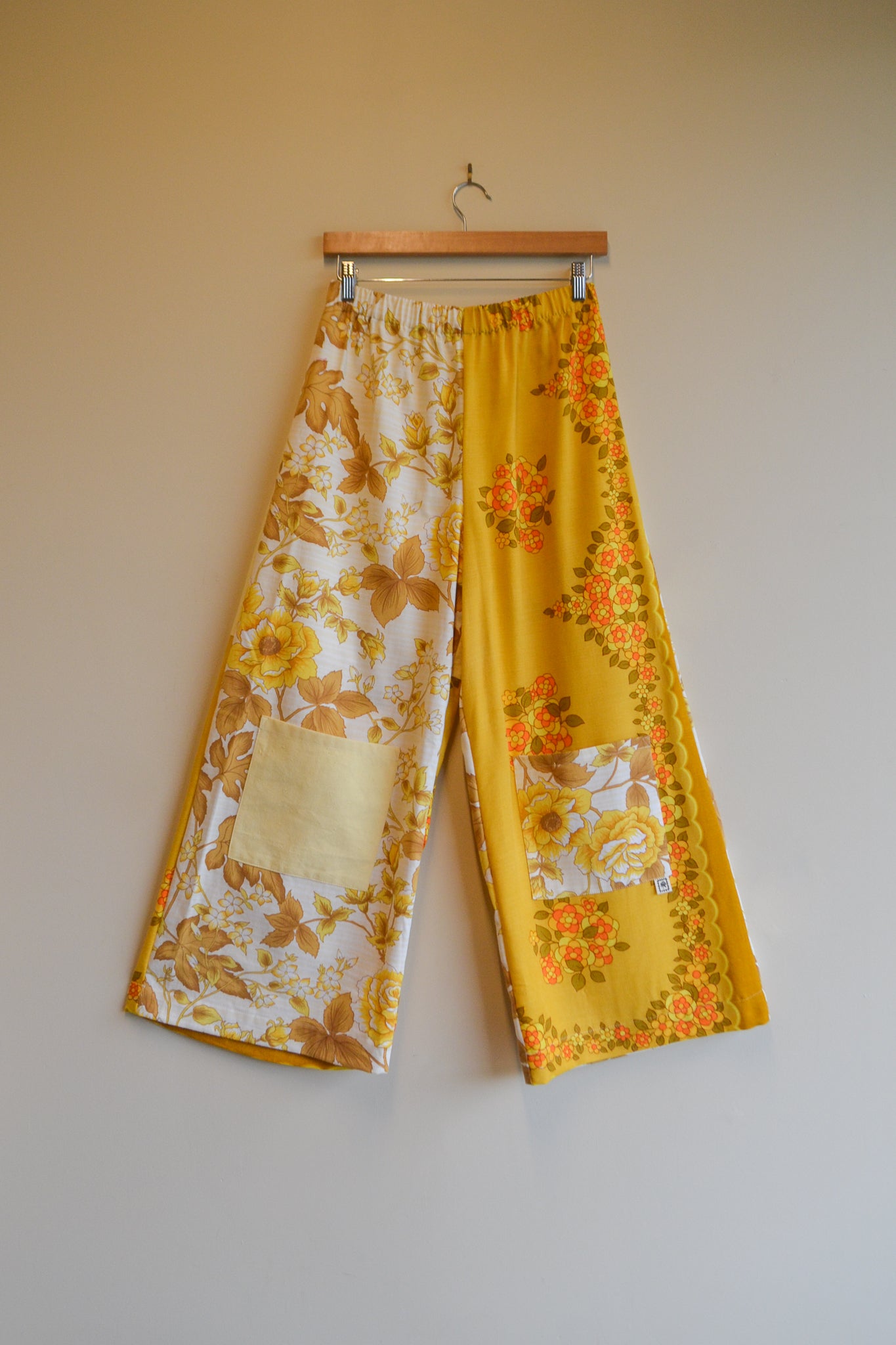 Our Marigold Pant are wide leg, high waist and a true one-of-a-kind statement piece. With our original playful design, A-line silhouette and patch pockets these pants provide ease and comfort. Crafted from vintage cotton fabric and mended table cloth.