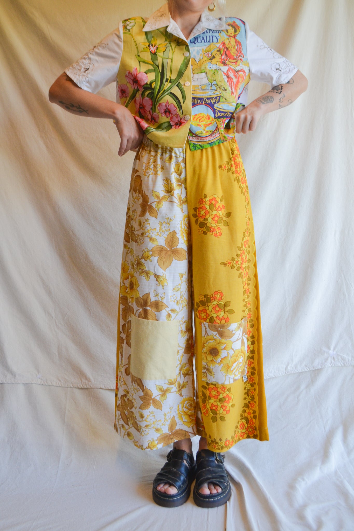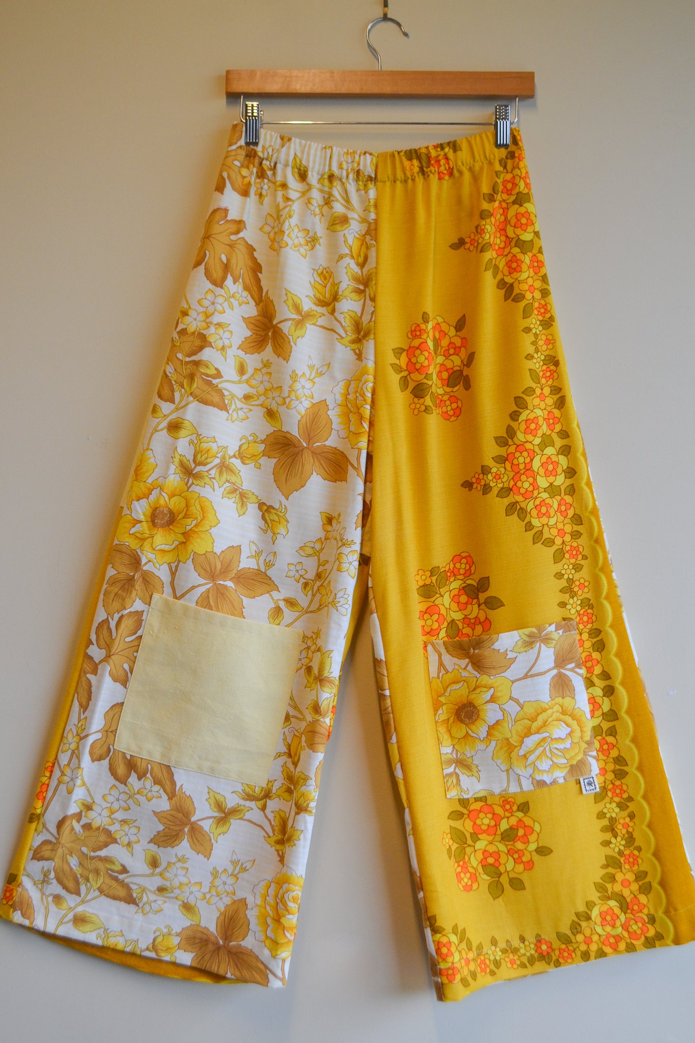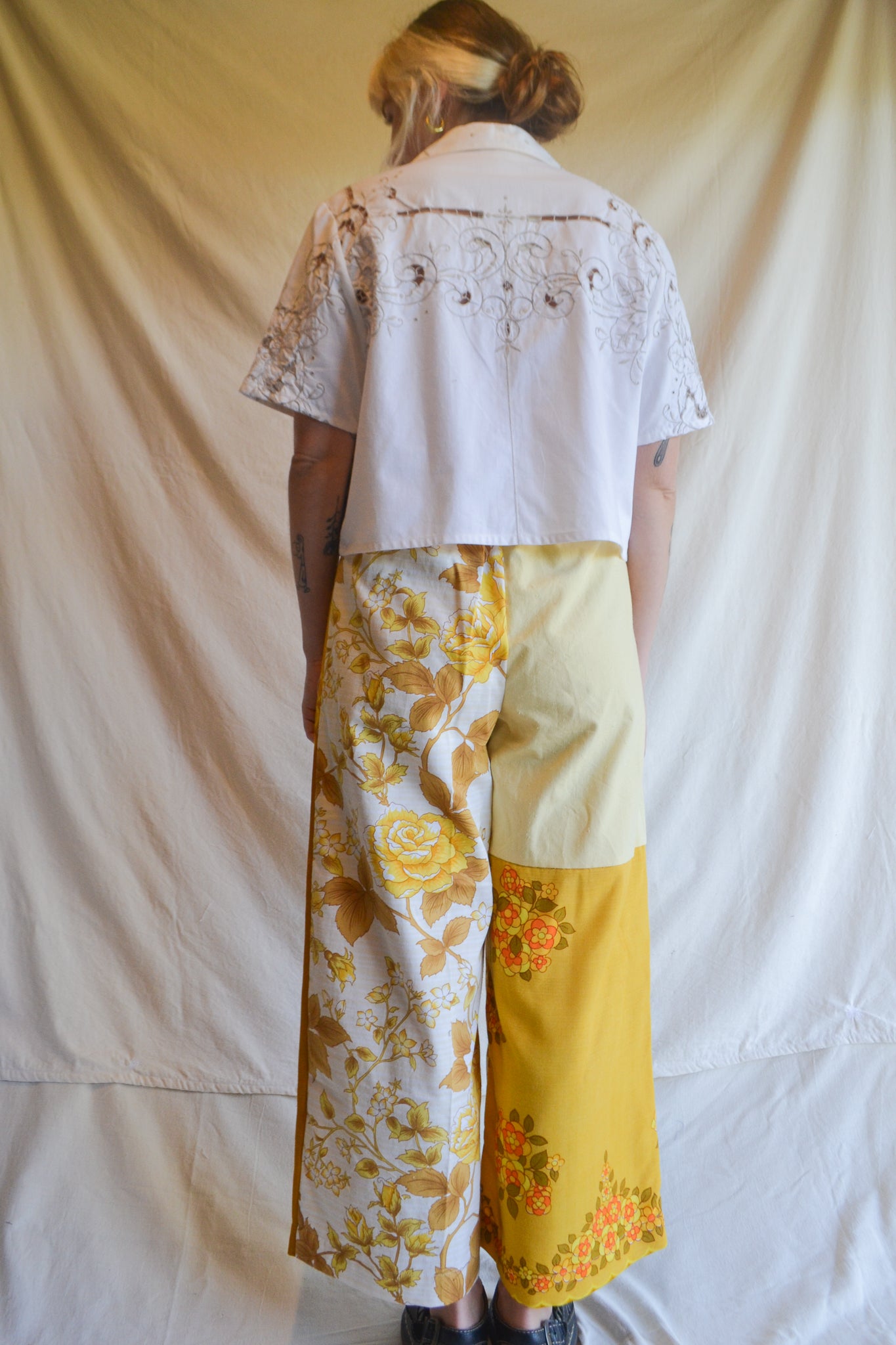 Our Marigold Pant are wide leg, high waist and a true one-of-a-kind statement piece. With our original playful design, A-line silhouette and patch pockets these pants provide ease and comfort. Crafted from vintage cotton fabric and mended table cloth.