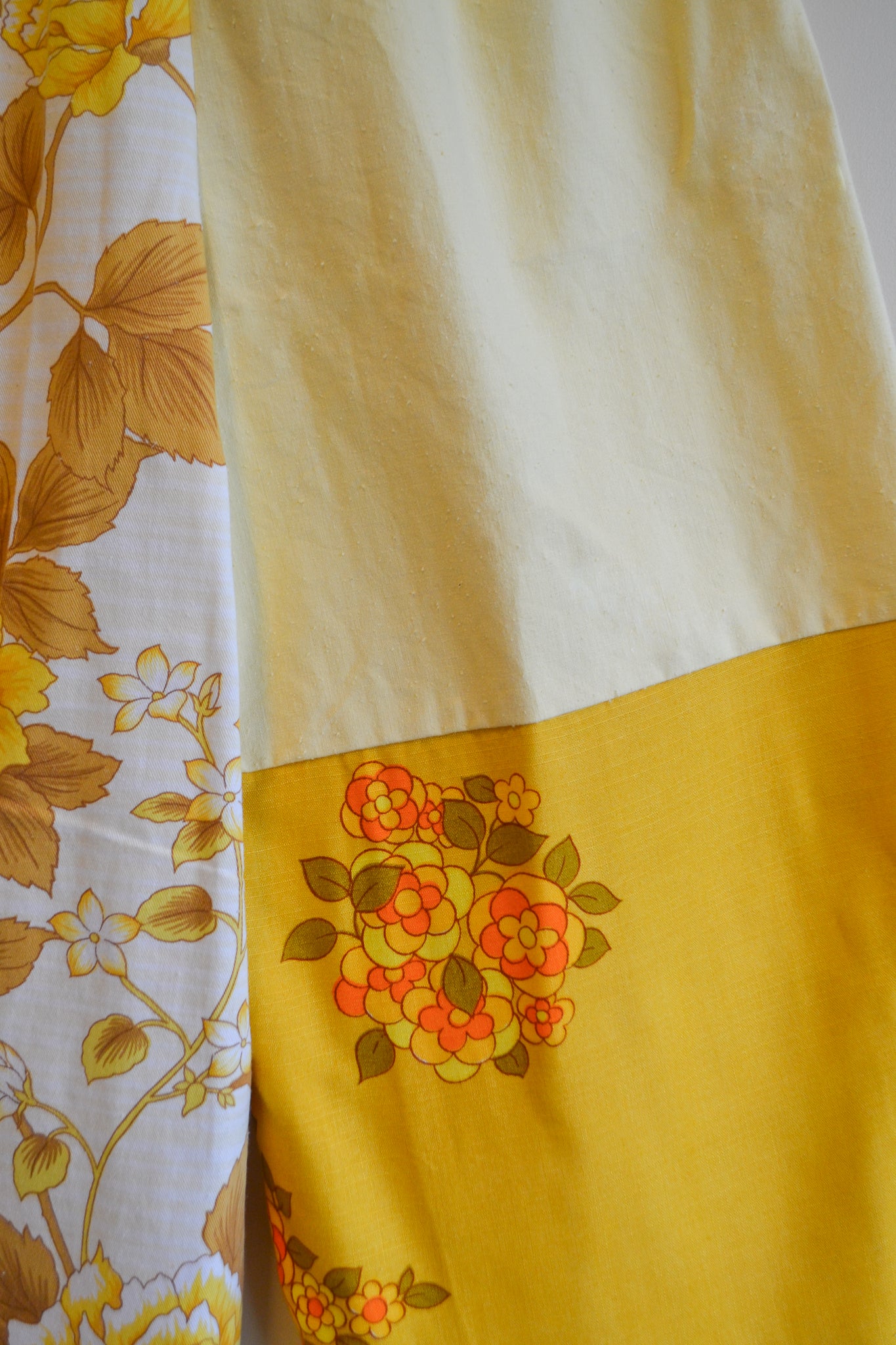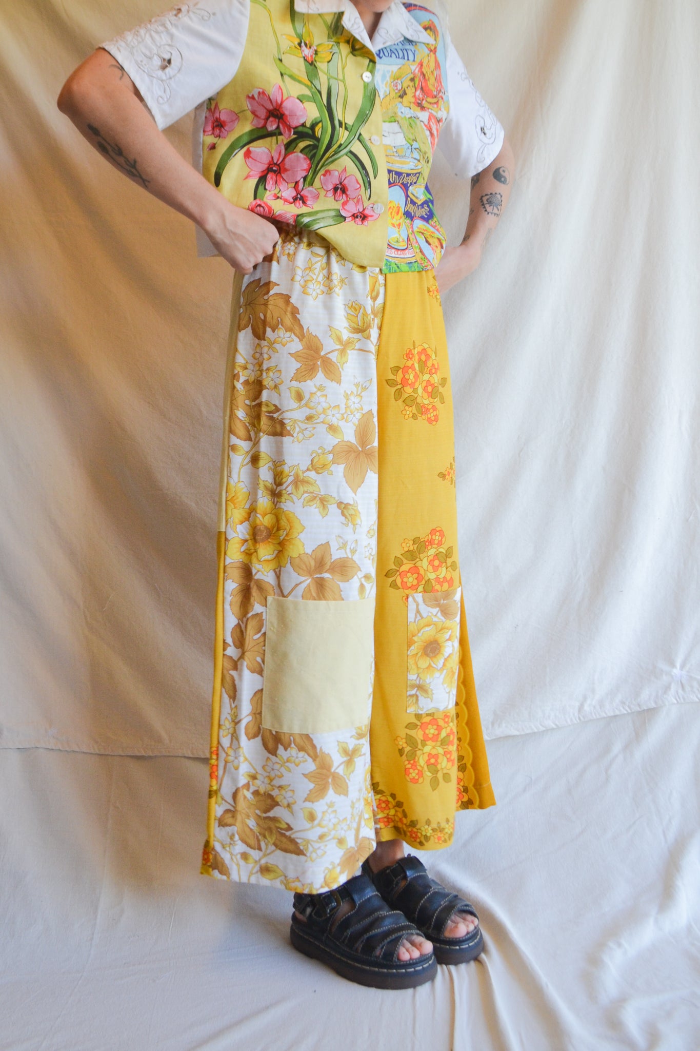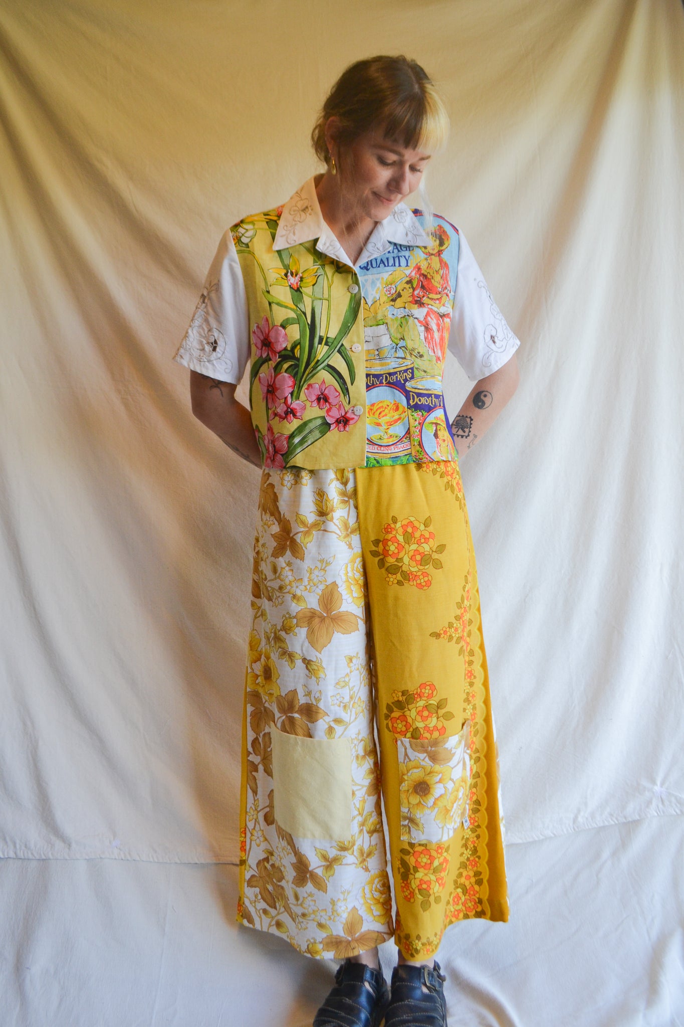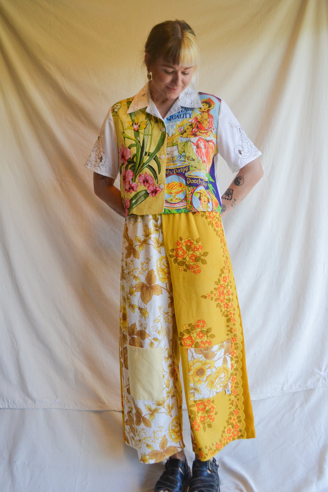 Our Marigold Pant are wide leg, high waist and a true one-of-a-kind statement piece. With our original playful design, A-line silhouette and patch pockets these pants provide ease and comfort. Crafted from vintage cotton fabric and mended table cloth.