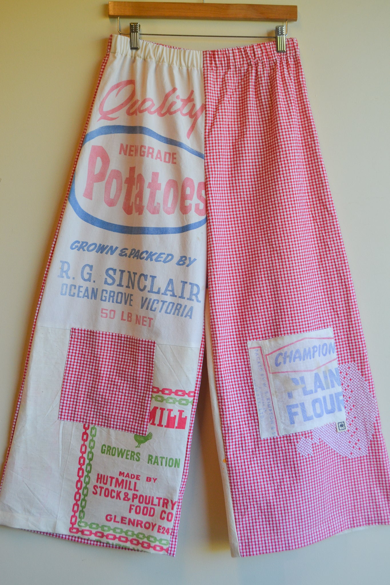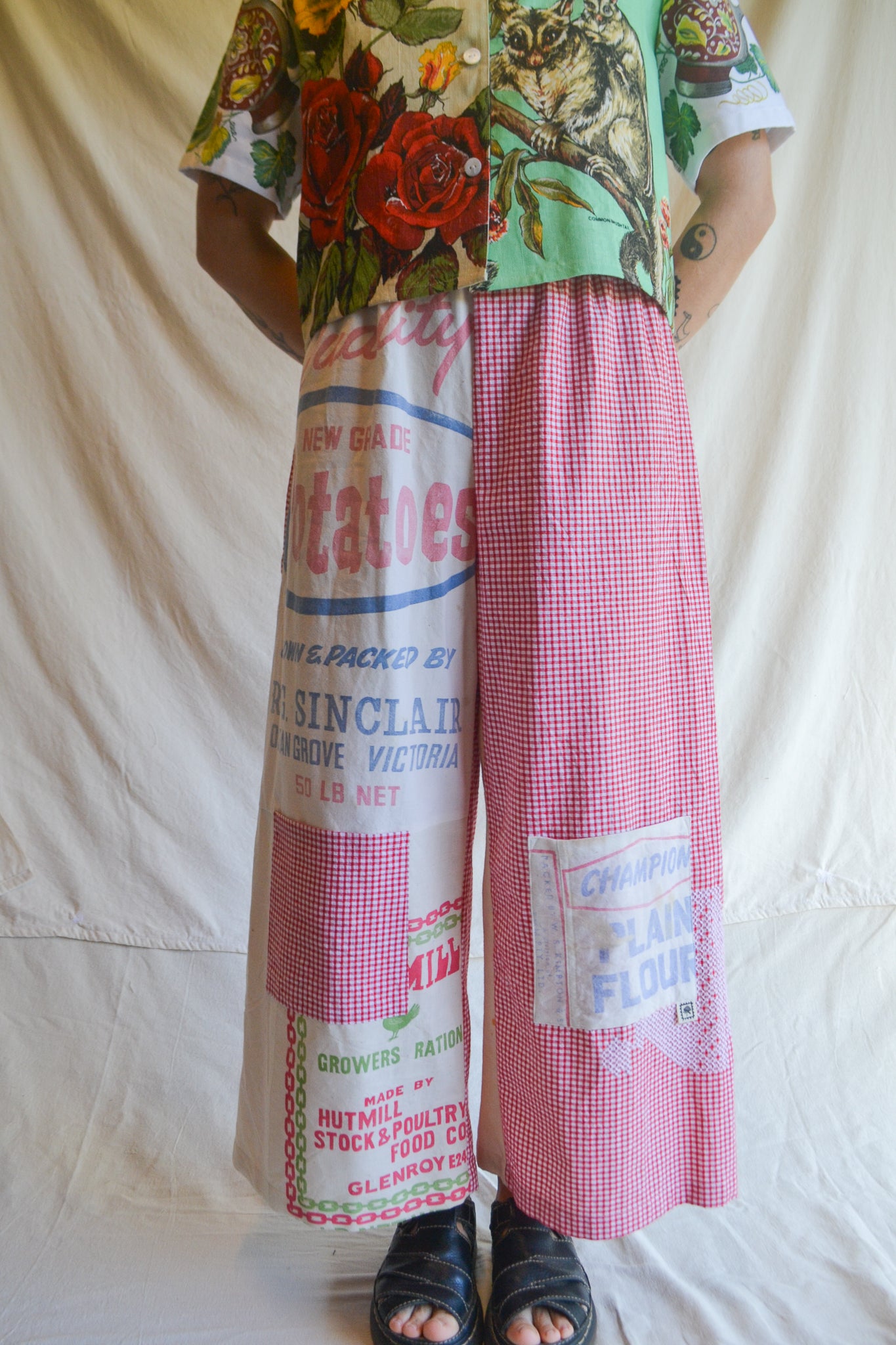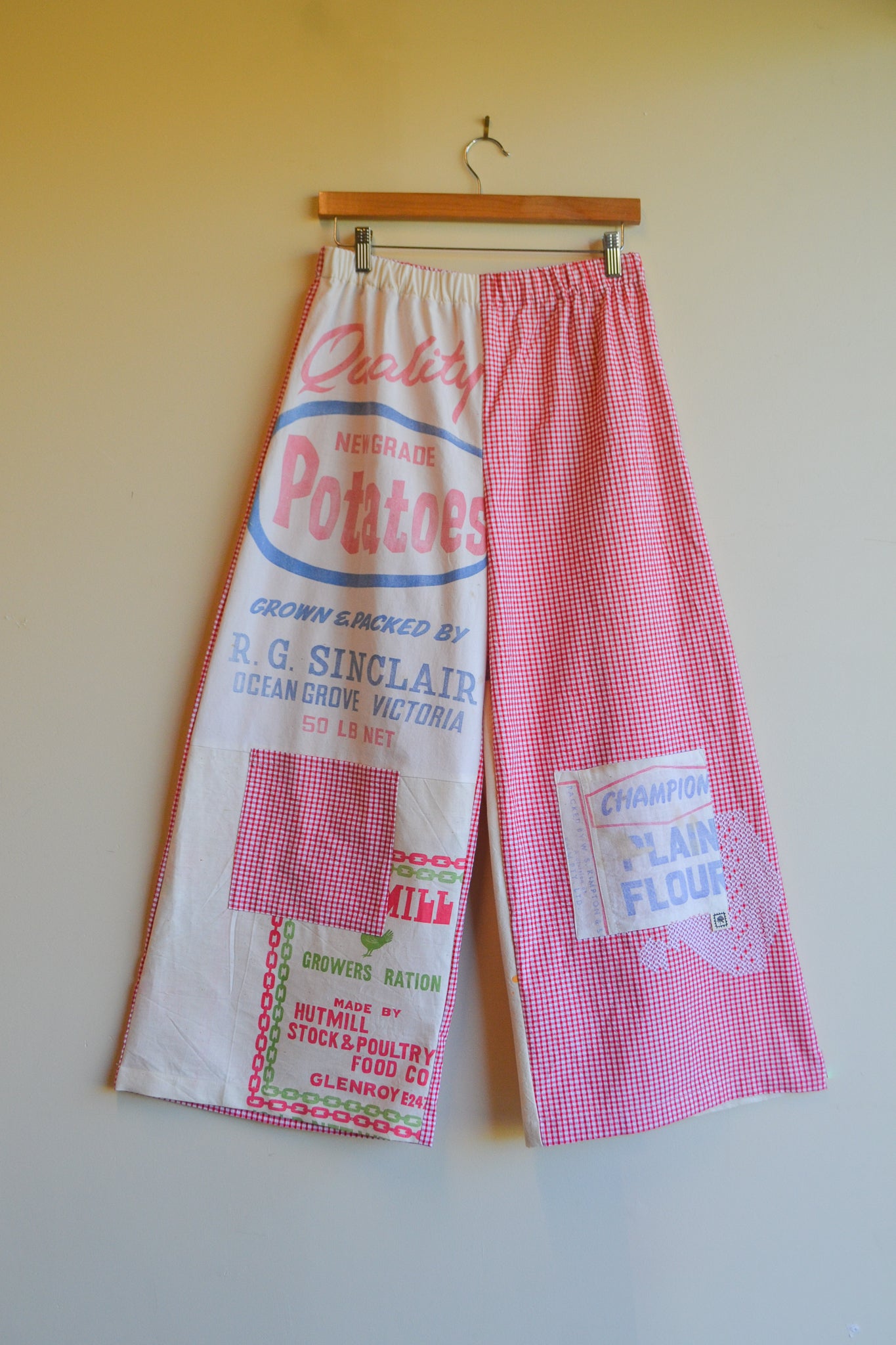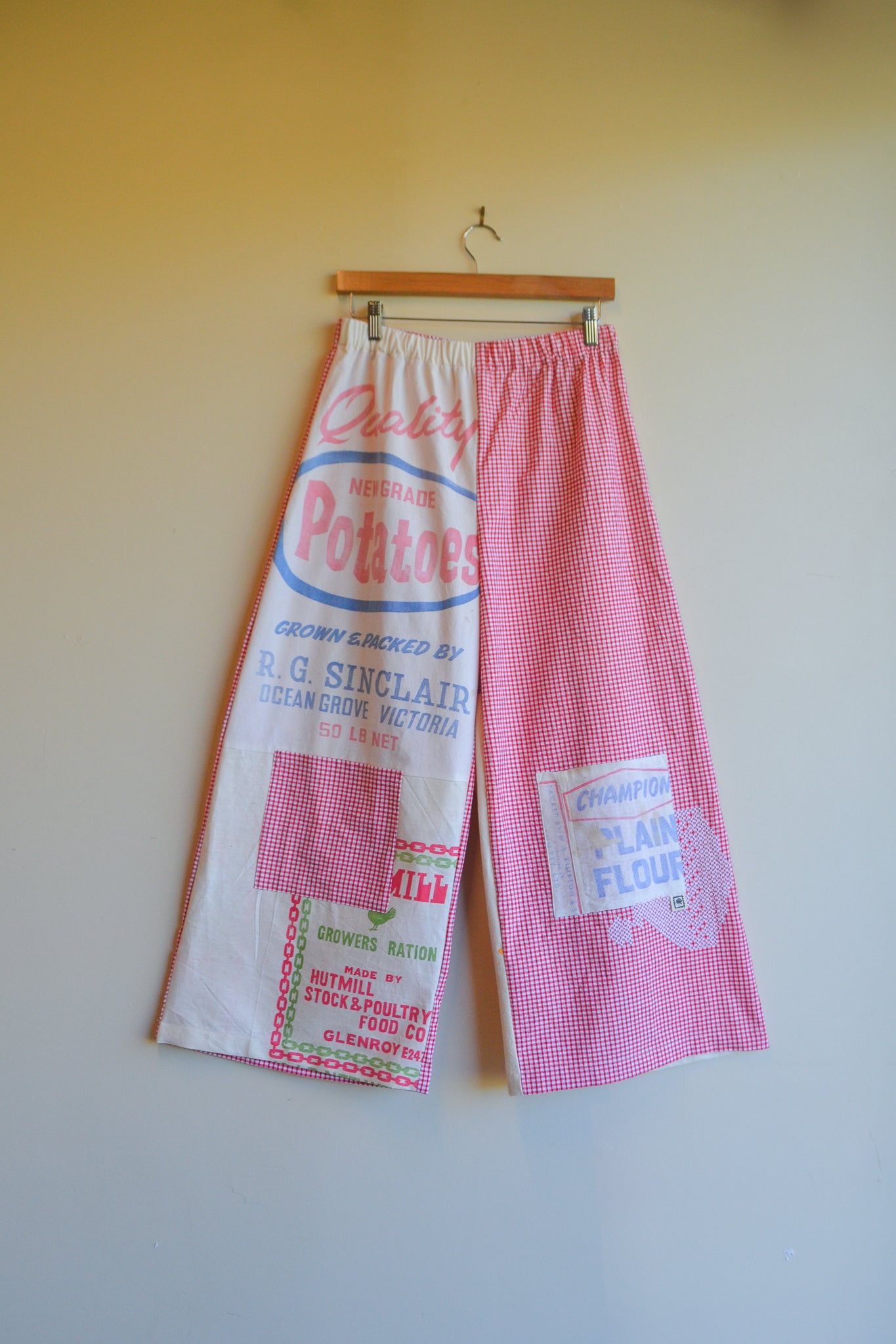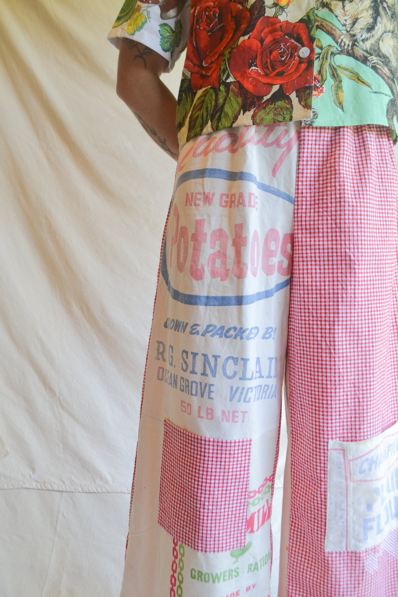 Our Quality Potatoes, wide leg, high waist patch pants are a true one-of-a-kind statement piece. With our original playful design, A-line silhouette and patch pockets these pants provide ease and comfort. Crafted from vintage fabric and heritage flour sacks.