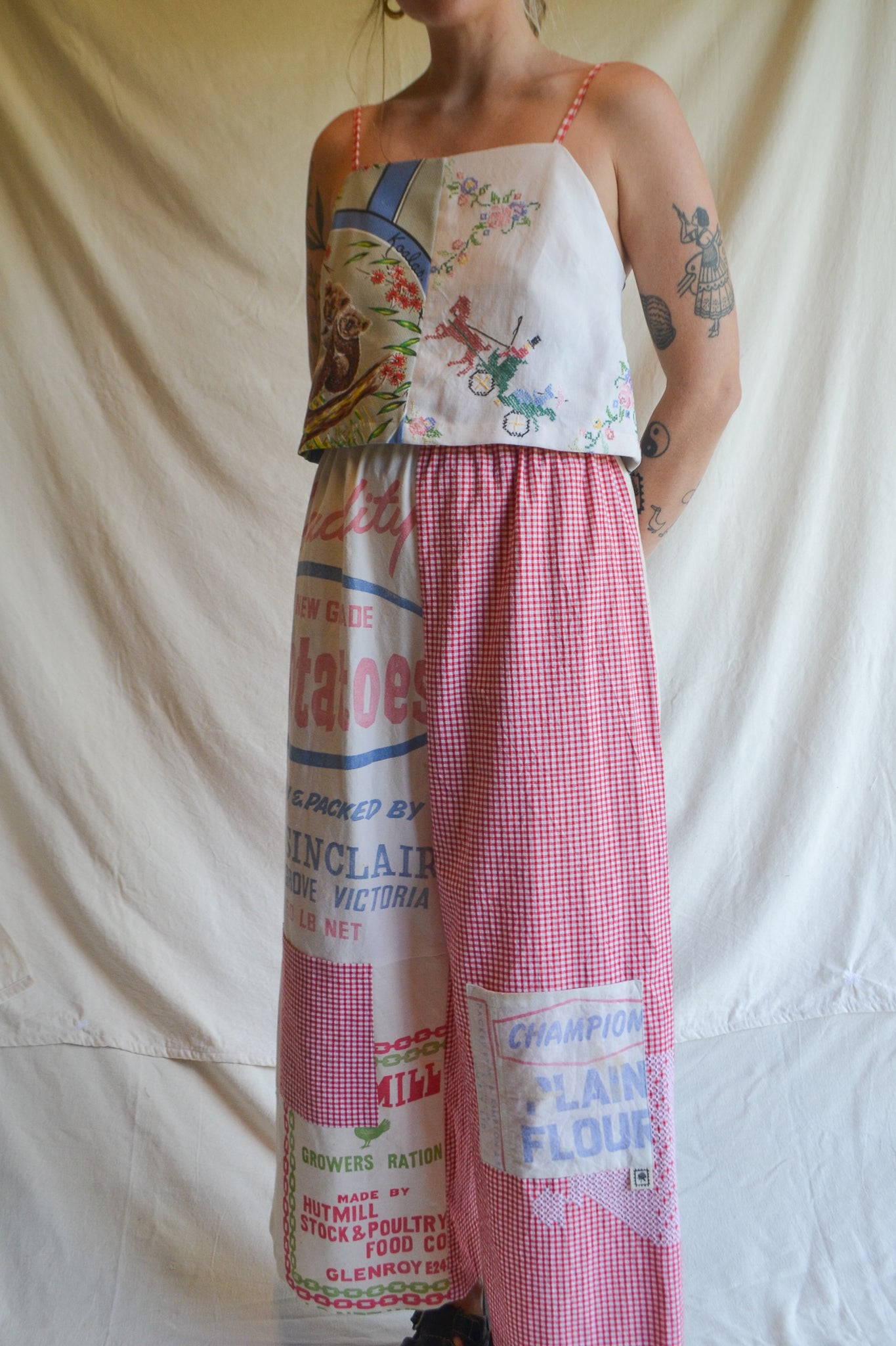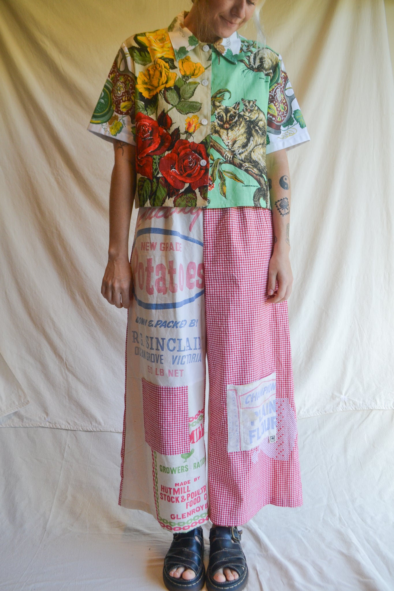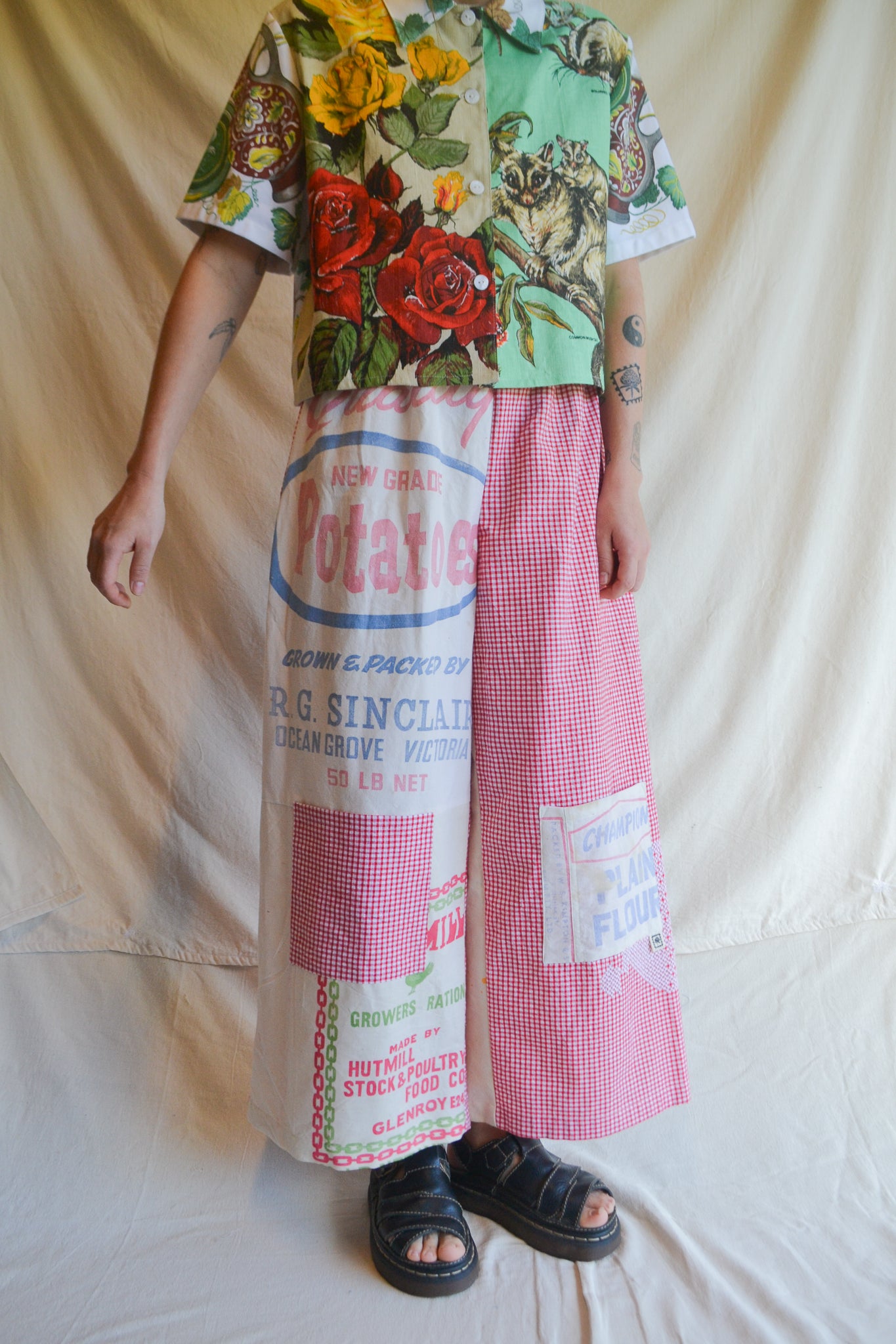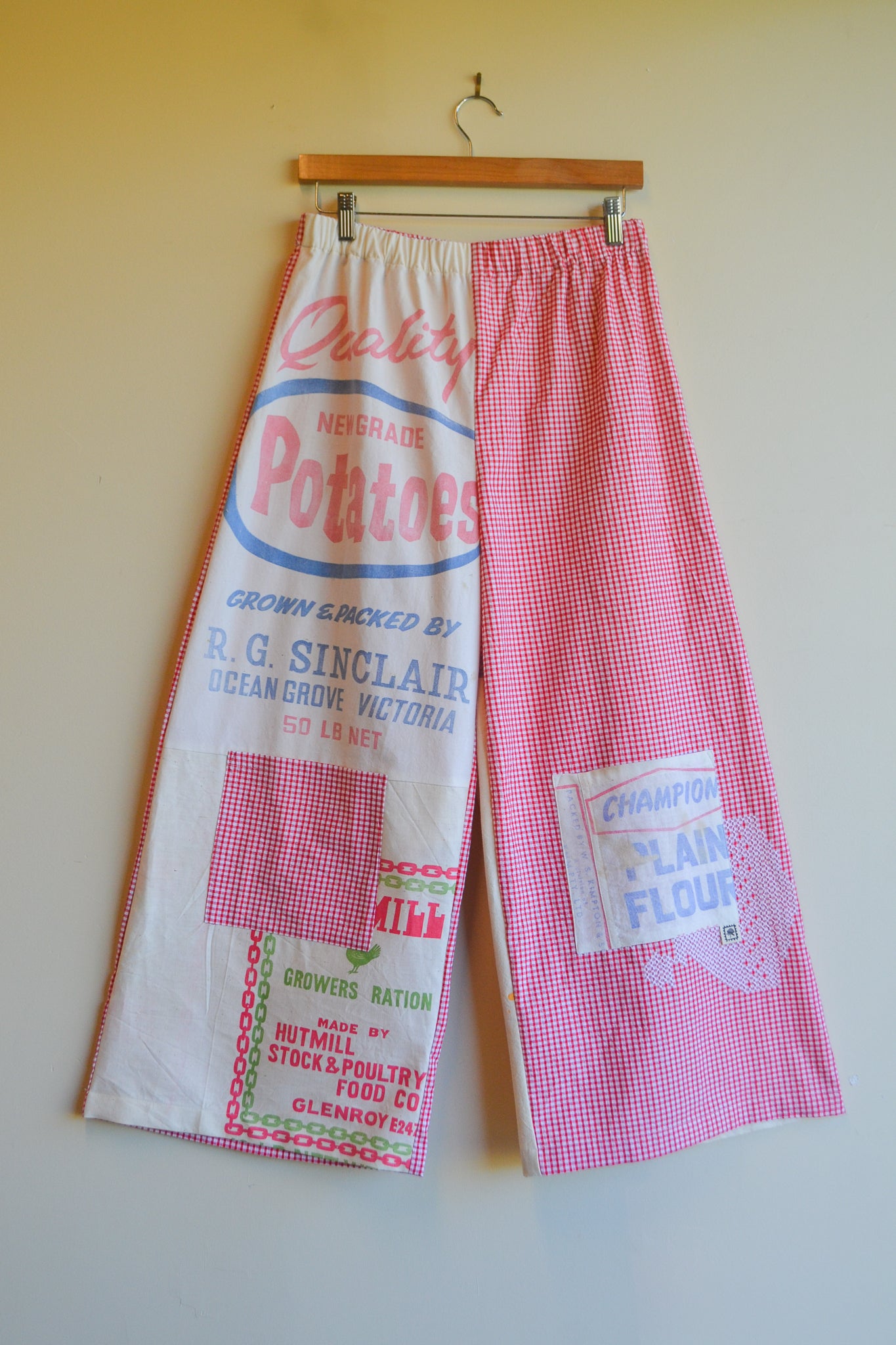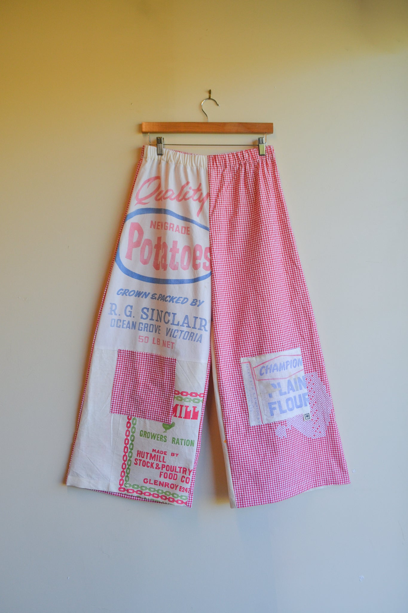 Our Quality Potatoes, wide leg, high waist patch pants are a true one-of-a-kind statement piece. With our original playful design, A-line silhouette and patch pockets these pants provide ease and comfort. Crafted from vintage fabric and heritage flour sacks.
