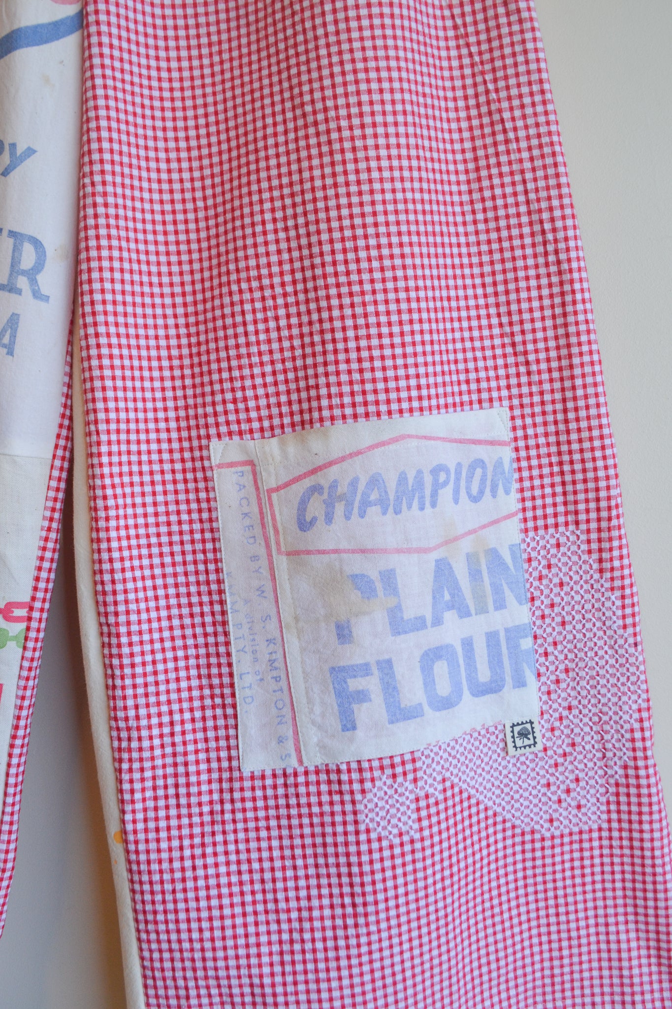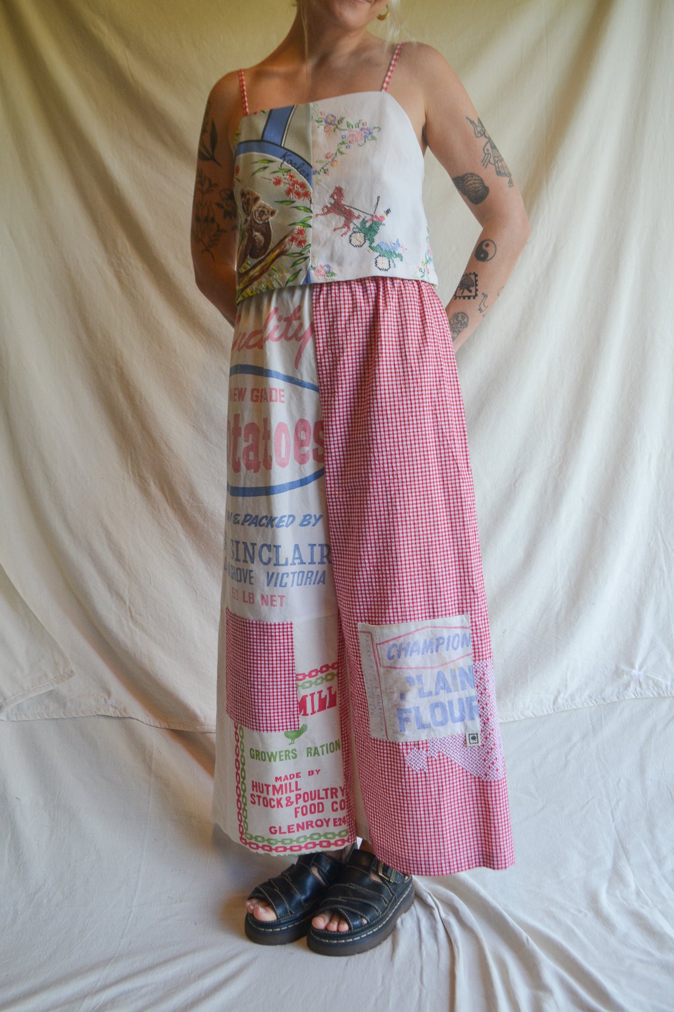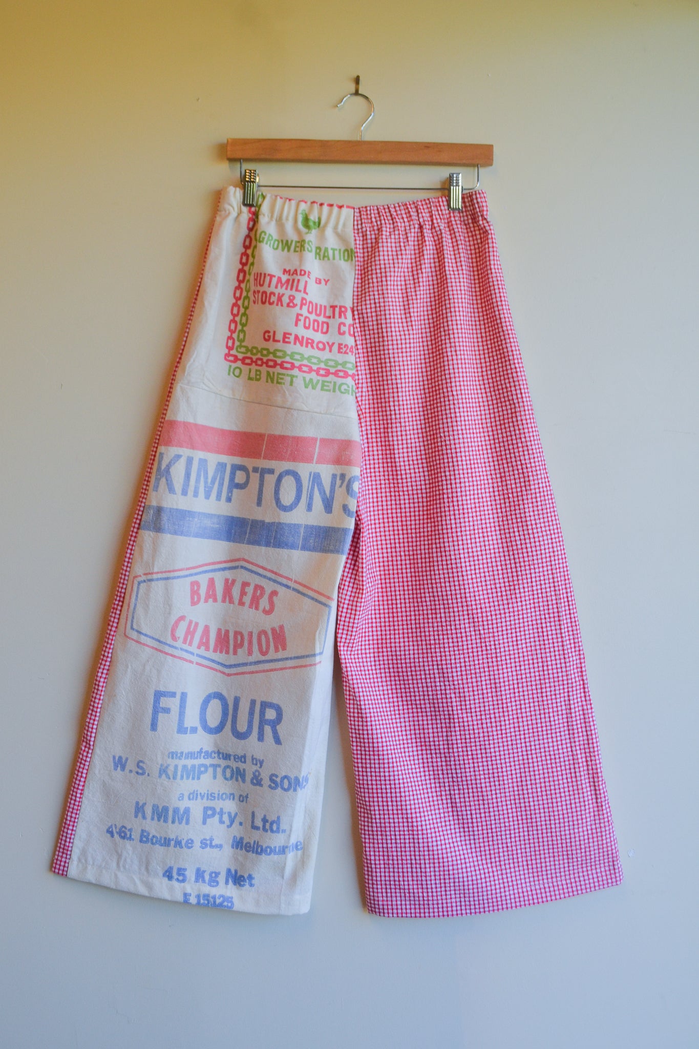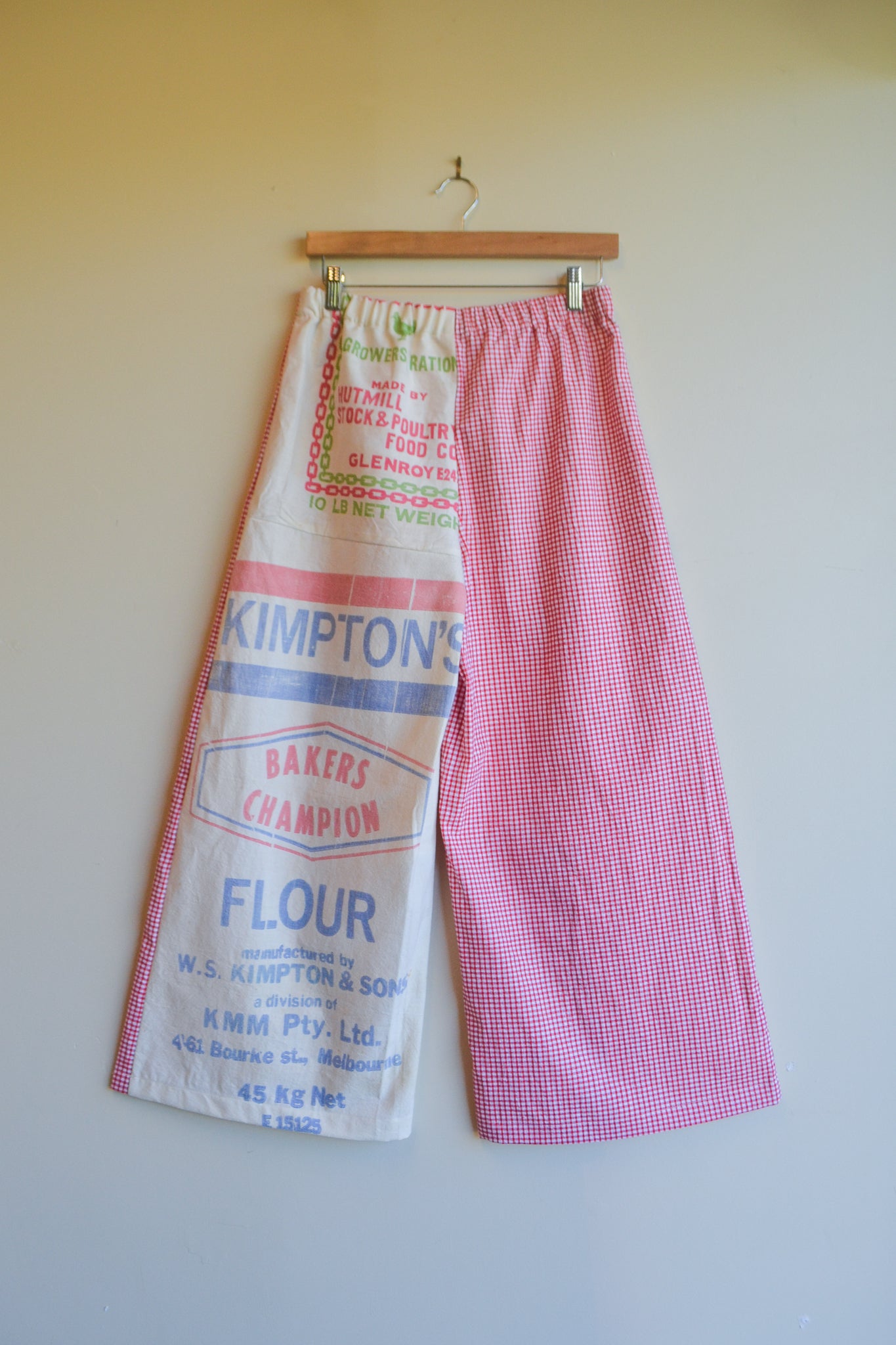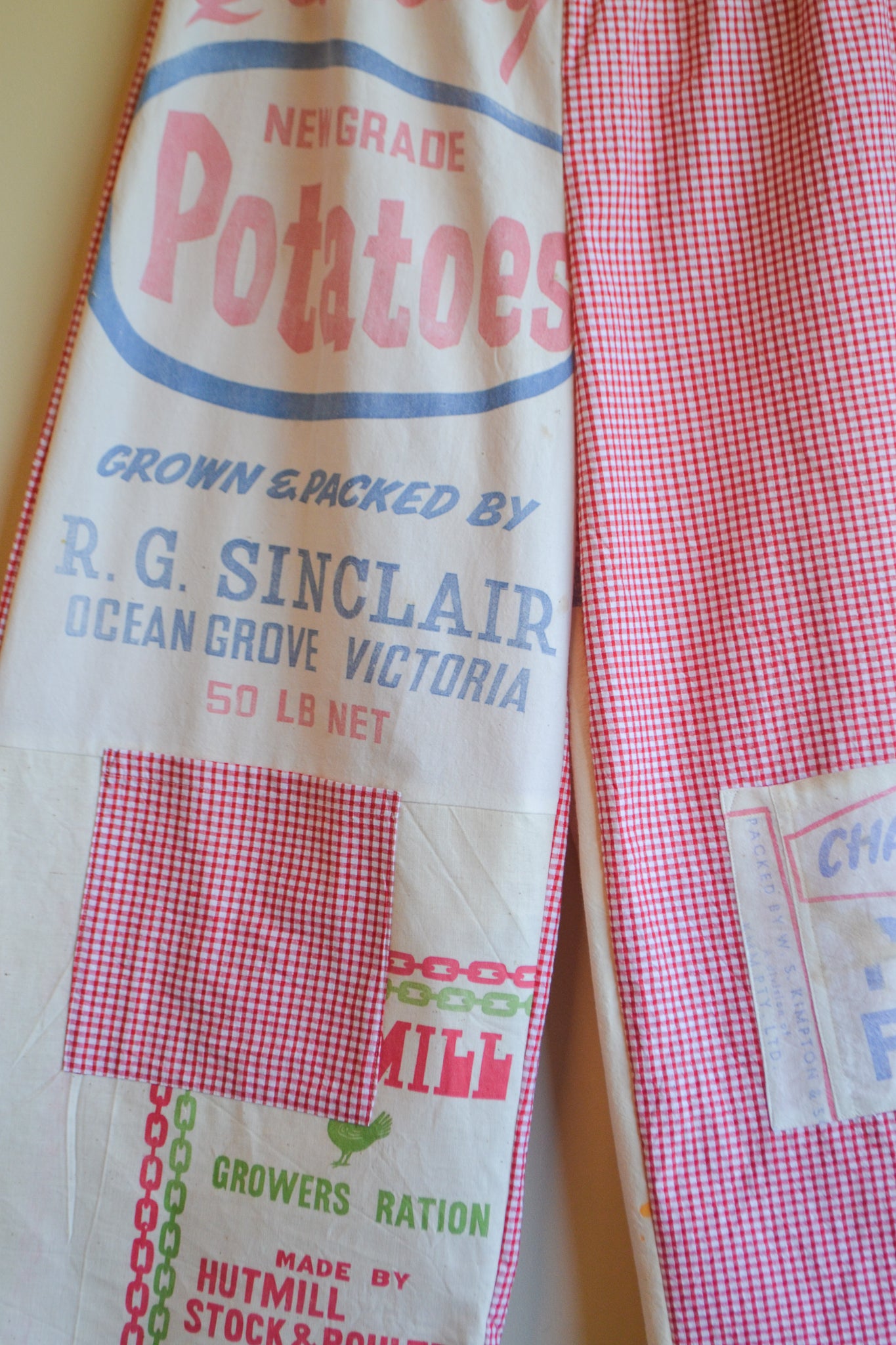 Our Quality Potatoes, wide leg, high waist patch pants are a true one-of-a-kind statement piece. With our original playful design, A-line silhouette and patch pockets these pants provide ease and comfort. Crafted from vintage fabric and heritage flour sacks.