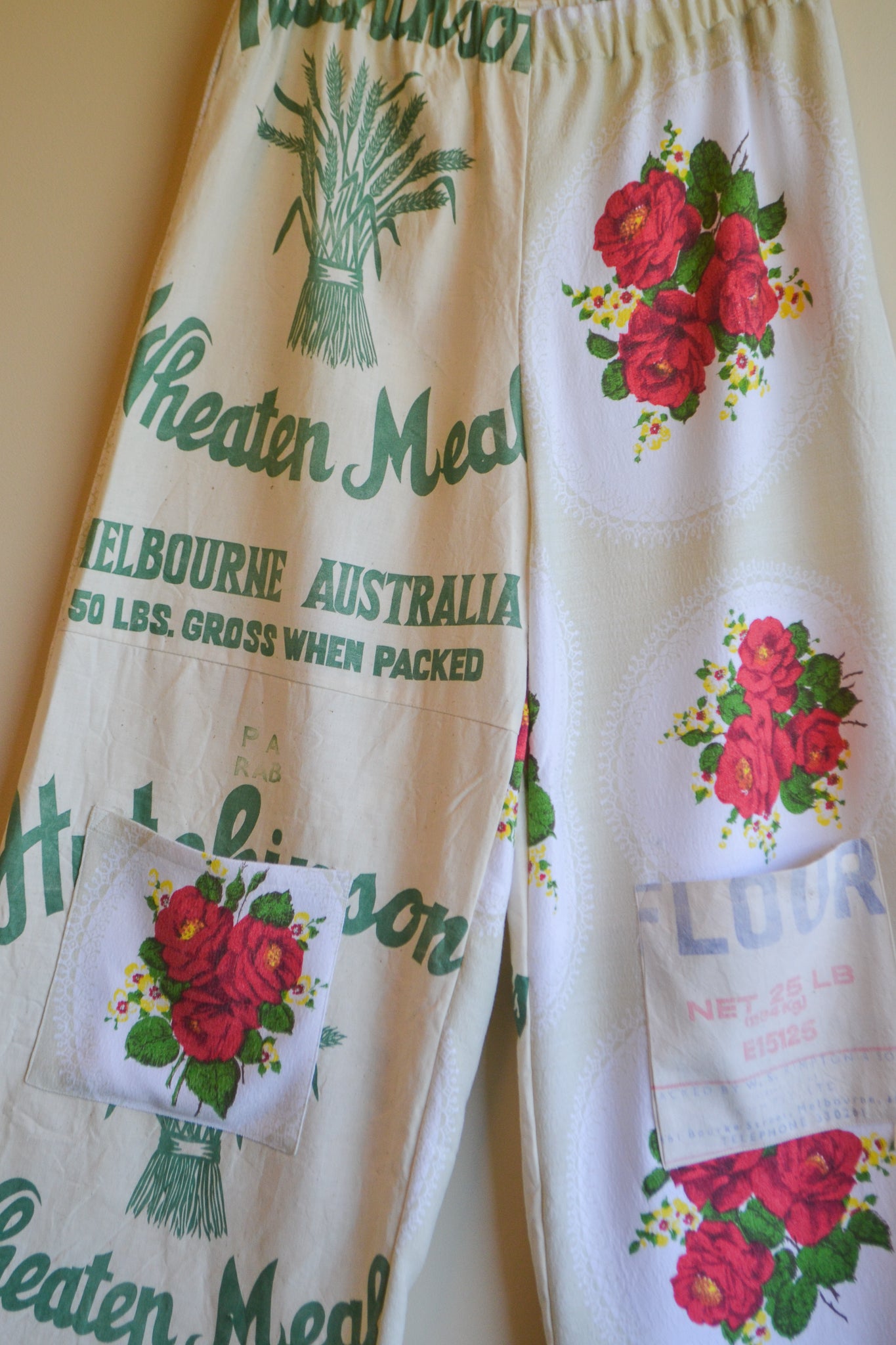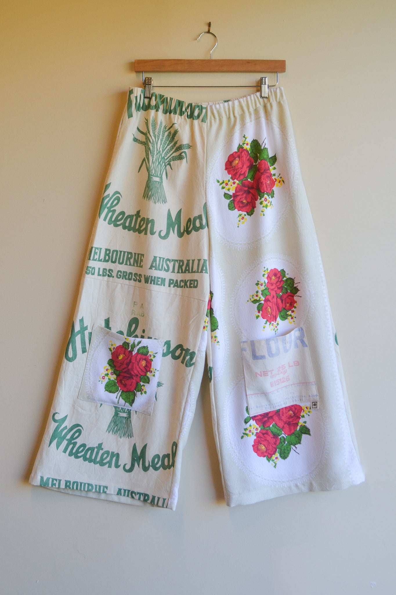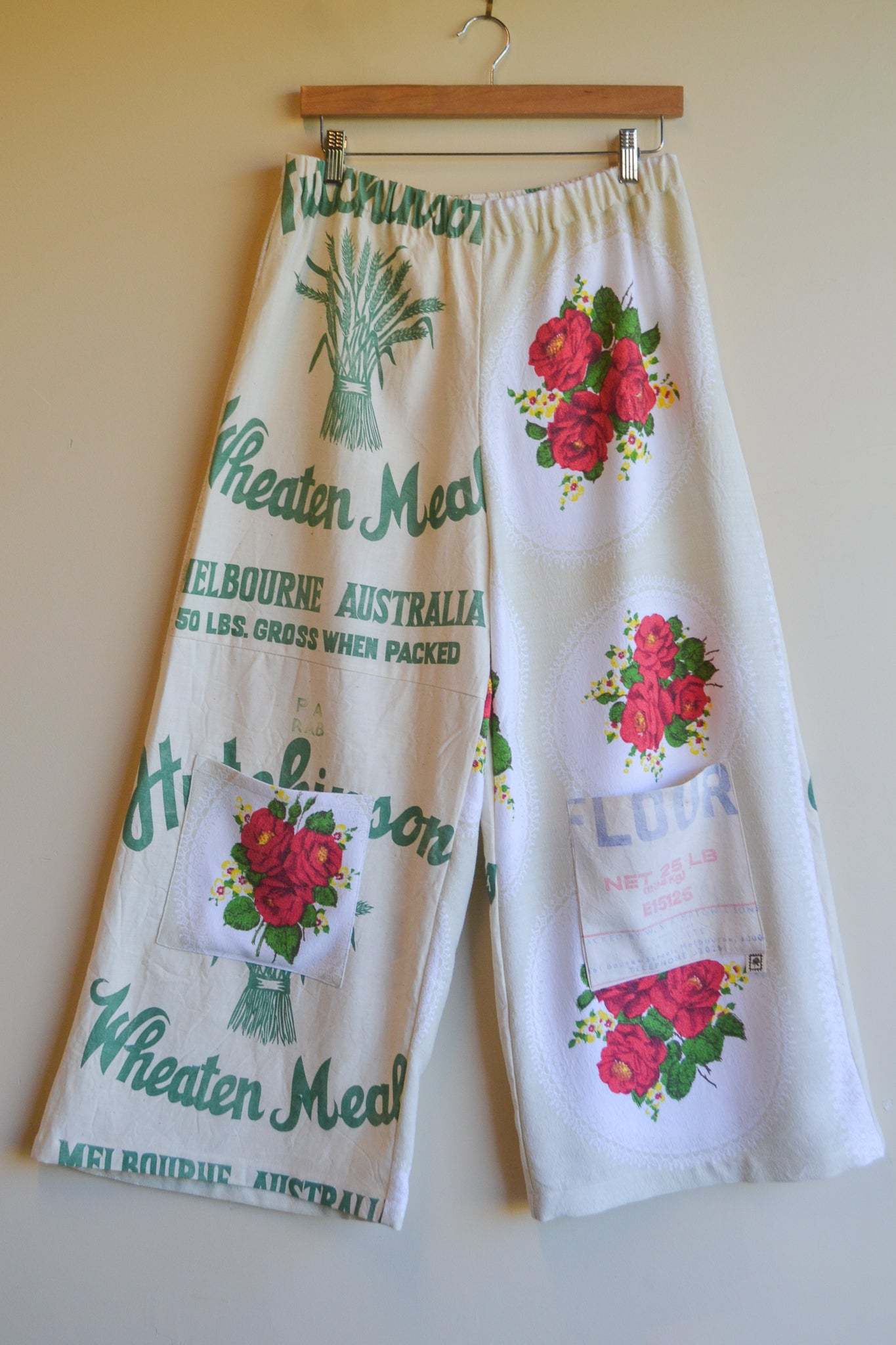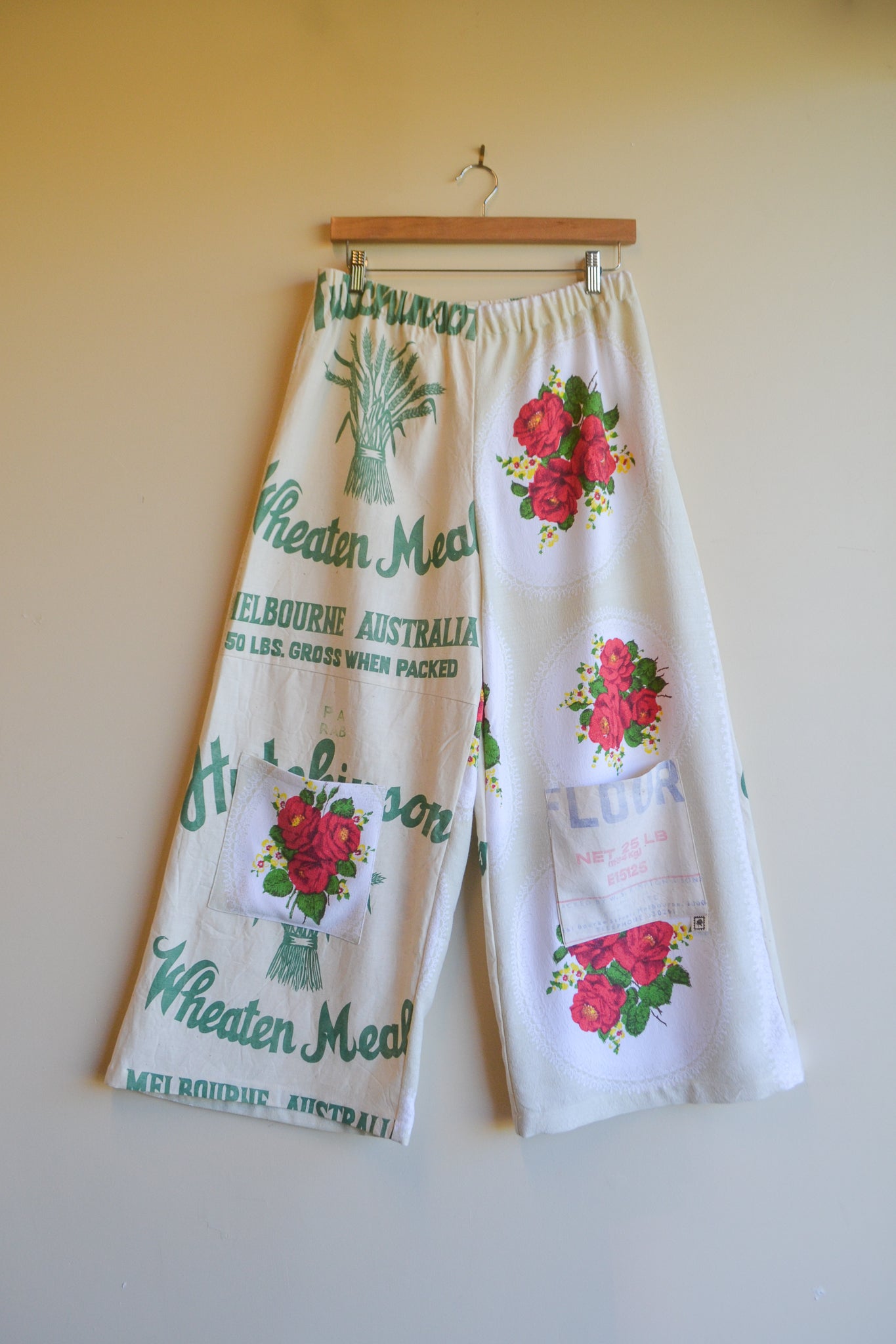 Our Wheaten Roses are wide leg, high waist and a true one-of-a-kind statement piece. With our original playful design, A-line silhouette and patch pockets these pants provide ease and comfort. Crafted from mended table cloth and heritage flour sacks.