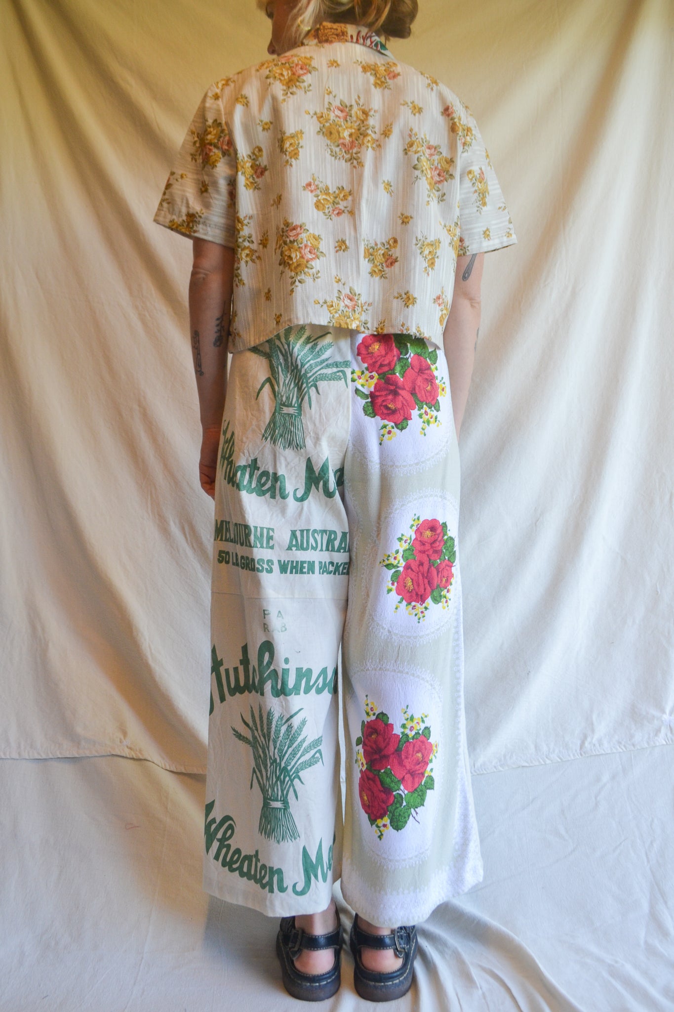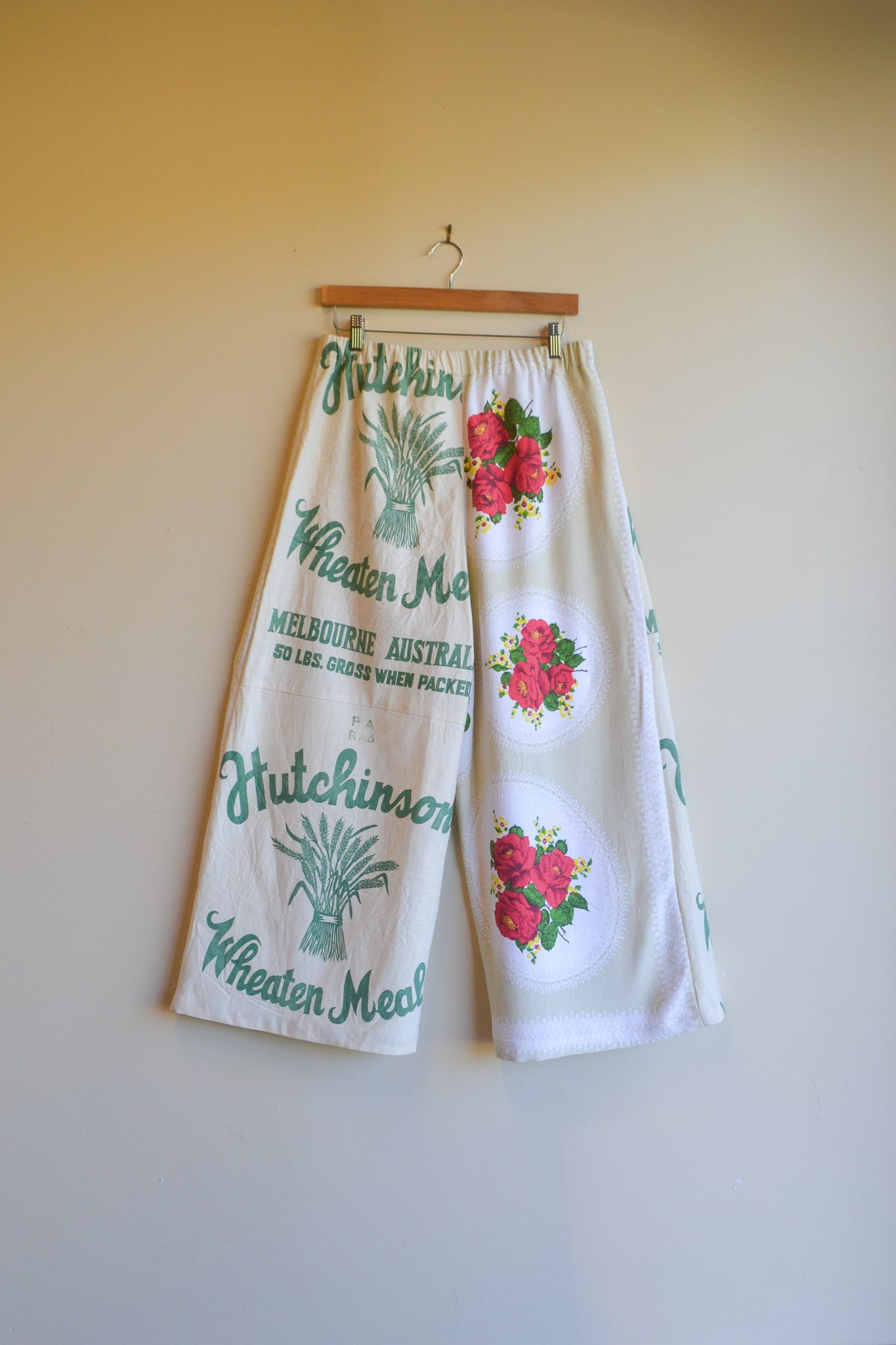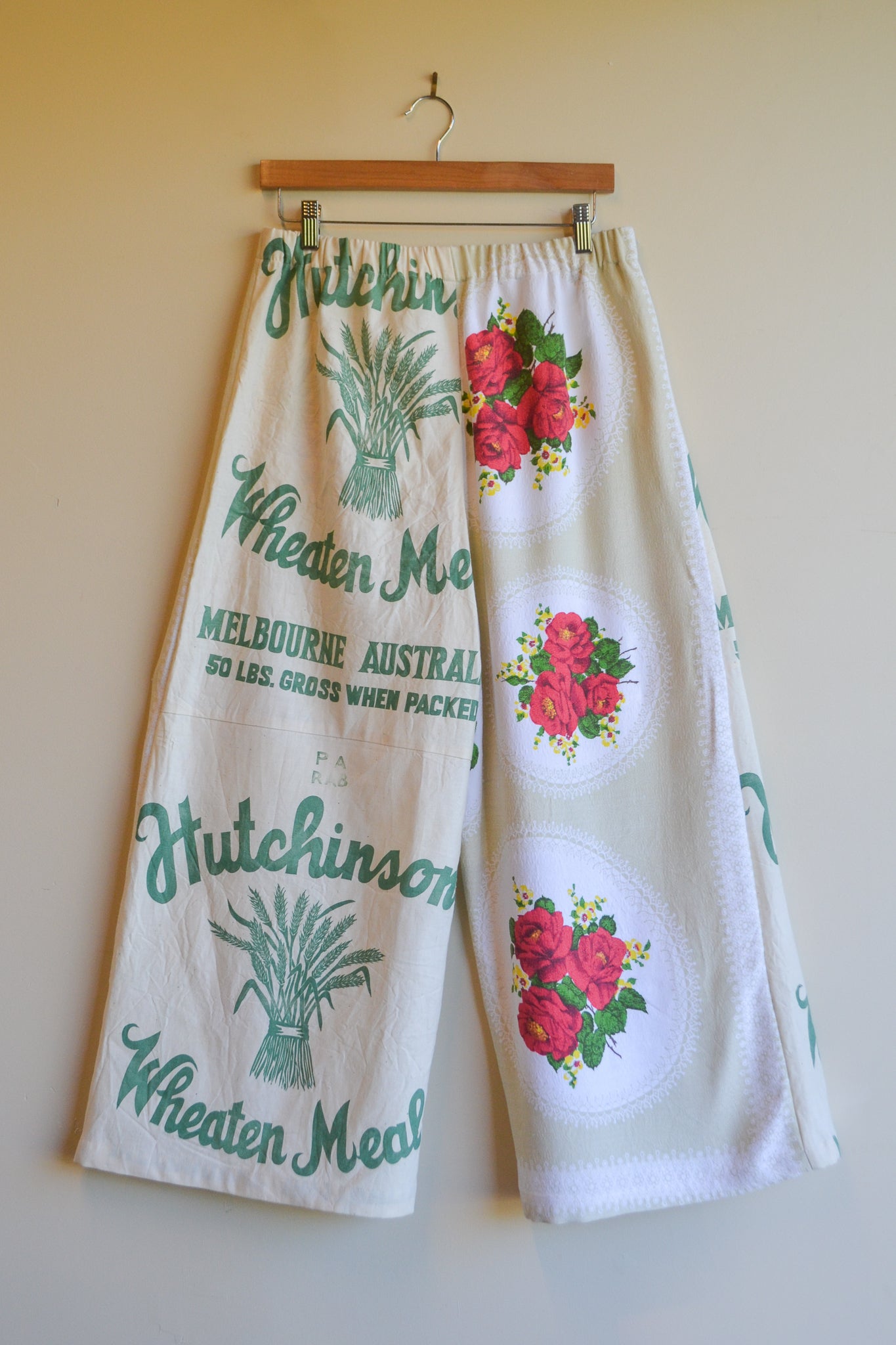 Our Wheaten Roses are wide leg, high waist and a true one-of-a-kind statement piece. With our original playful design, A-line silhouette and patch pockets these pants provide ease and comfort. Crafted from mended table cloth and heritage flour sacks.