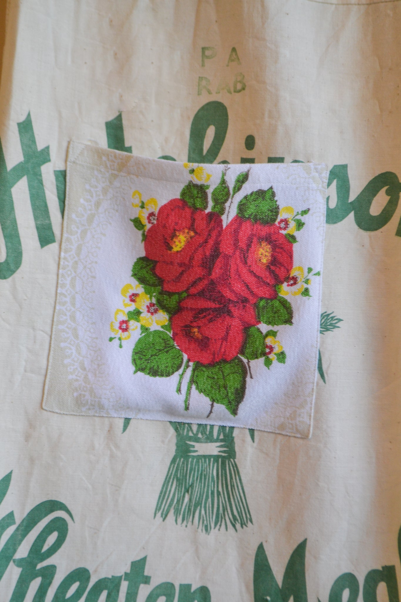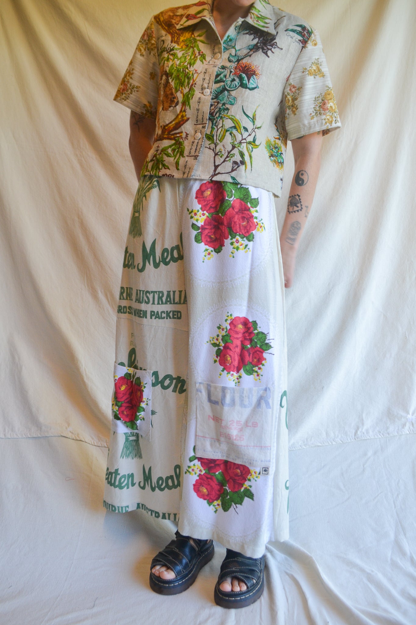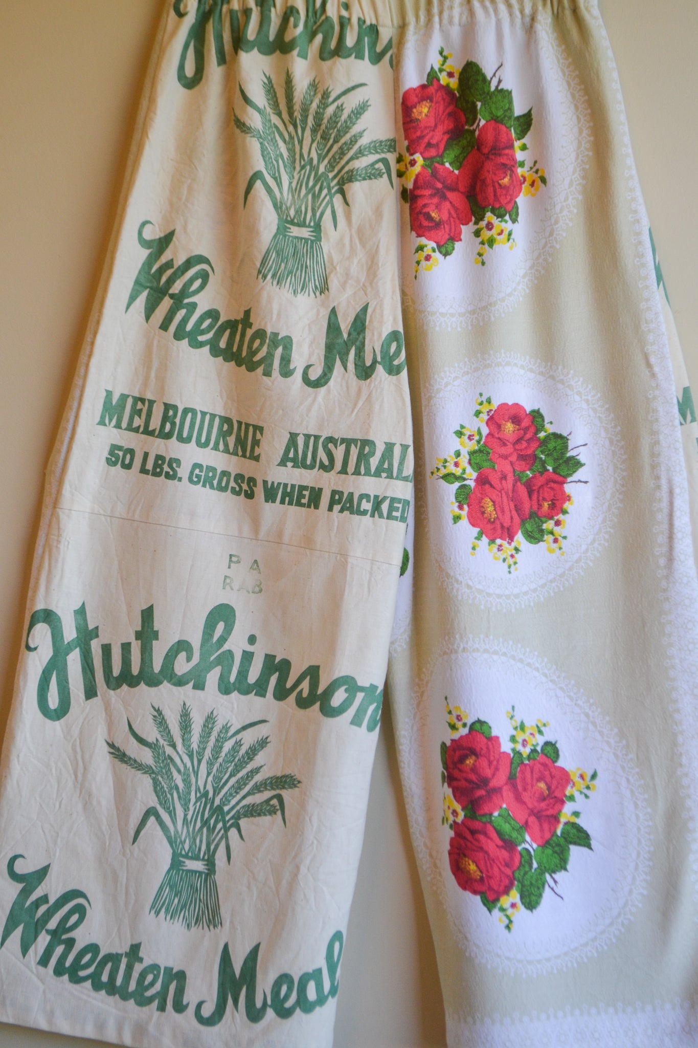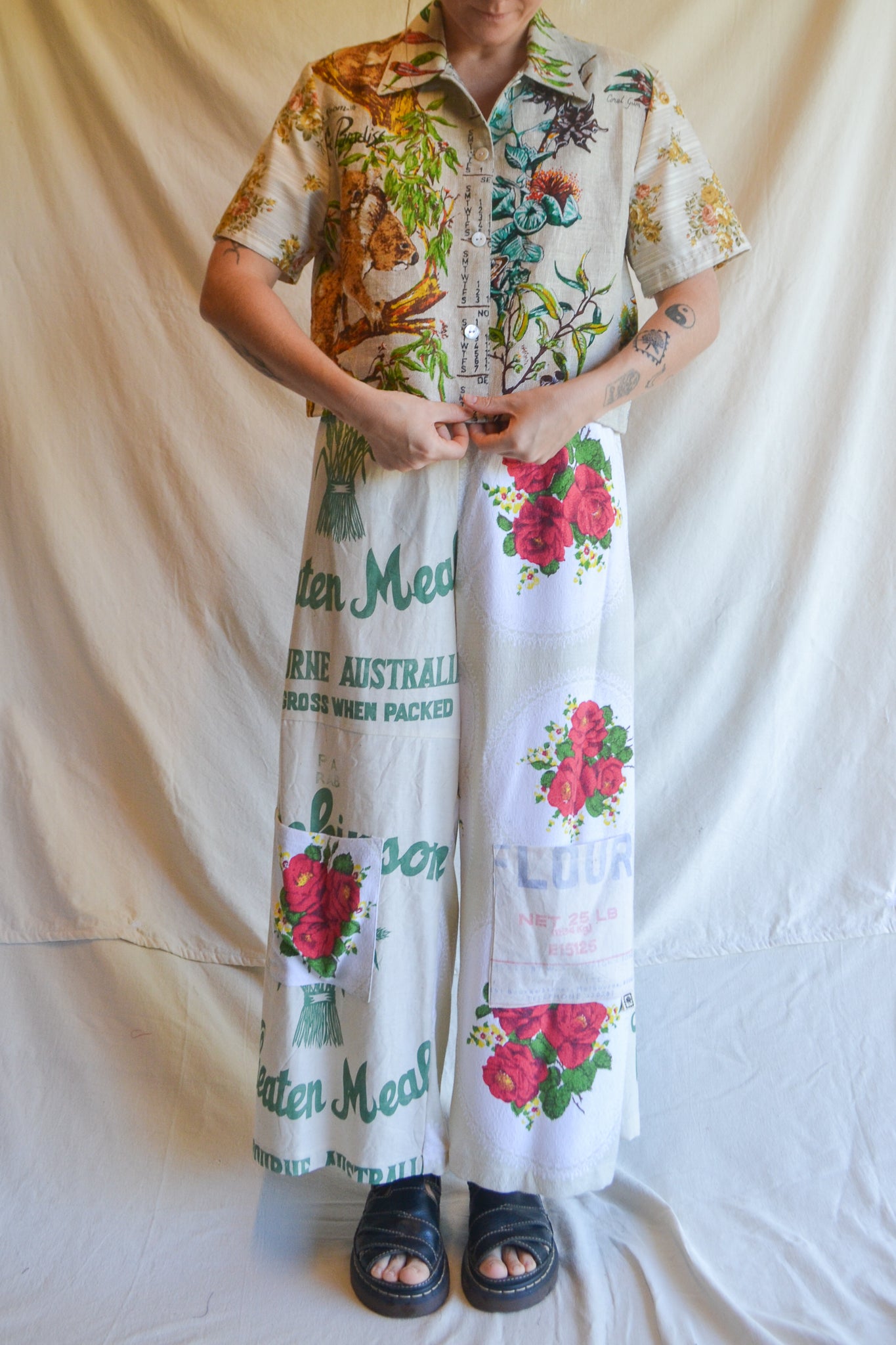 Our Wheaten Roses are wide leg, high waist and a true one-of-a-kind statement piece. With our original playful design, A-line silhouette and patch pockets these pants provide ease and comfort. Crafted from mended table cloth and heritage flour sacks.