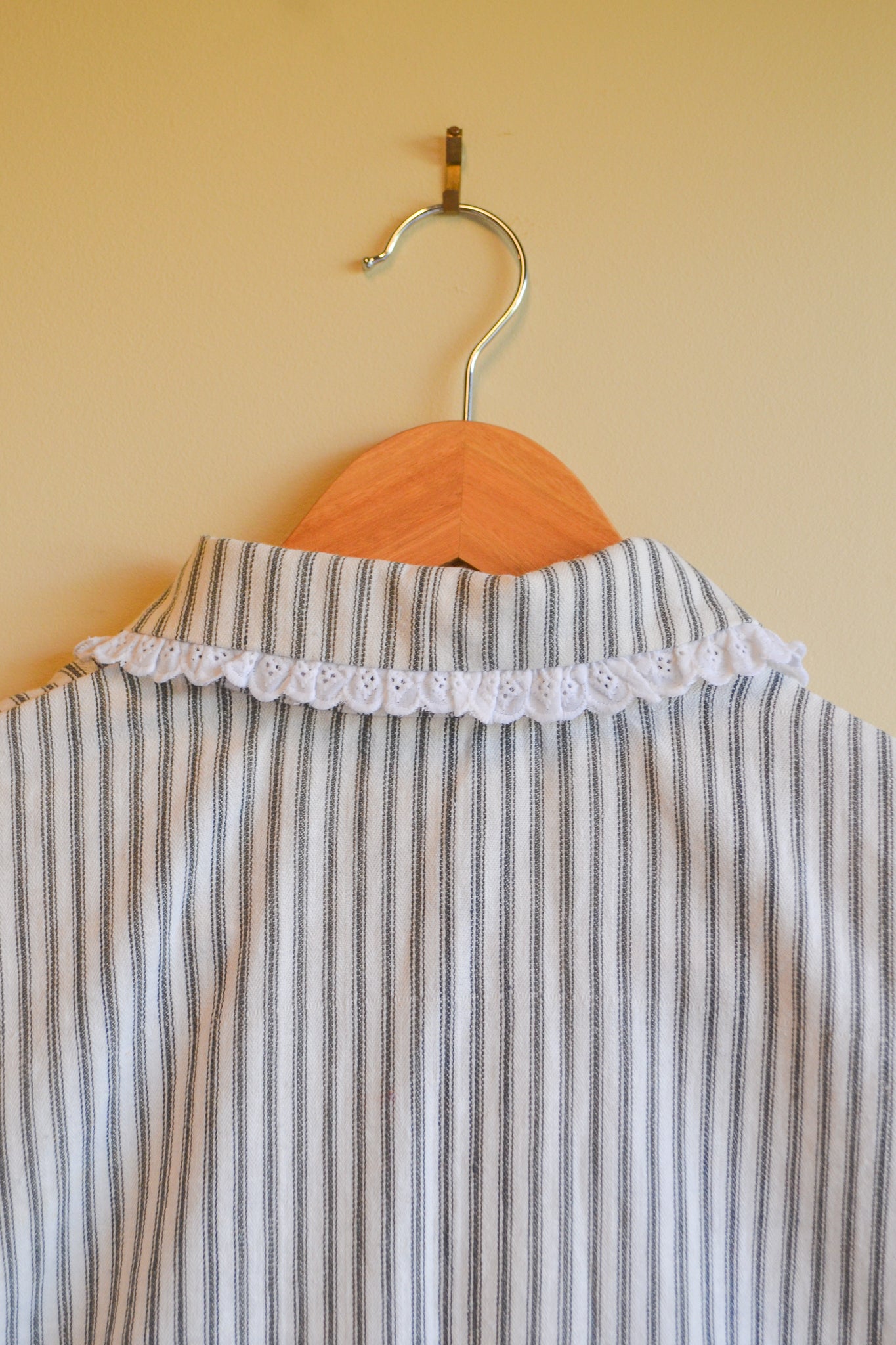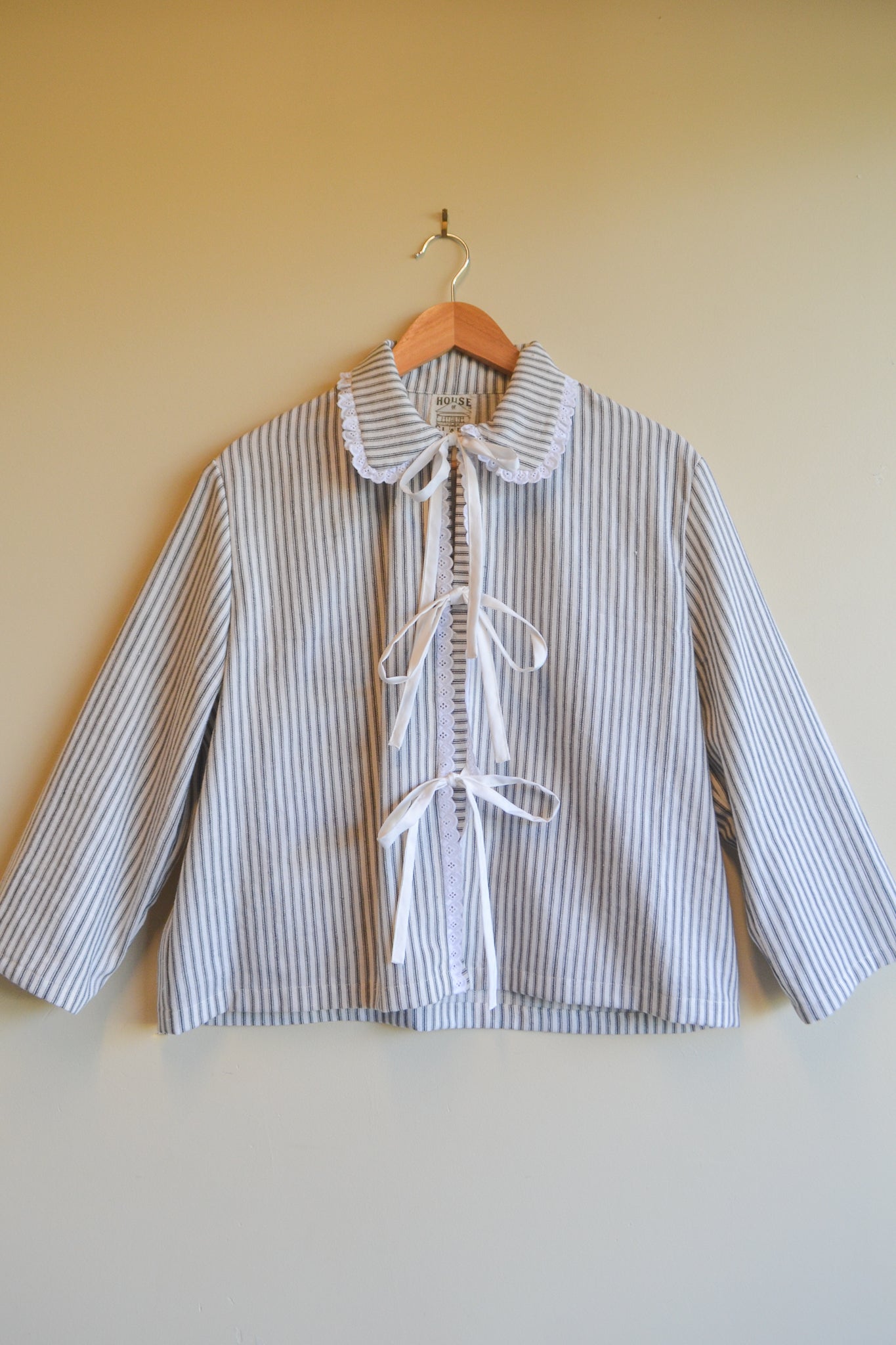 This Long Sleeve white Tie Top is delicately crafted from a vintage, cotton lace table cloth. Featuring 2 elegant ties at center front. This tie top is a timeless piece, has rounded collar tips and is one-of-a-kind.