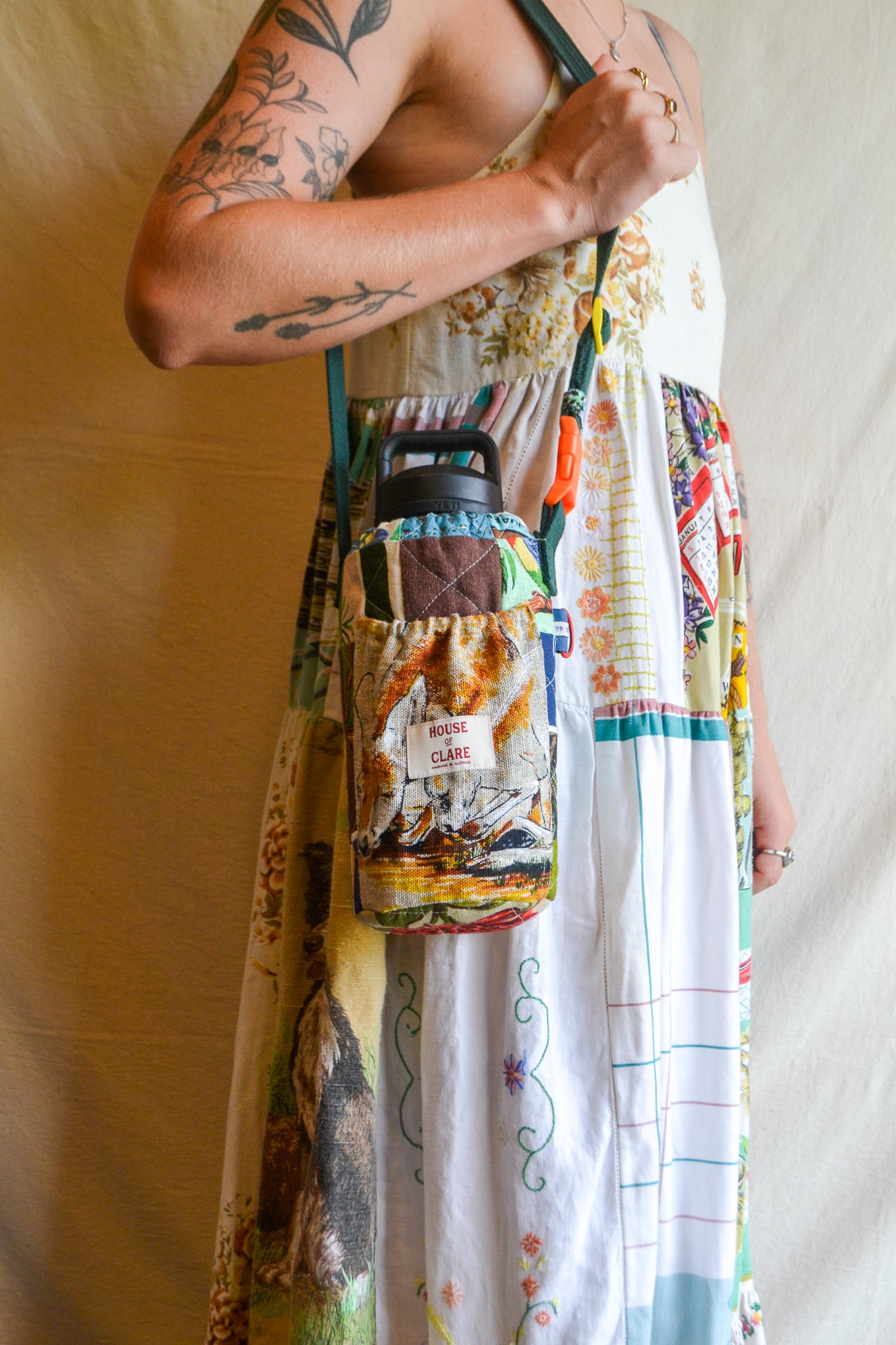 Our one-of-a-kind Water Bottle Carrier, Gumnut, is made from carefully selected cotton and linen scraps, patchworked and quilted together in true House of Clare style. Strong, durable and fully lined, it features an adjustable strap (wear it crossbody or over the shoulder), a front pocket for your phone, and a handy side key loop. Finished with a secure buckle closure and made in Australia from rescued fabrics, practical, thoughtful and built to last.